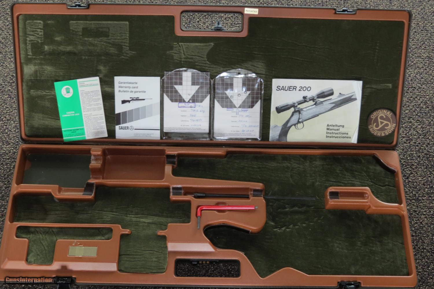 Description: Rare find. Sauer 200 with travel case w/ paper work, factory targets. Factory Set Trigger. Comes with 243 and 308 barrel (308 barrel appears unfired) 2 bolts, 2 magazines, 2 slings, tool for changing barrel and Zeiss Diavari-ZA 2.5-10x52 30mm scope. Whole package is in excellent condition. Shipping w/ insurance $60 SOLD |