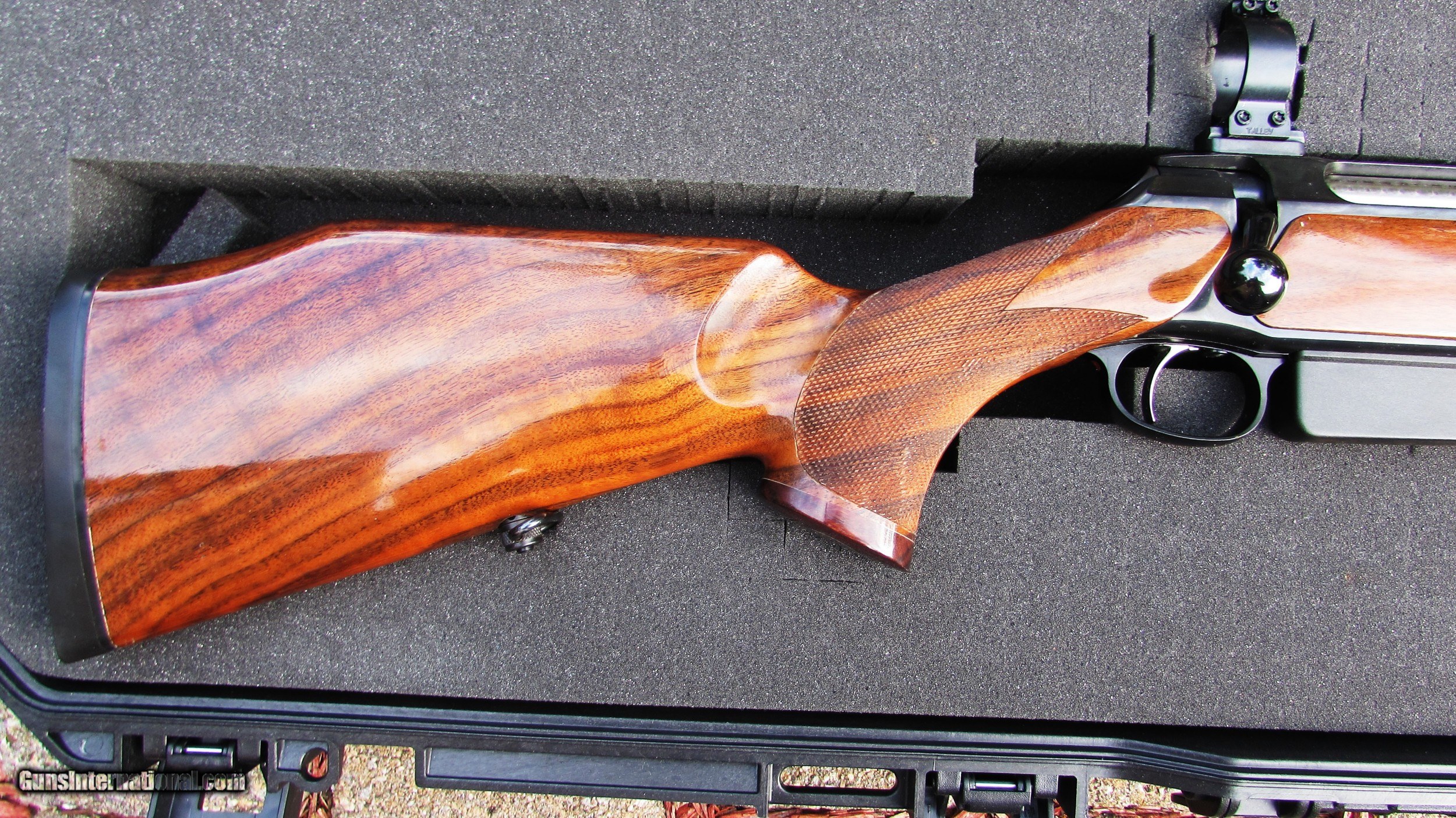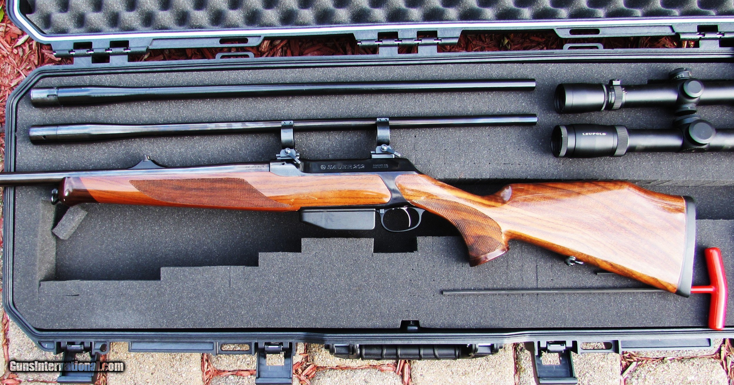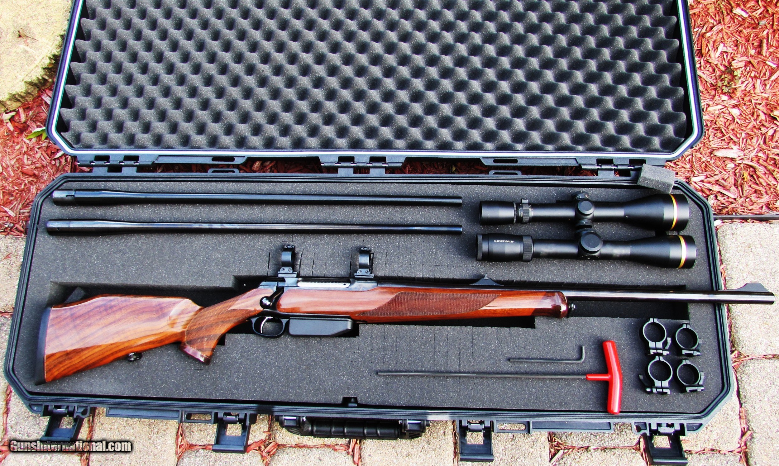 Description: This is a Sauer 202 Supreme Grade rifle in near-perfect condition. I've made it into a travel set, with barrels in 375 H&H, 300 Win Mag, and 7mm Rem Mag. I had the 375 and 7 mag barrel initially, and found a 300 Win Mag that was marked up pretty well. I sent it out to be bead-blasted and Duracoated it when I got it back to better match the deep blue of the original metalwork. The rifle has the extended magazine with makes it 5+1 as I remember. The rifle will come with with the 3 barrels. a set of Talley rings in either 1" or 30mm, screw-on or QD (your choice), an extra set of open sights, plus the takedown and barrel tools, and a cut-to-form travel case with 2 hasps and the padlocks to secure the case. If you wish, I can also add a scope or scopes, extra Talleys, ammunition, etc. This set should cover just about anything you might want to hunt. SOLD |
