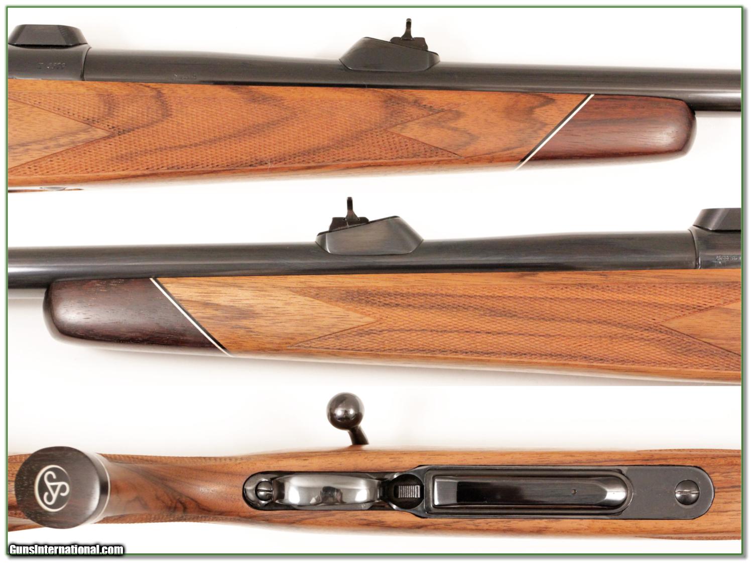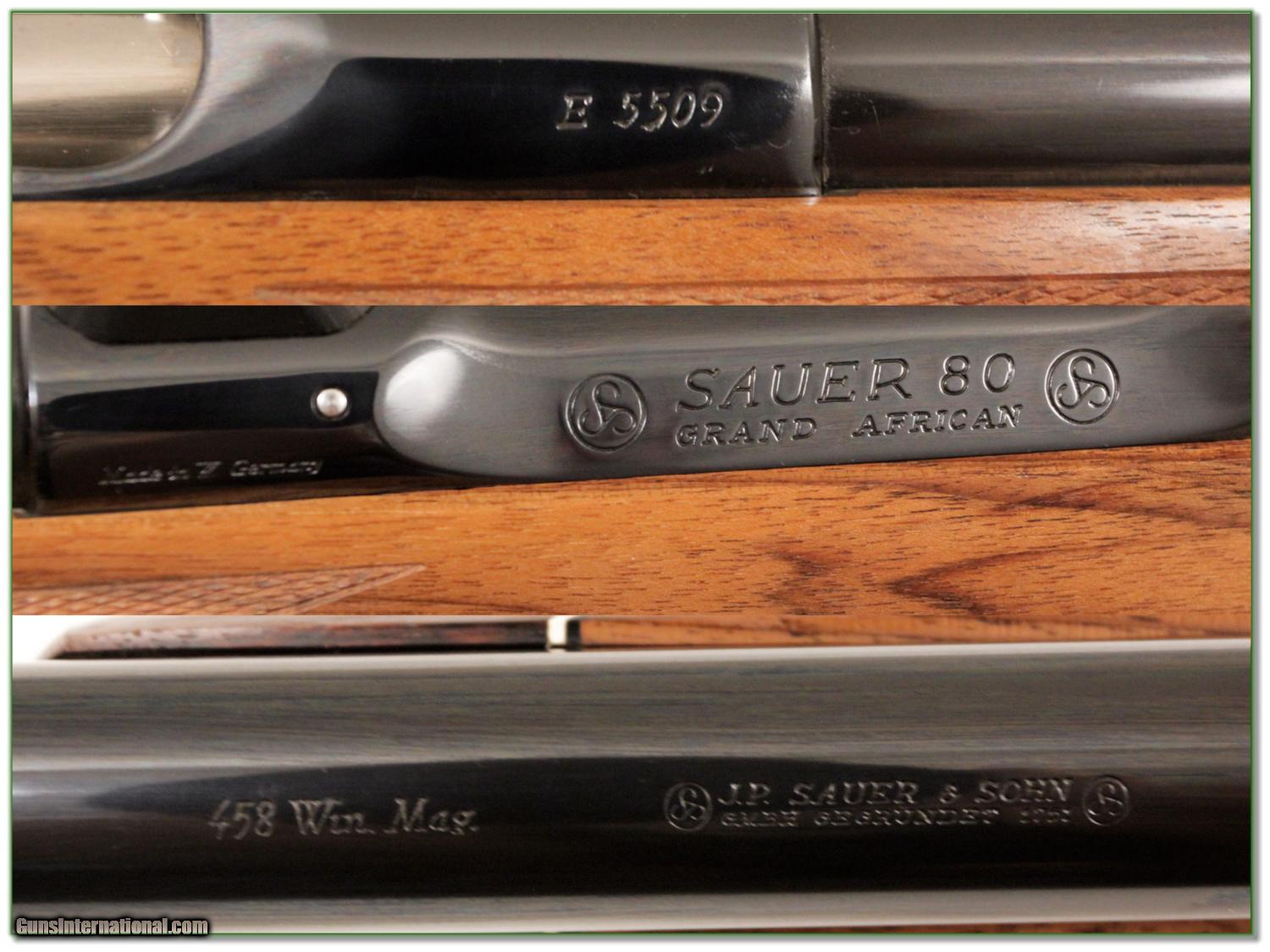 Description: This is an excellent condition Sauer Grand African in 458 Winchester Magnum. It has a beautiful oil finished stock. It comes with factory scope bases as shown. This will make a super high end gun for next African safari or Alaskan bear hunt! I am selling this one on consignment and as such lay-a-way can’t be used. It does of course have the standard 3 day inspection. Shipping and insurance is $30 or $18 more if you want it shipped in a new Plano hard case. Please email me with any questions or larger pictures. (I now consign quality firearms only 10%! Let me know if you have any you would like to sell!) [14-0809] Terms & Conditions Payment: Payment is by Money Order, Cashiers Check or Personal Check. I can now also accept MasterCard and Visa with a 3% convenience fee. PayPal can be used for some items but never firearms. Please let us know if you would like to pay via PayPal. Shipping: The shipping charge will be listed in each description. It is $30 for most guns. Some heavy guns or those insured for over $2000 may be higher. Shipments to Alaska and Hawaii are higher because air shipment is required. Most firearms are shipped within 5 days of receipt of payment. We prefer shipping at the beginning of the week to avoid firearms in transit over weekends. We package all shipments carefully and insure them for the full purchase price, rounded up to the next $100. In the unlikely event that damage occurs, it is important that you save all packaging material for the claims process. Optics are shipped Priority Mail and most other non-firearm shipments are shipped First Class. Returns: Our return policy is simple. If for any reason you are not pleased with your purchase, you may return your item for a refund. The only exception is ammunition, it cannot be returned. It is important to us that you are happy. Guns cannot be fired or dissembled before returning them and must be returned in the same condition as received. Notification of a return must occur with-in 3 days of receipt at your dealer. Shipping, convenience and dealer fees are not refundable and are the responsibility of the buyer. Lay-a-way: If needed, we offer a 60 day lay-a-way option on most firearms. It is 1/3 now, 1/3 in 30 days and 1/3 in 60 days. Lay-a-way firearm sales are final. Consigning your firearms with Shooting Investments: We will help you get top dollar for your firearms. While most local guns shops charge 20% or more, our fee is only 10% with a minimum of $50. At your local gun shop it might take months to sell. Selling on-line provides instant access to thousands of interested buyers. You won’t find any other on-line dealer willing to sell your firearms for only 10% or listing every gun on 4 separate s. Selling through an House typically costs 15% and you have to wait several months to sell and longer to receive funds. If properly priced, we will sell your firearms in a week or two. Send us an email or give us a call and we’ll explain how easy it is for you to get top dollar. Trading: We collect guns and usually just trade for guns we want to add to our collections. We often sell guns for others wanting to purchase one of ours. We find this the most fair to both of us. Our Commission is only 10% and we hold the gun you want until yours sells. Please contact us if you want to sell one of yours to buy one of ours. Help for California Buyers: We are happy to ship to California. It is the buyer’s responsibility to make sure any item you buy is legal in your state. We are also happy to help with your purchase of a firearm from someone other than us. If you see a gun you would like to buy but the seller can’t or won’t ship to California we can help. You buy the gun and have it shipped to us. We’ll then ship it to your California dealer. The cost for this service is only $30 + shipping. Let me know if we can help! SOLD |
