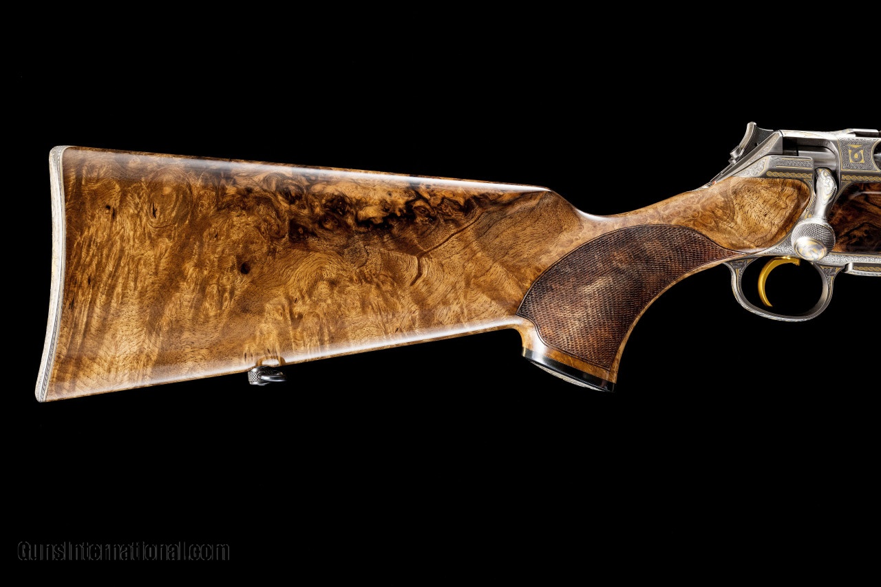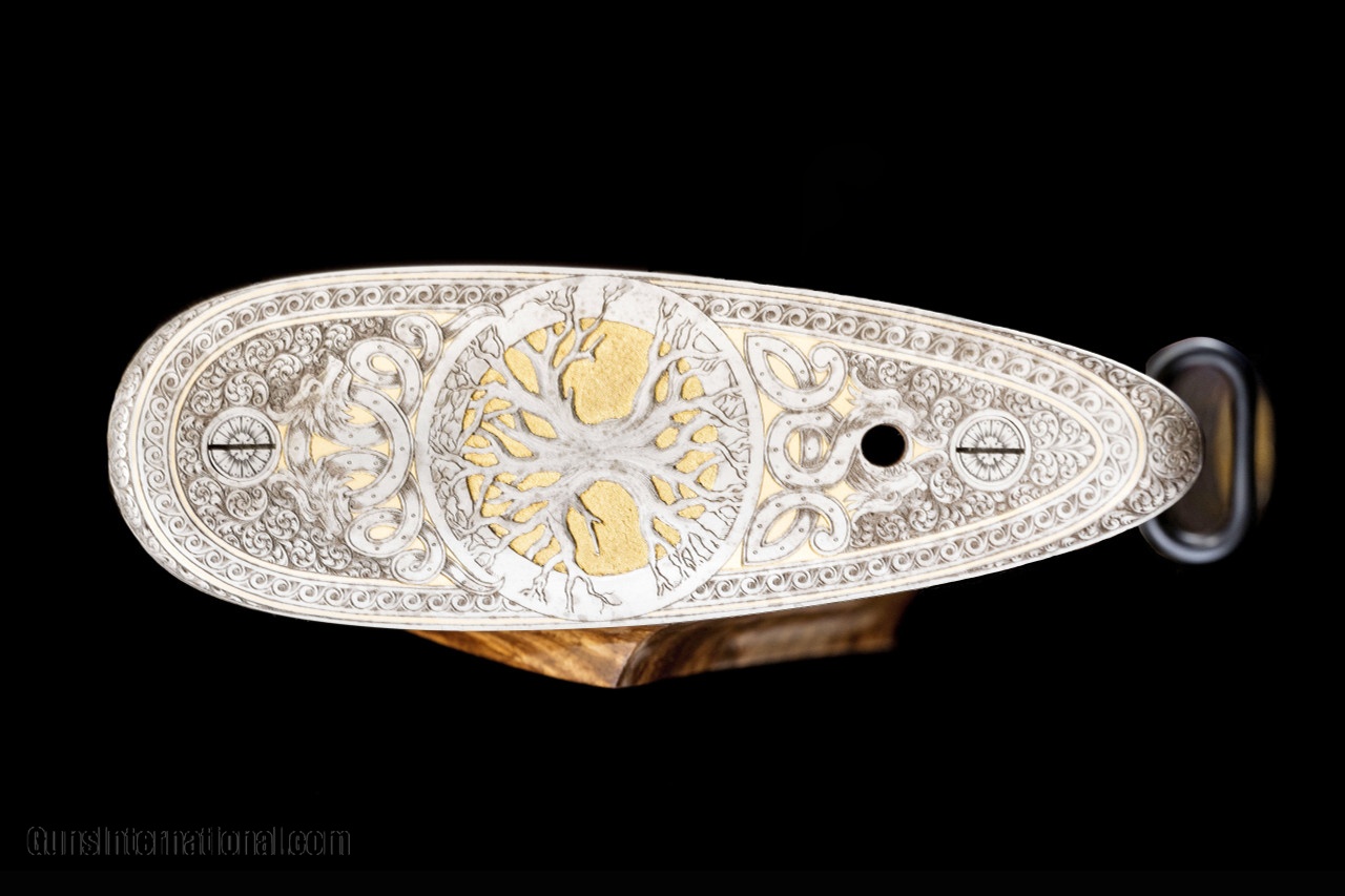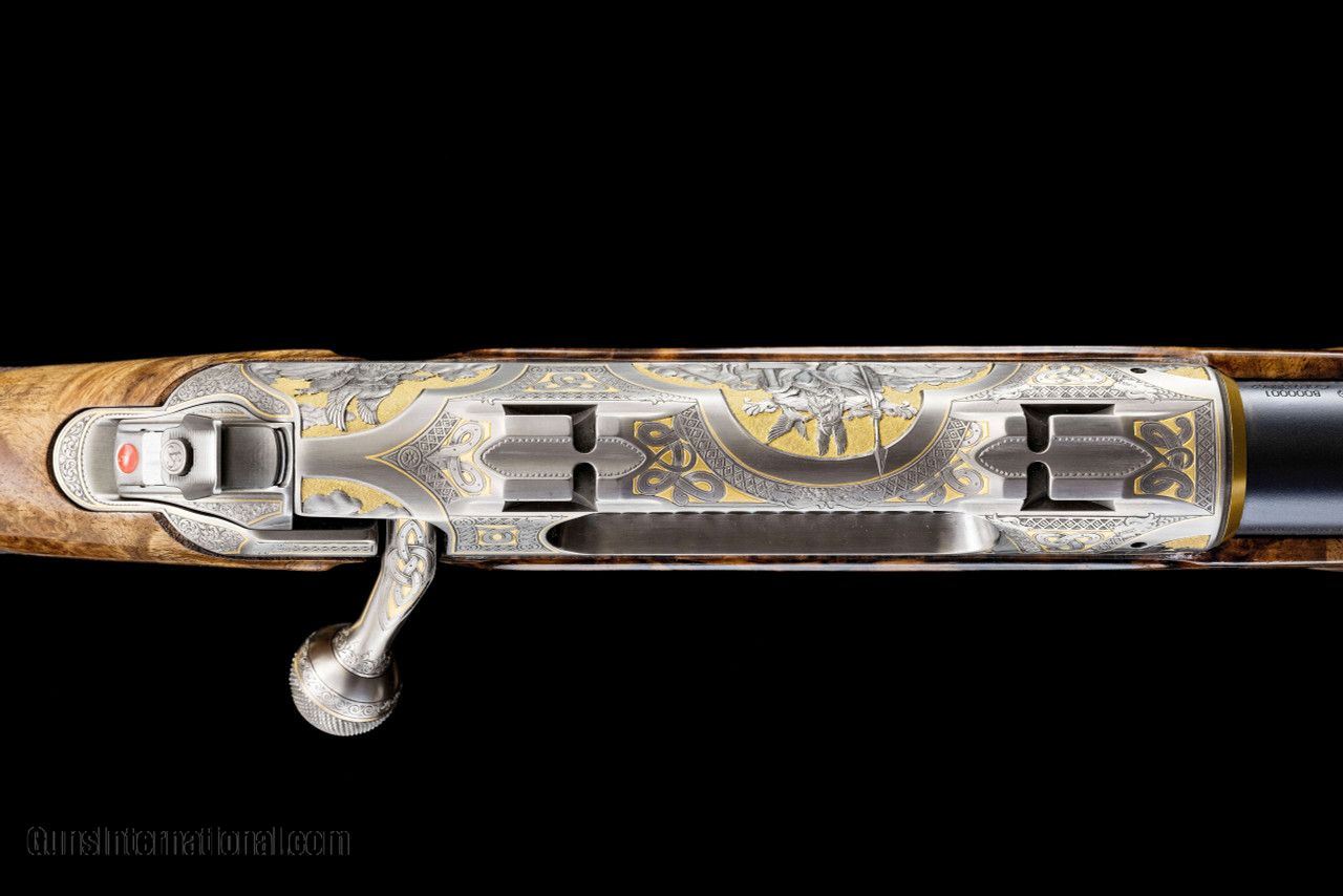 Description: This is the very first Sauer 404 ever produced the serial number on the barrel is #1. The gun features amazing engraving depicting the Norweigan folklore of Thor and Oden and done with a 24kt gold background. the true aficionado a timelessly beautiful bolt-action rifle of technical and artistic perfection.PREMIUM COMES STANDARDCERGO LUX stock in Grade 11 figured walnutAviation-grade high-alloy aluminum receiverPerfectly placed ergonomic manual cocking slide on the bolt shroudEasily replaceable bolt head makes switching from Standard to Magnum calibers a snapTwin ejectors for a precisely perpendicular ejection pattern6-lug bolt locks directly into the barrelJeweled bolt bodySAUER Quattro trigger with choice of four trigger pull weights: 550 g (1.2 lbs), 750 g (1.7 lbs), 1000 g (2.2 lbs) and 1250 g (2.7 lbs)Infinitely adjustable trigger blade with 8 mm (0.3 in) adjustment range for length of pull and a left-to-right swivel range of 5 degreesSAUER Universal Mount (SUM) integral to with receiver for an extremely low build heightSAUER universal key (SUS) integrated into the front sling swivel for forend and buttstock removal, barrel removal or replacement, and selection of trigger pull weightMagLock magazine safety SOLD Manufacturer: J.P. Sauer and Sohn Caliber Info: 9.3x62 Barrels: 22 Action: Bolt Triggers: Single Gauge Info: 9.3x62 Stock Comb: N/A Stock Heel: N/A Stock Cast: N/A LOP: 14-3/16 Rib: N/A Weight: 8.3 |