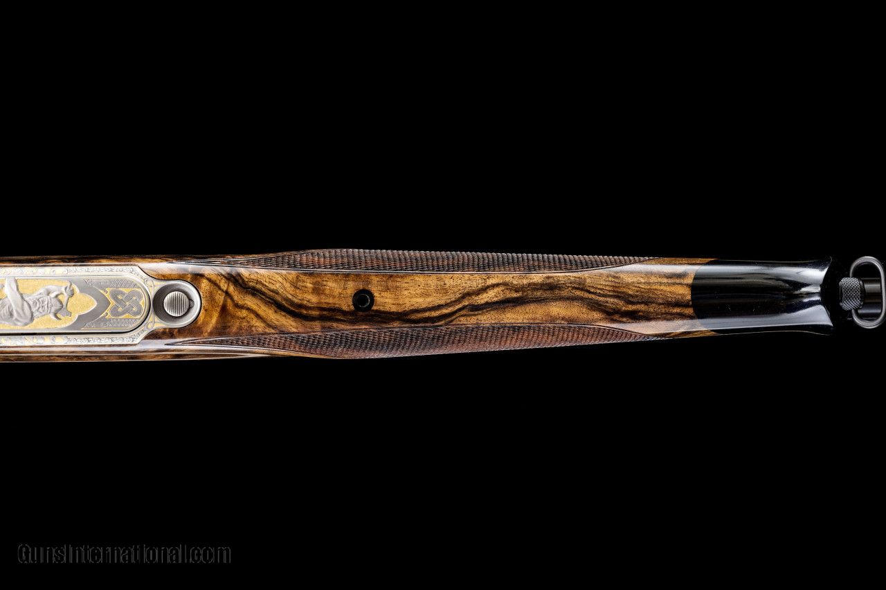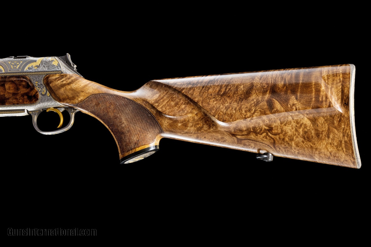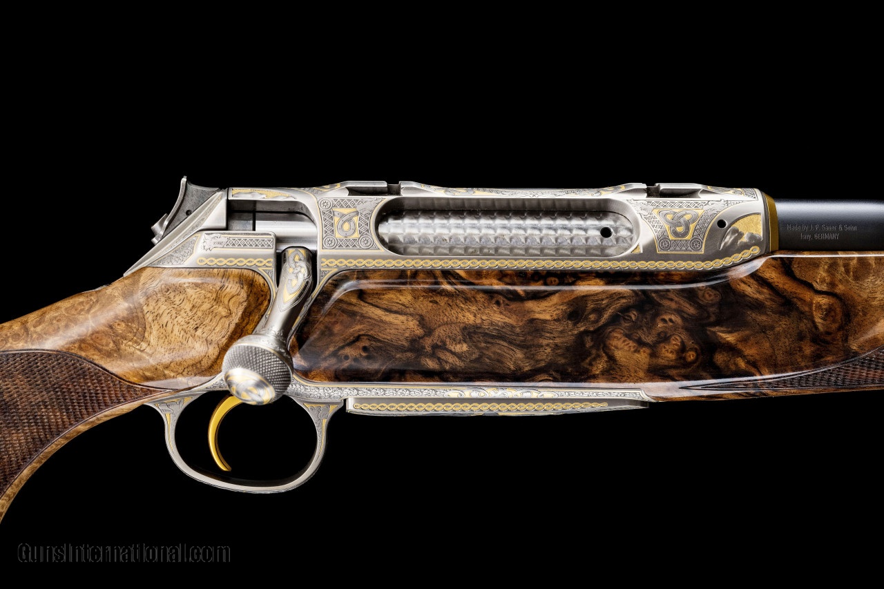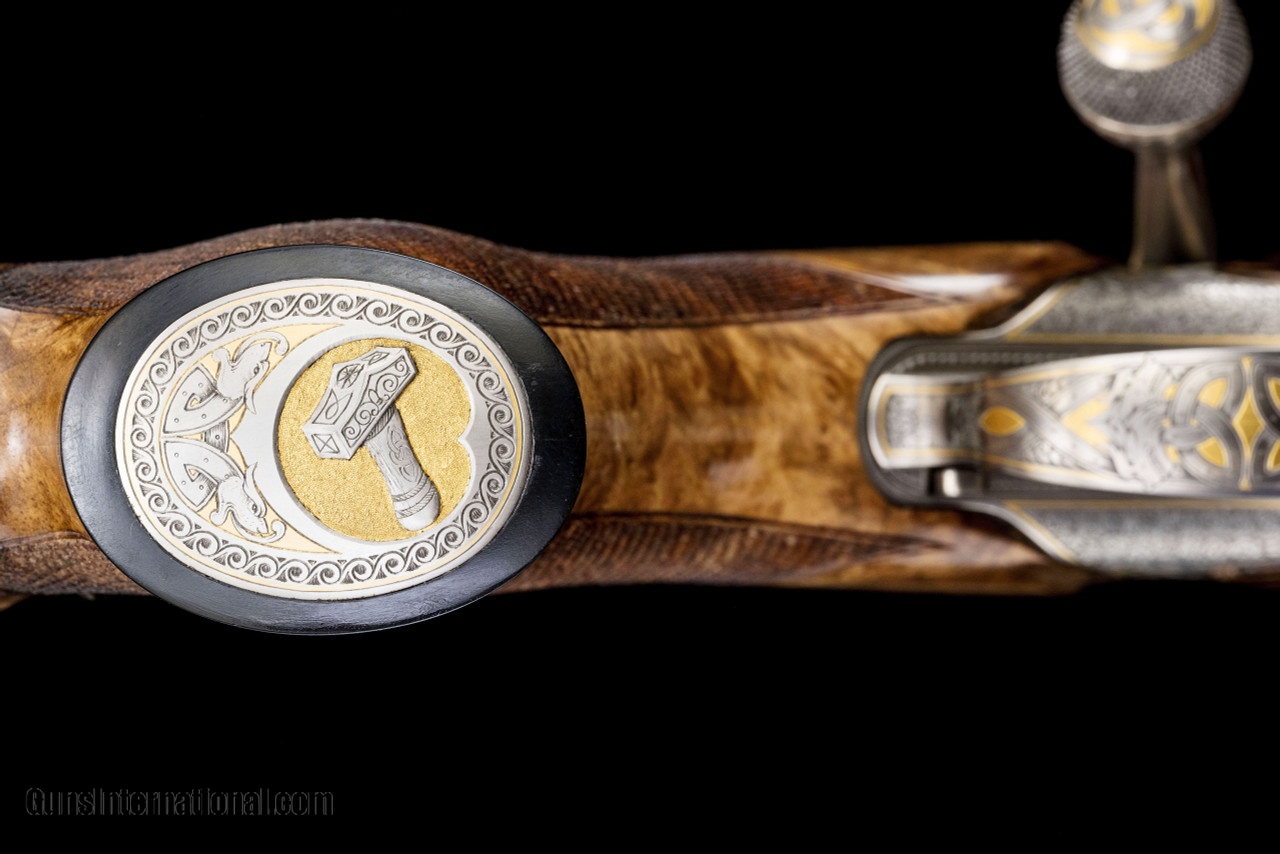 Description: This is the very first Sauer 404 ever produced the serial number on the barrel is #1. The gun features amazing engraving depicting the Norweigan folklore of Thor and Oden and done with a 24kt gold background. the true aficionado a timelessly beautiful bolt-action rifle of technical and artistic perfection.PREMIUM COMES STANDARDCERGO LUX stock in Grade 11 figured walnutAviation-grade high-alloy aluminum receiverPerfectly placed ergonomic manual cocking slide on the bolt shroudEasily replaceable bolt head makes switching from Standard to Magnum calibers a snapTwin ejectors for a precisely perpendicular ejection pattern6-lug bolt locks directly into the barrelJeweled bolt bodySAUER Quattro trigger with choice of four trigger pull weights: 550 g (1.2 lbs), 750 g (1.7 lbs), 1000 g (2.2 lbs) and 1250 g (2.7 lbs)Infinitely adjustable trigger blade with 8 mm (0.3 in) adjustment range for length of pull and a left-to-right swivel range of 5 degreesSAUER Universal Mount (SUM) integral to with receiver for an extremely low build heightSAUER universal key (SUS) integrated into the front sling swivel for forend and buttstock removal, barrel removal or replacement, and selection of trigger pull weightMagLock magazine safety SOLD Manufacturer: J.P. Sauer and Sohn Caliber Info: 9.3x62 Barrels: 22 Action: Bolt Triggers: Single Gauge Info: 9.3x62 Stock Comb: N/A Stock Heel: N/A Stock Cast: N/A LOP: 14-3/16 Rib: N/A Weight: 8.3 |