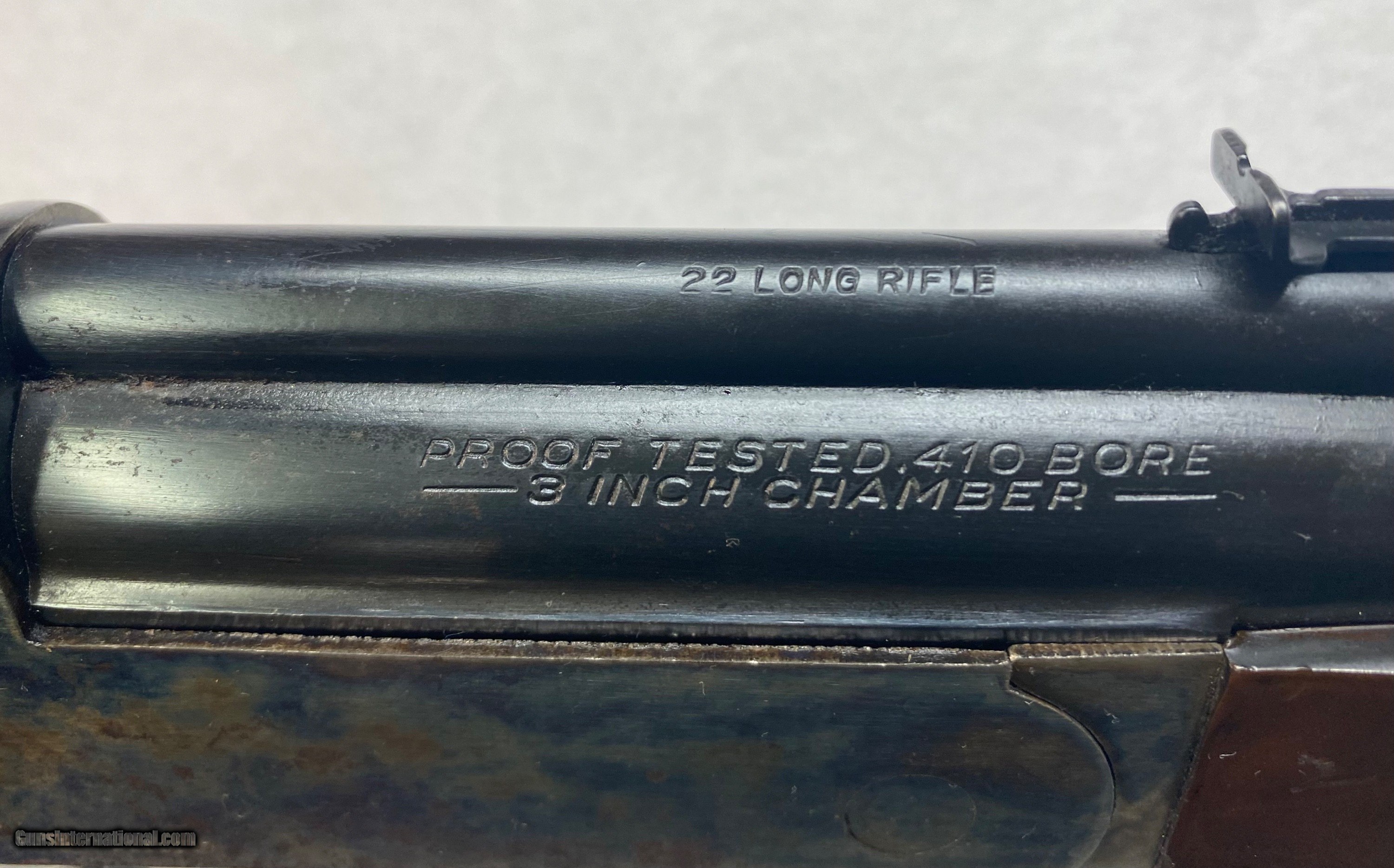 Description: Here's an old school combination shotgun/rifle in .22LR and .410 ga. w/a 3" chamber & 24" barrel. Eligible for pick up with a Curio & Relic license. This particular item has no serial number, so it's probably made back in the 50s sometime, perhaps even earlier. Has speckles of patina throughout, but very small. About 75% of the finish remains. Button on the right side of the receiver controls which barrel fires. Down for the .410, and up for the .22. (Please see pics for example of button position and overall view of the firearm) Here's a chance to own a vintage firearm that shoots two different types of ammo. $649 plus $50 for shipping. Major credit cards accepted with a 4% fee. Personal checks are also welcome (no fee added) however, we do not ship the item until your check clears our bank. Business hours are Tuesday through Saturday, 9 AM to 5 PM. Closed on Sunday and Monday as well as some federal holidays. We are a brick and mortar store in business at the same location for more than two decades. If you're ever in the Waynesboro, PA area, stop on by and see our extensive selection of vintage and modern firearms plus accessories at George Herold's Gun Shoppe. We look forward to seeing you! SOLD Curio/Relic: Yes Rifle Caliber: .22 Long Rifle, .22 Long Shotgun Gauge: .410 Gauge Manufacturer: Savage Arms Model: 22/410 Serial Number: None Barrel Length: 24” Condition: Very good for its age. |