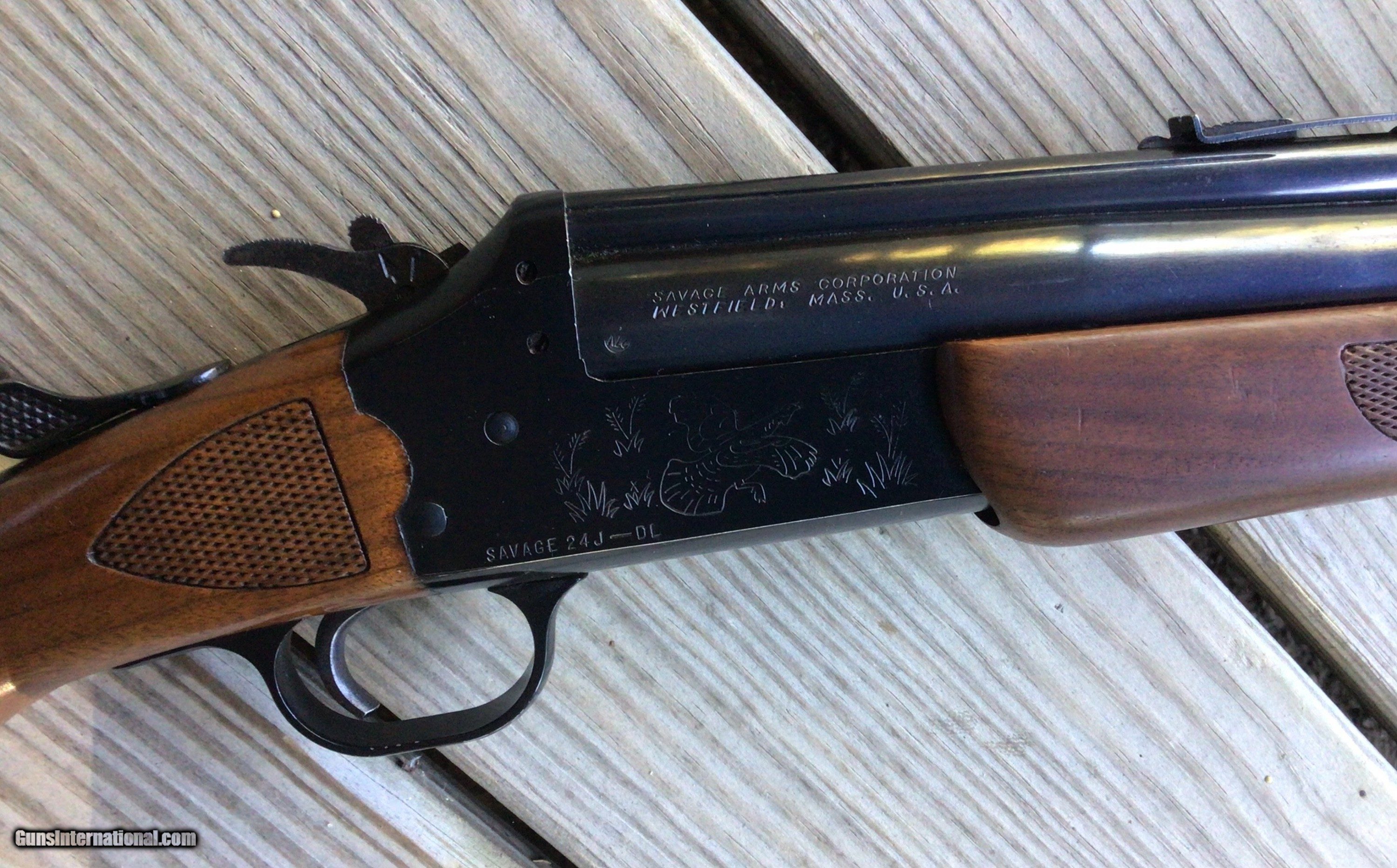 SAVAGE 24 DLX., 22 LR. OVER 20 GA., BLUE ENGRAVED RECEIVER WITH RED FOX ON ONE SIDE & GROUSE IN FLIGHT ON THE OTHER SIDE
