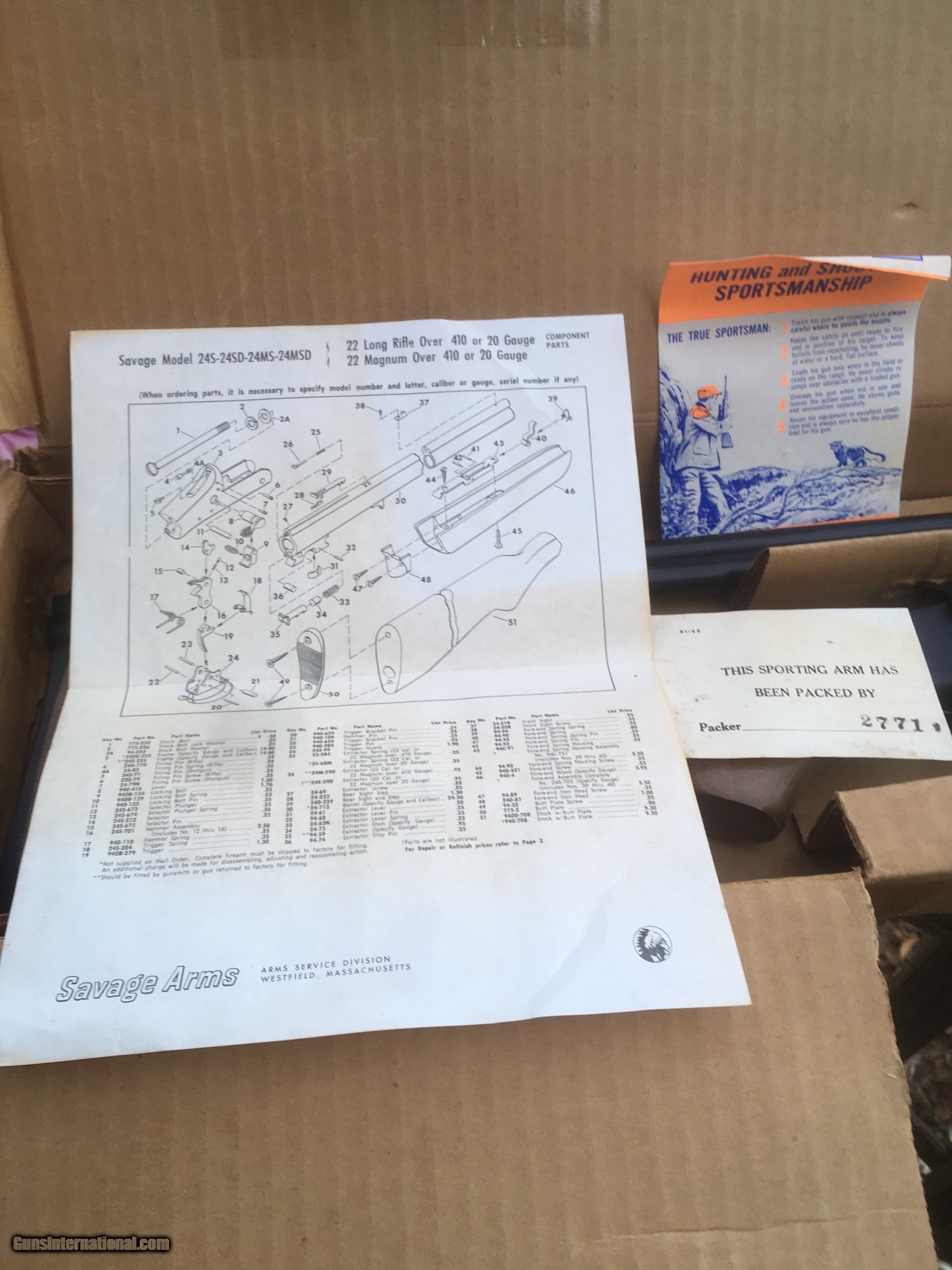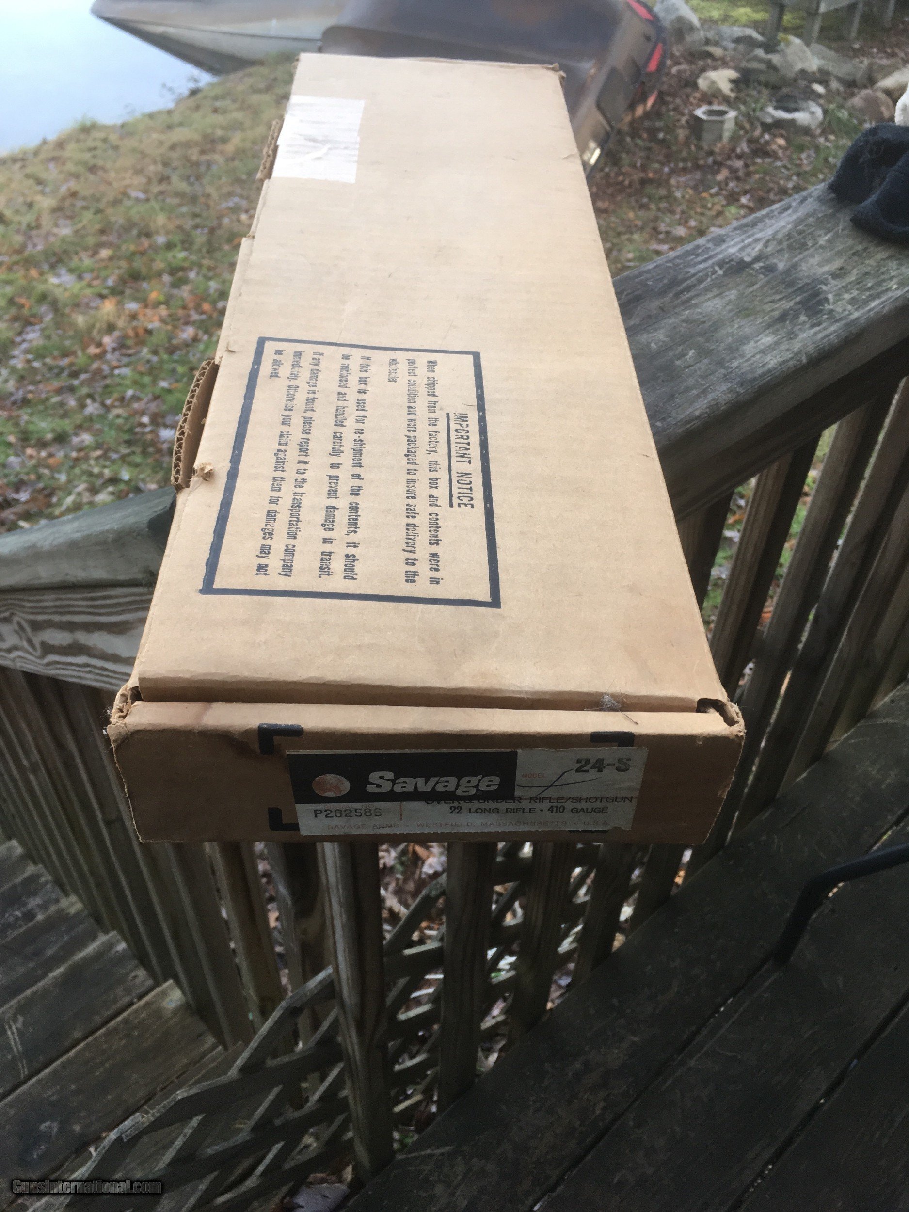Description: Here is a very nice Savage Model 24 - S with the original Factory serial numbered box. The weapon has been fired. The metal is excellent. The bores are excellent. The wood is excellent, a couple of small handling marks. The box and factory paperwork are excellent as well. Please ask questions prior to purchasing. Make sure that your FFL Dealer will accept this weapon from a NON FFL DEALER. Cashiers check will be the method of payment. SOLD |