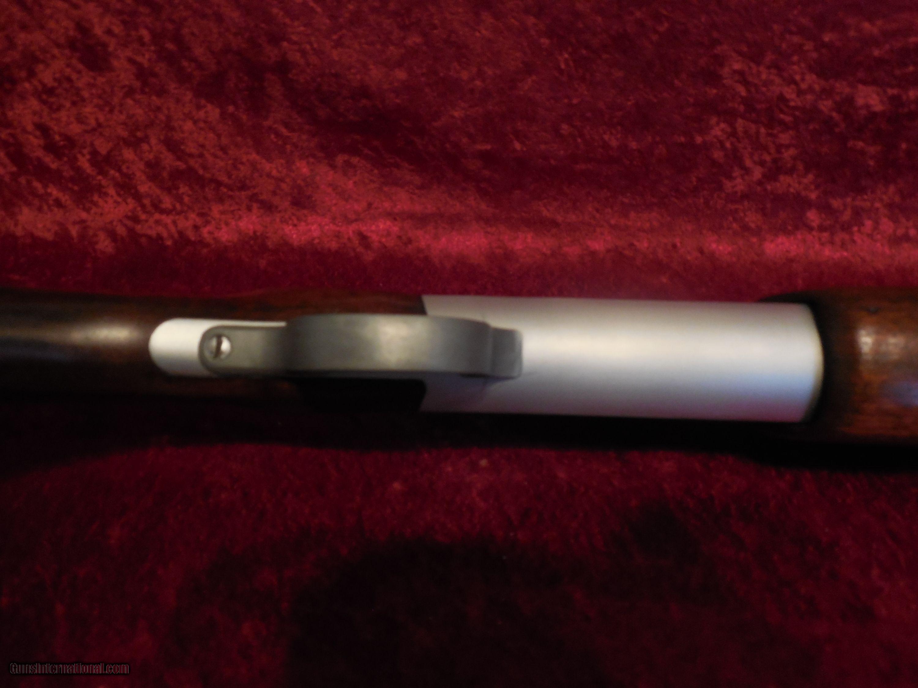 Description: Savage Model 24H-DL Combo 20 ga/.22 wmr Silver Receiver.--SOLD Satin Nickel Receiver with Gold trigger Here is a used Savage Model 24H-DL Combo shotgun/rifle in 20 ga. (3" chamber)/.22 wmr, deluxe checkered wood stock, 24" barrel, Metal is in very good condition with light handling marks on the receiver, Wood is free of cracks and shows light handling marks from use. Small dings in the bottom of forearm and left side of forearm. Please see pictures. Fixed Mod. choke.