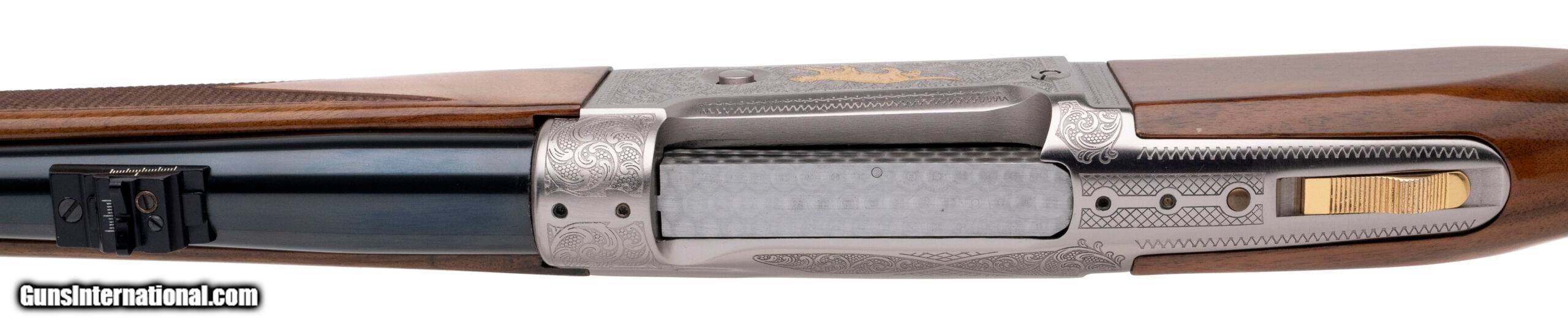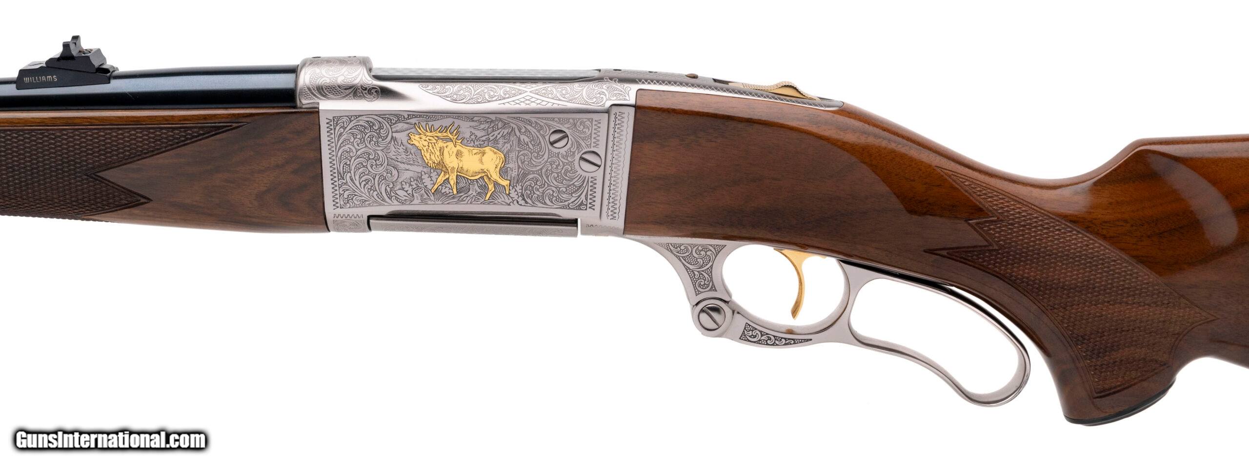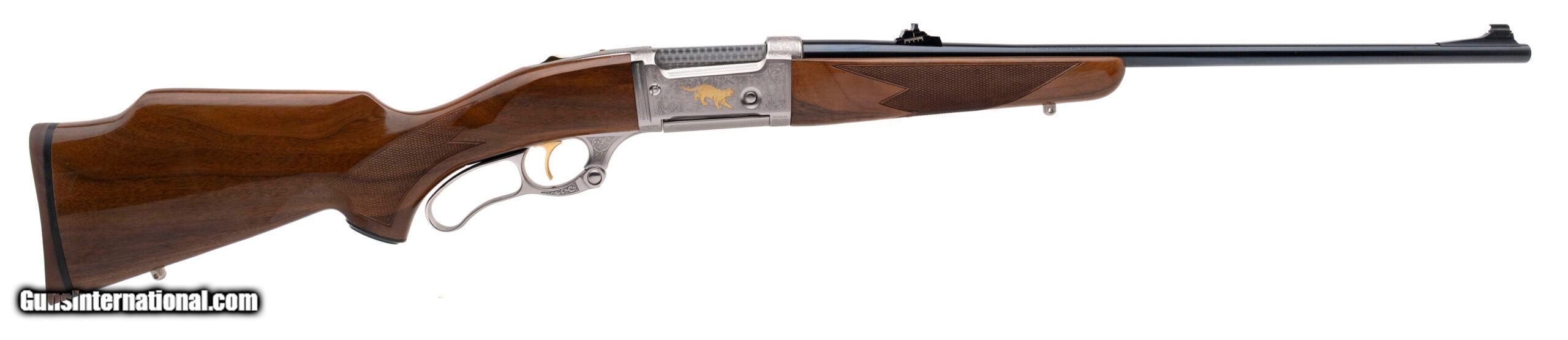 Description: "SN: AS0185 built in 1995, 1 of a limited run of 1000 rifles. Lever action rifle with a 22" round barrel chambered in 300 Savage with iron sights and receiver tapped to accept scope bases. Engraved coin finish receiver with gold game scenes and deluxe checkered walnut furniture, monte carlo stock with a medallion grip cap, high gloss finish and factory recoil pad. Overall in excellent condition. Price: $3,495.00 Contact Seller |