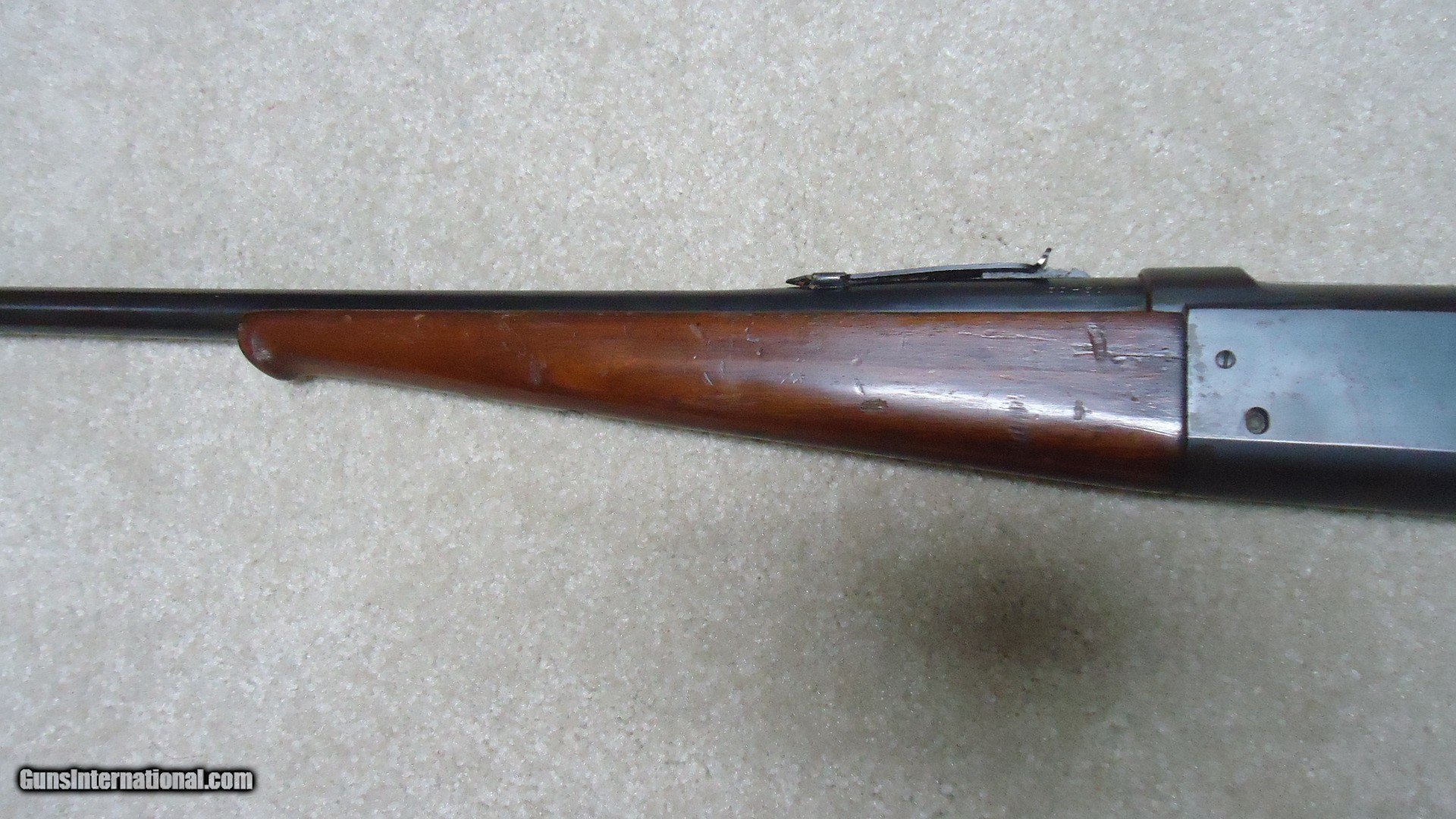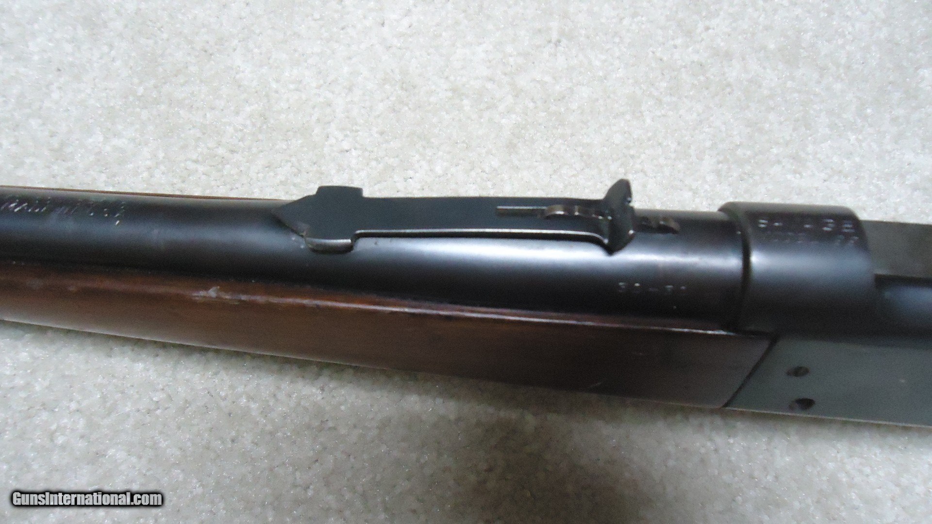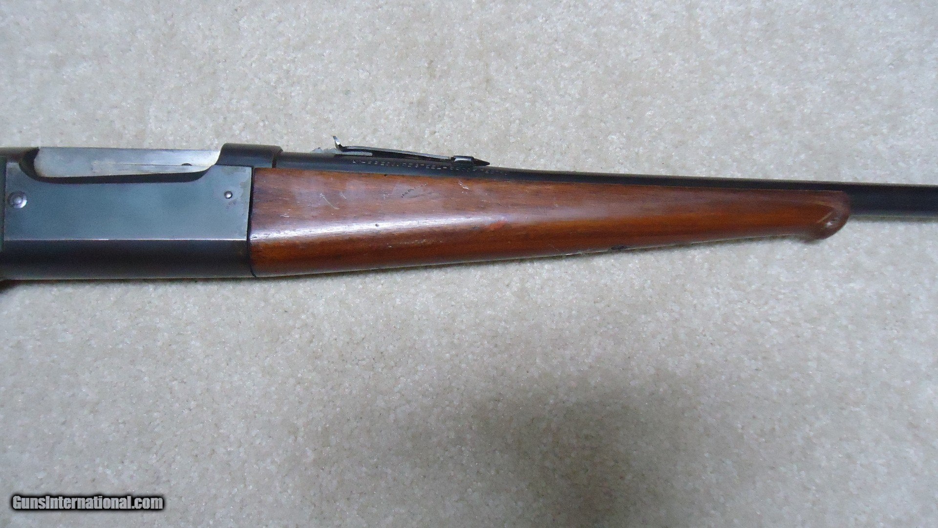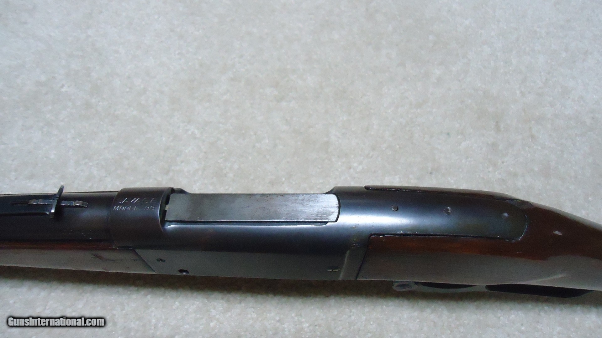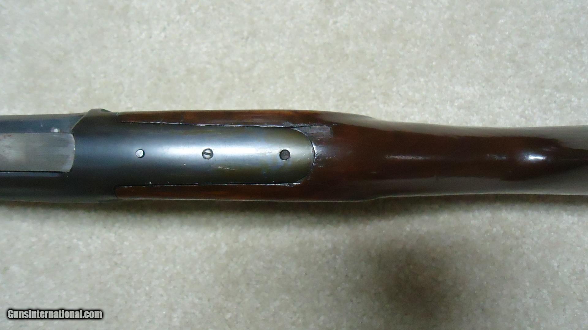 Description: GREAT DEPRESSION ERA SAVAGE MODEL 99 IN DESIRABLE .30-30 CALIBER WITH STRAIGHT STOCK, CRESCENT BUTT PLATE AND CORRECT 24" BARREL, #325XXX, MADE 1930. An attractive example that still retains about all the blue on the receiver that is a little dulled from age, but all there. Also shows some light case color on the lever. Fine barrel blue, that also shows a little age with exc. markings, buckhorn rear sight with correct blade/bead front sight in ramp. Fine forend and butt stock with one very small chip and short hairline crack at the upper tang- typical as the stock is secured to the receiver with a long cross bolt under the butt plate that is tightened at the factory. Normal temperature and humidity changes cause the wood to swell/shrink and eventually these chips and cracks form on almost all M-99s. No extra holes, tight action and bright excellent bore. Some stock finish was added as a preservative at some time without sanding or refinishing etc. which comes off very easily with #0000 steel wool. Has the brass rotor magazine with little window on the left side of the receiver with brass cartridge counter. This one must have been in storage for a long time as it still shows dried grease on the top of the butt plate etc. Good, solid example from a hard time in U.S. history. SOLD Rifle Caliber: .30-30 Winchester Manufacturer: SAVAGE Model: MOD. 99 Serial Number: 325XXX Barrel Length: 24 Condition: FINE+ Bore Condition: EXCELLENT |