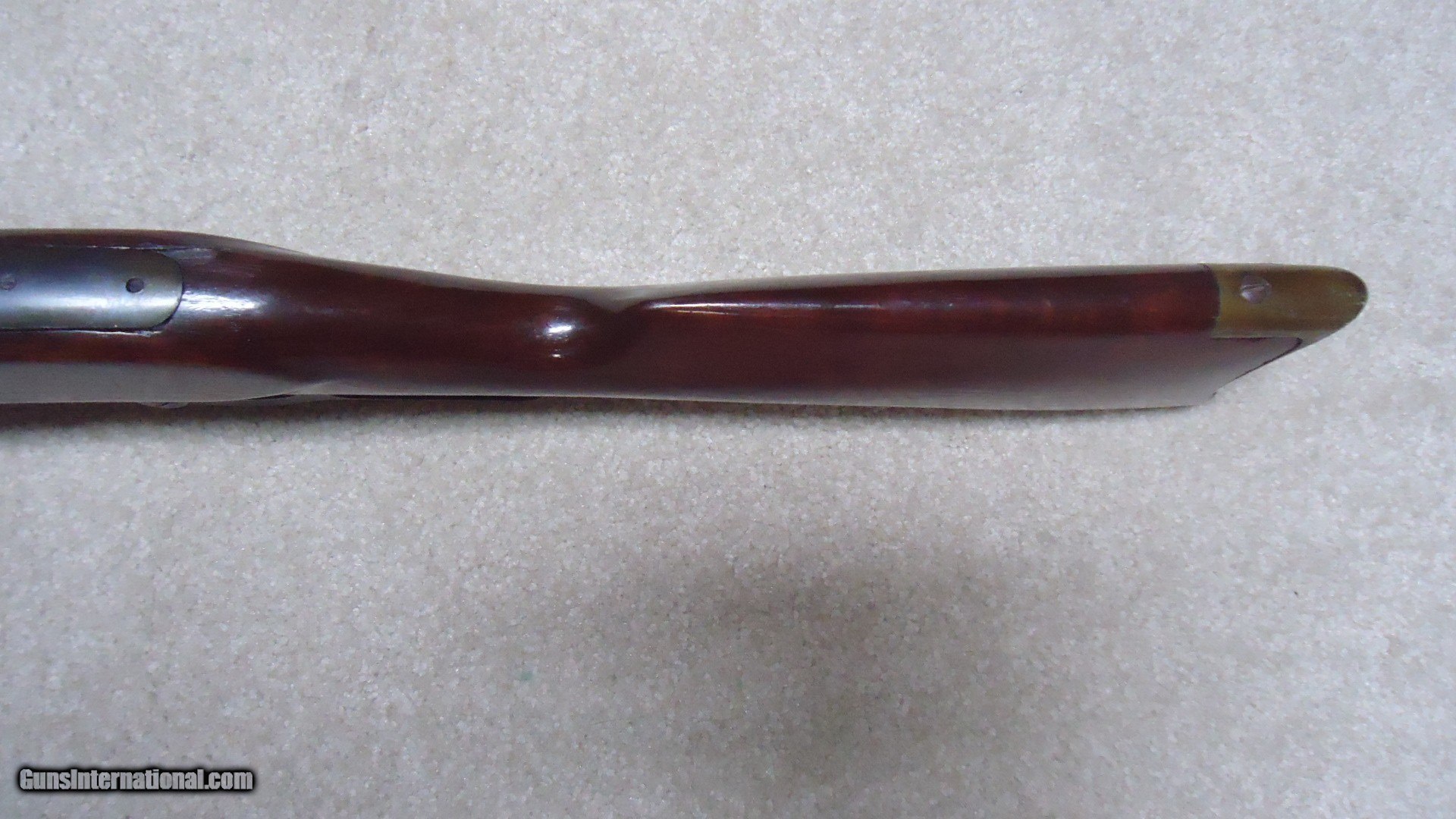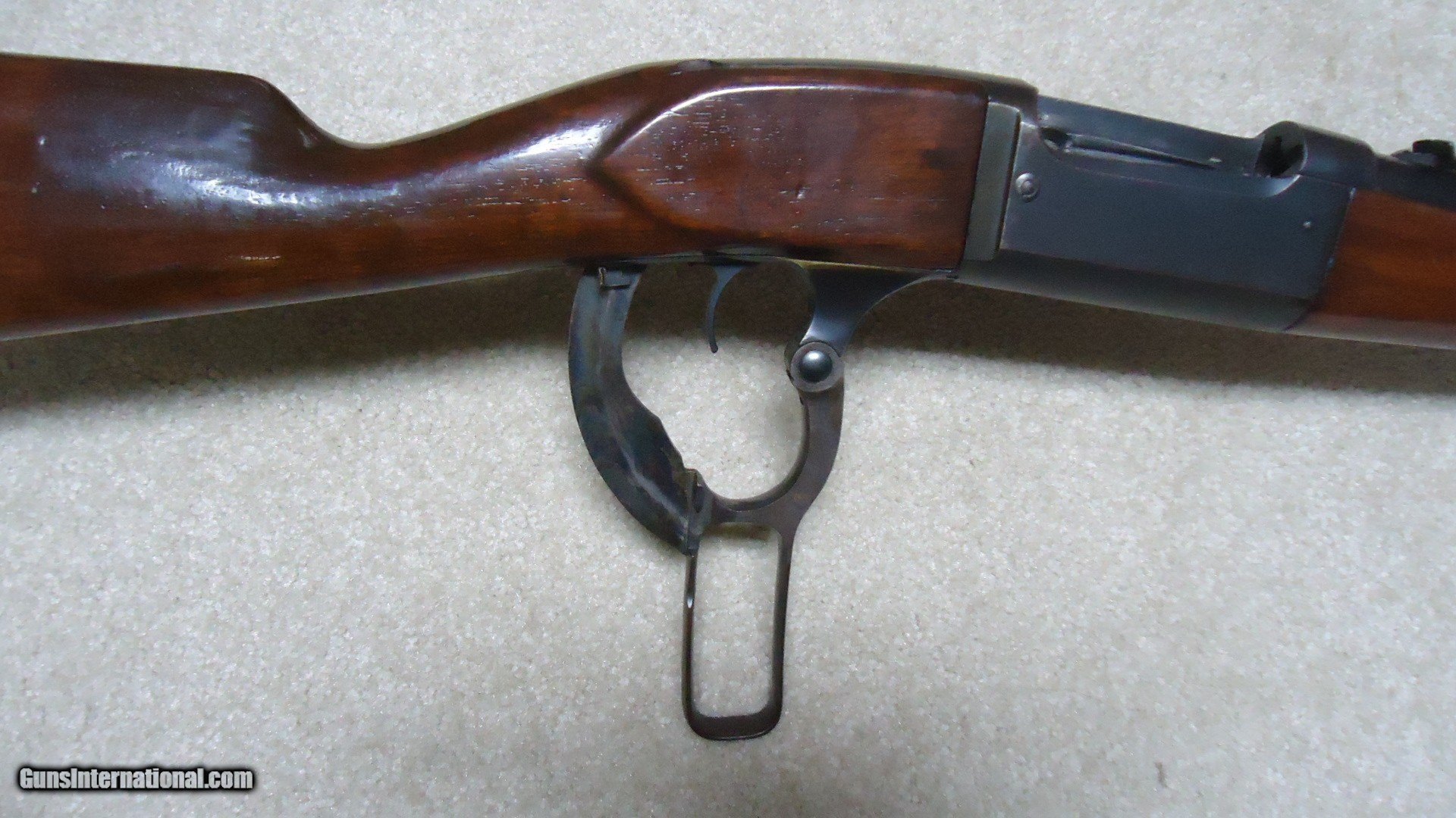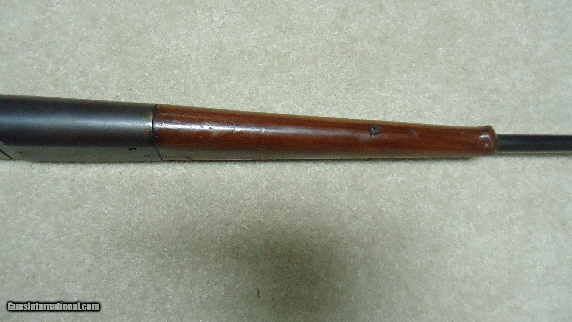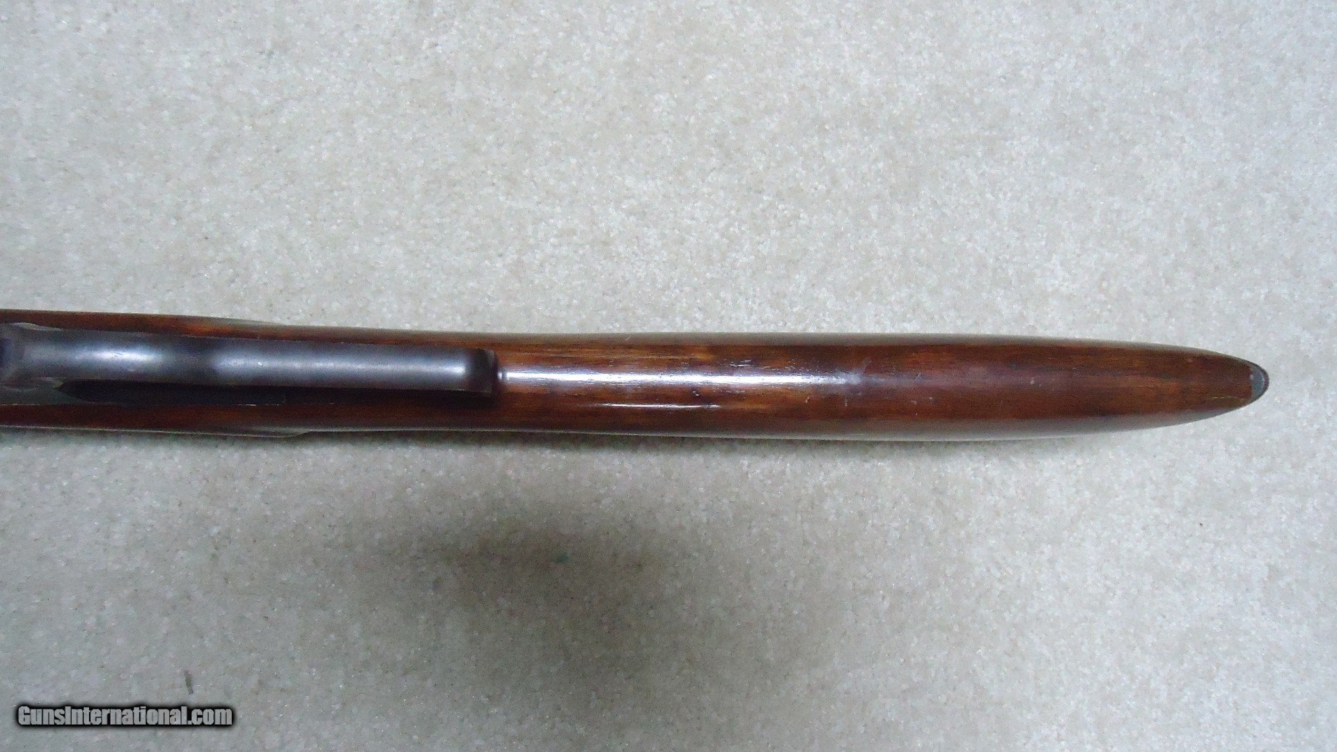 Description: GREAT DEPRESSION ERA SAVAGE MODEL 99 IN DESIRABLE .30-30 CALIBER WITH STRAIGHT STOCK, CRESCENT BUTT PLATE AND CORRECT 24" BARREL, #325XXX, MADE 1930. An attractive example that still retains about all the blue on the receiver that is a little dulled from age, but all there. Also shows some light case color on the lever. Fine barrel blue, that also shows a little age with exc. markings, buckhorn rear sight with correct blade/bead front sight in ramp. Fine forend and butt stock with one very small chip and short hairline crack at the upper tang- typical as the stock is secured to the receiver with a long cross bolt under the butt plate that is tightened at the factory. Normal temperature and humidity changes cause the wood to swell/shrink and eventually these chips and cracks form on almost all M-99s. No extra holes, tight action and bright excellent bore. Some stock finish was added as a preservative at some time without sanding or refinishing etc. which comes off very easily with #0000 steel wool. Has the brass rotor magazine with little window on the left side of the receiver with brass cartridge counter. This one must have been in storage for a long time as it still shows dried grease on the top of the butt plate etc. Good, solid example from a hard time in U.S. history. SOLD Rifle Caliber: .30-30 Winchester Manufacturer: SAVAGE Model: MOD. 99 Serial Number: 325XXX Barrel Length: 24 Condition: FINE+ Bore Condition: EXCELLENT |