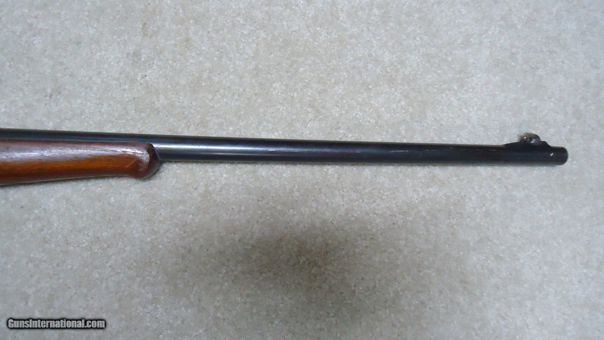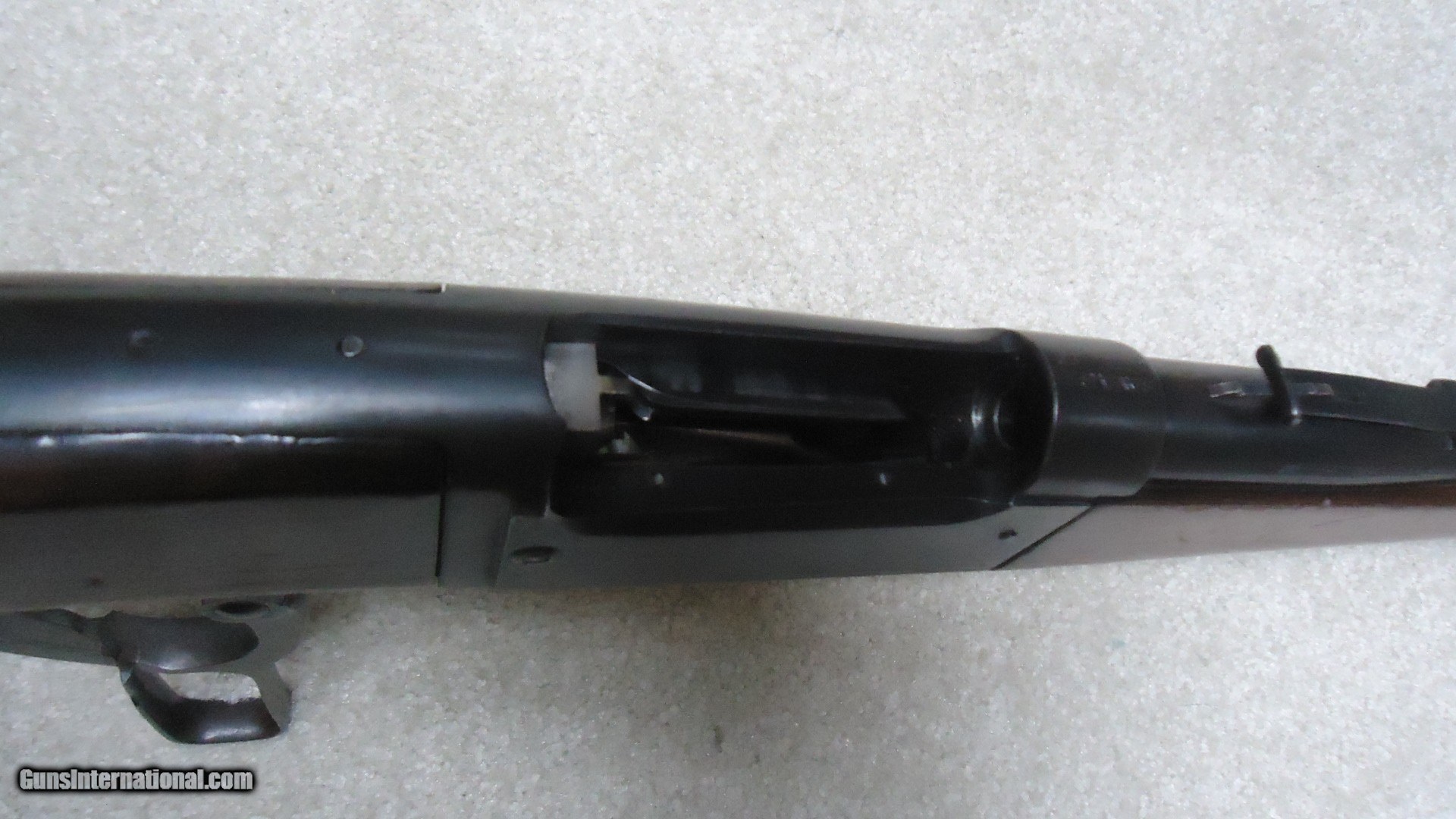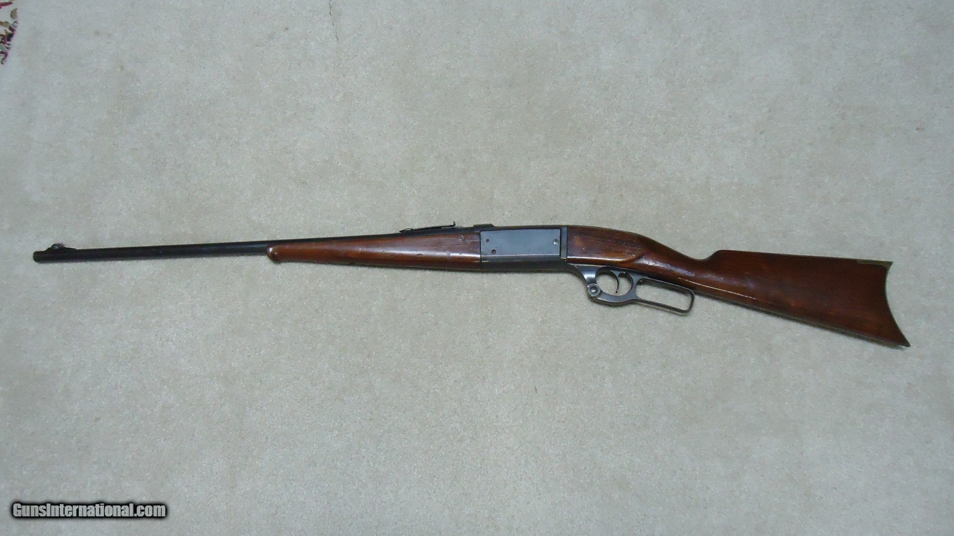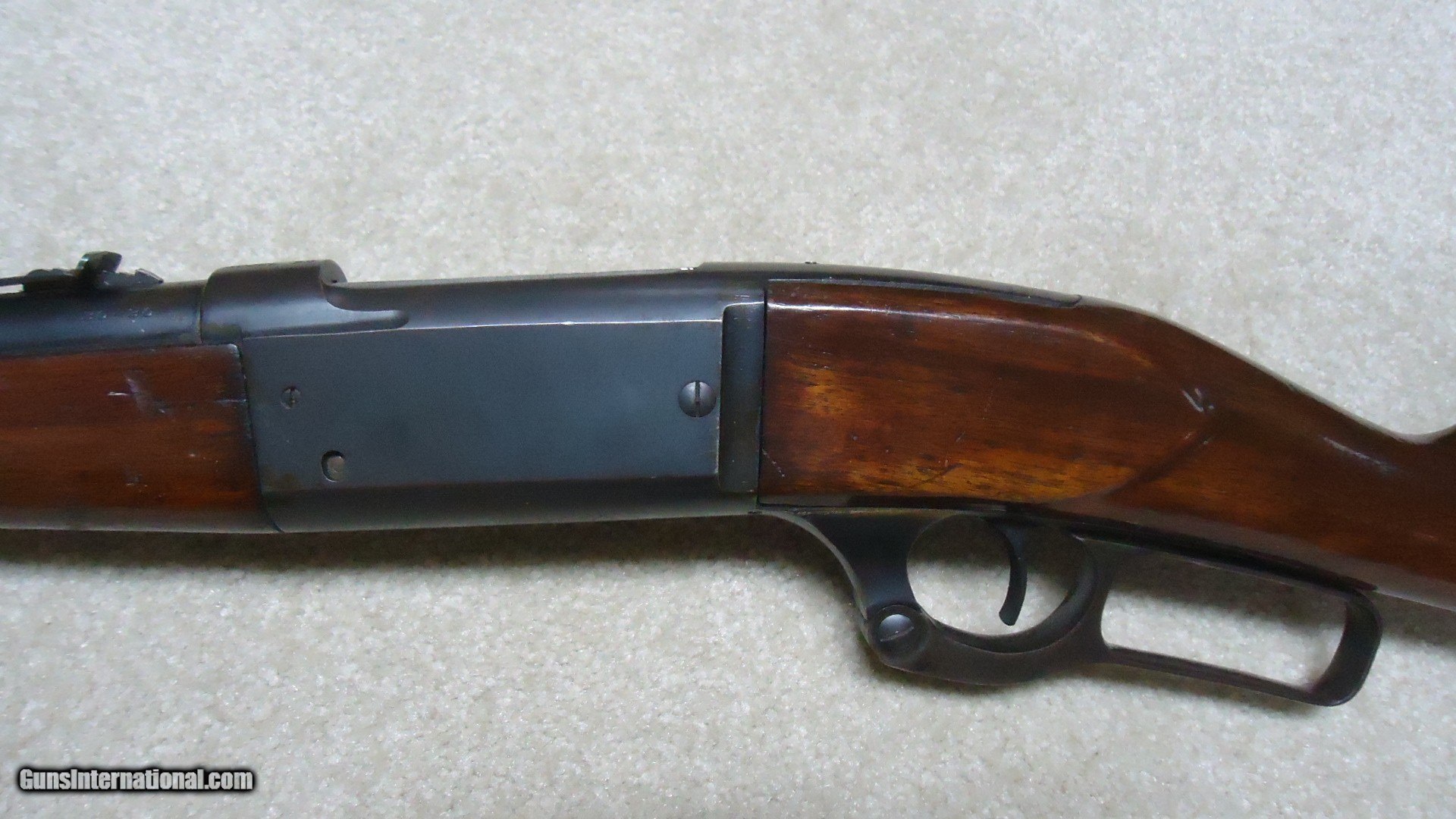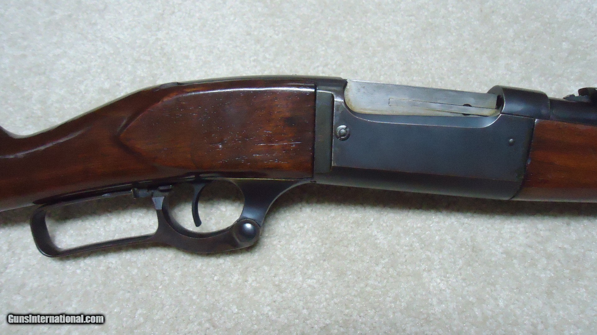 Description: GREAT DEPRESSION ERA SAVAGE MODEL 99 IN DESIRABLE .30-30 CALIBER WITH STRAIGHT STOCK, CRESCENT BUTT PLATE AND CORRECT 24" BARREL, #325XXX, MADE 1930. An attractive example that still retains about all the blue on the receiver that is a little dulled from age, but all there. Also shows some light case color on the lever. Fine barrel blue, that also shows a little age with exc. markings, buckhorn rear sight with correct blade/bead front sight in ramp. Fine forend and butt stock with one very small chip and short hairline crack at the upper tang- typical as the stock is secured to the receiver with a long cross bolt under the butt plate that is tightened at the factory. Normal temperature and humidity changes cause the wood to swell/shrink and eventually these chips and cracks form on almost all M-99s. No extra holes, tight action and bright excellent bore. Some stock finish was added as a preservative at some time without sanding or refinishing etc. which comes off very easily with #0000 steel wool. Has the brass rotor magazine with little window on the left side of the receiver with brass cartridge counter. This one must have been in storage for a long time as it still shows dried grease on the top of the butt plate etc. Good, solid example from a hard time in U.S. history. SOLD Rifle Caliber: .30-30 Winchester Manufacturer: SAVAGE Model: MOD. 99 Serial Number: 325XXX Barrel Length: 24 Condition: FINE+ Bore Condition: EXCELLENT |