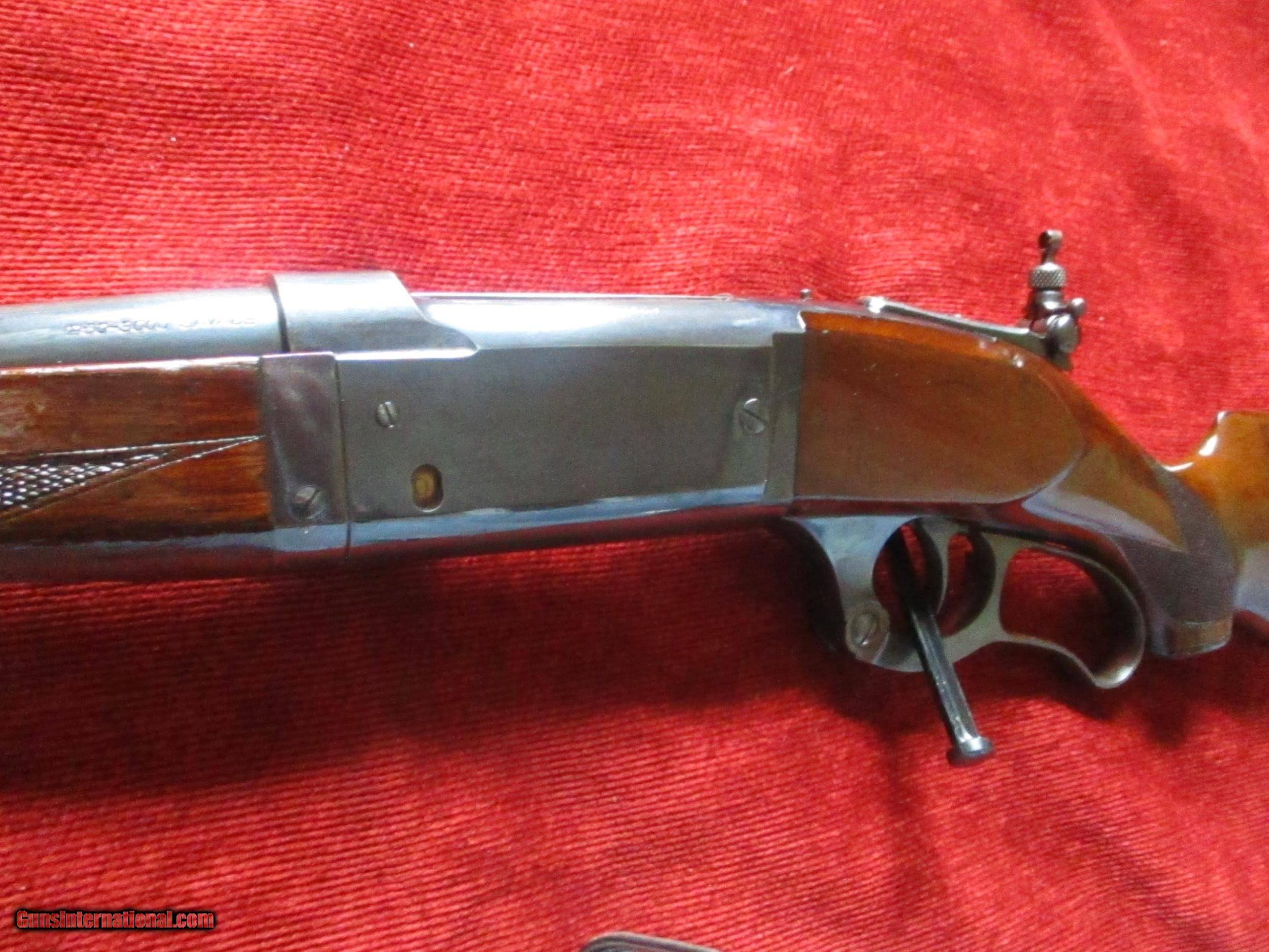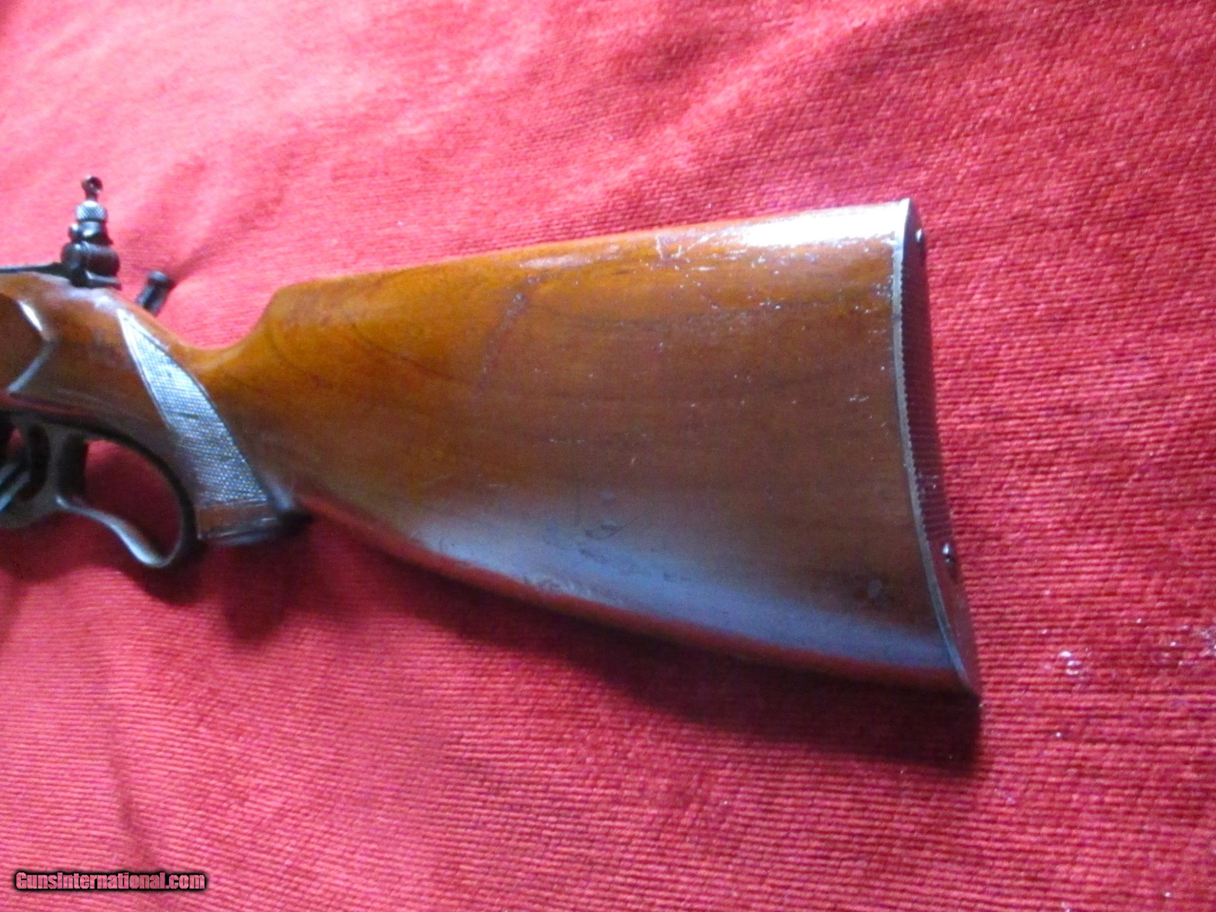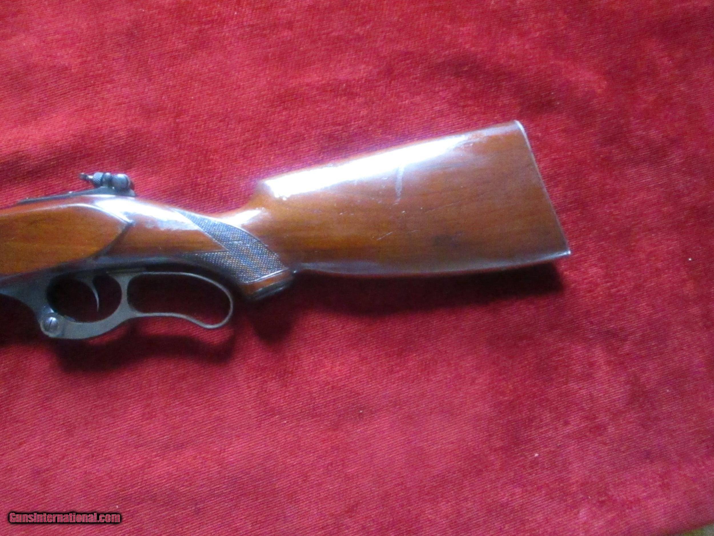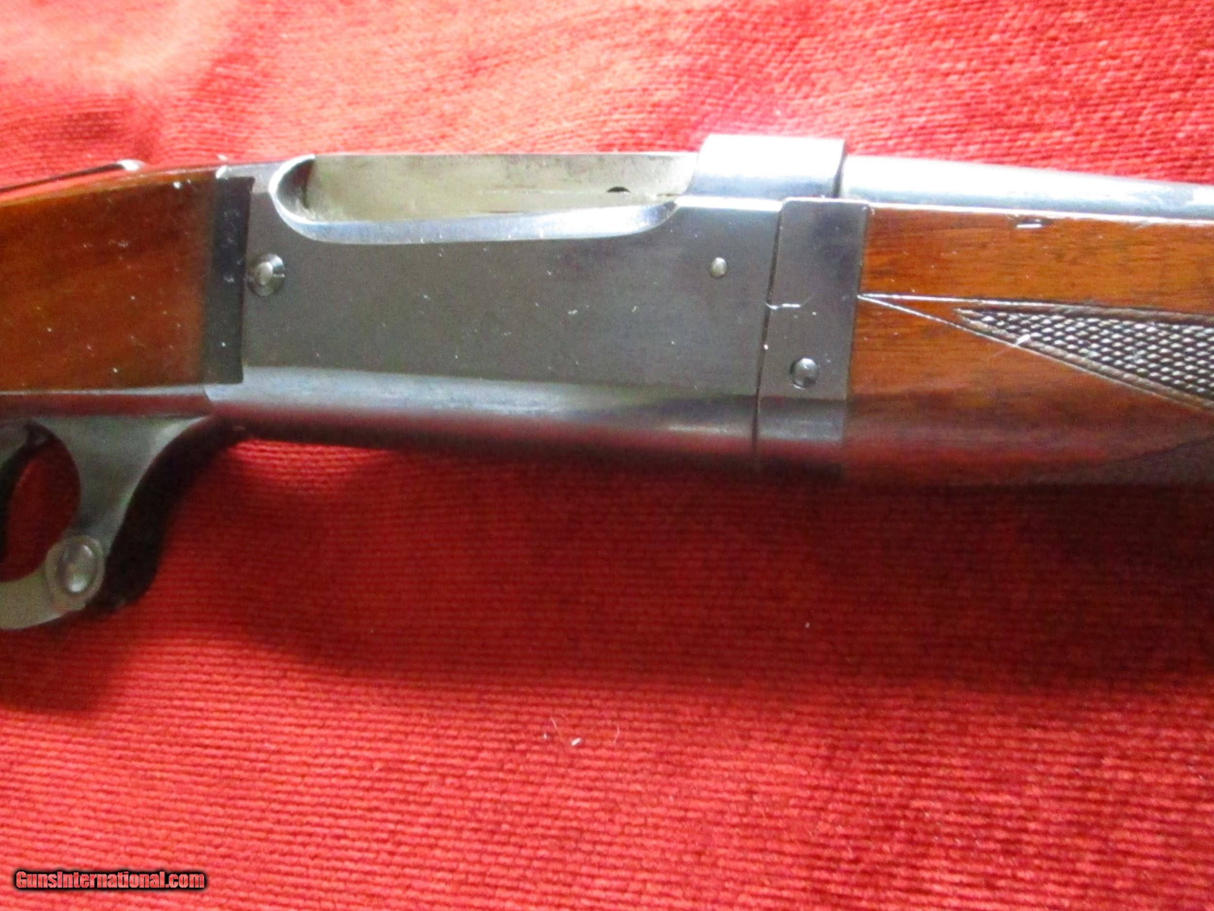 Description: 22"slight taper, checkered trigger, 1st. 3000 fps rifle, rear tang correct Lyman peep sight, checkered select American walnut Pearchbelly style only by Savage for this model 1899, 95% blue bbl., 50% fire blue, rest has fade to regular blue, no draying, few stock dings & some minor scratches no cracks or hairlines, great bore, very tifgt, craseant steel butt, SOLD |