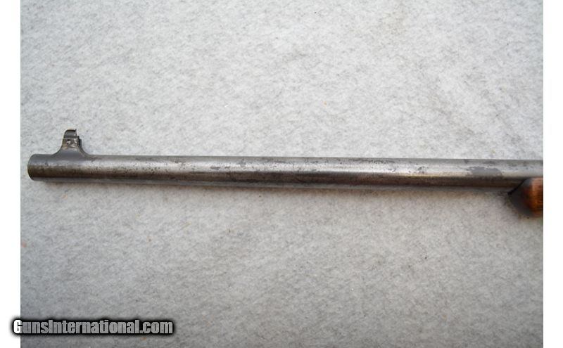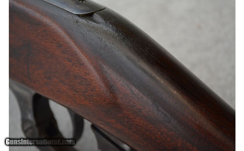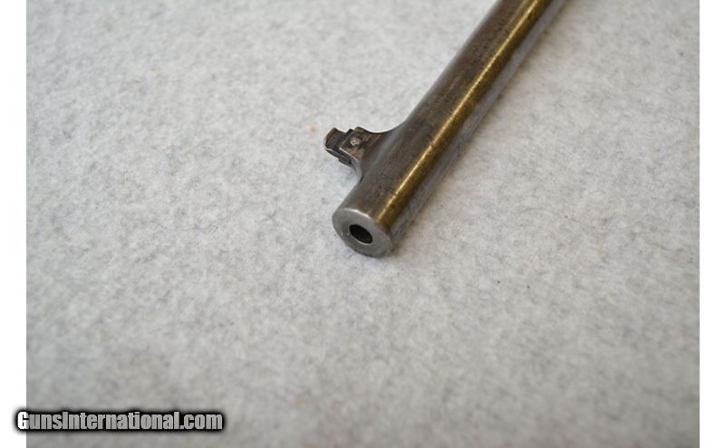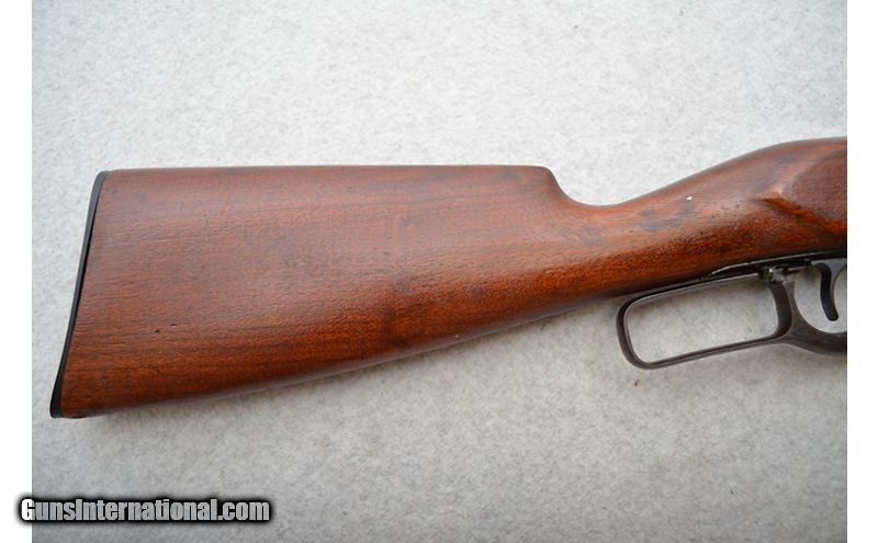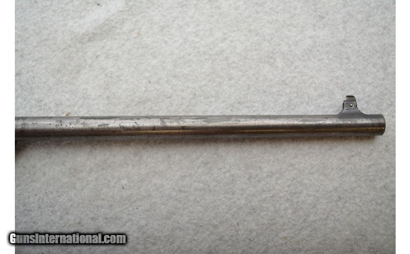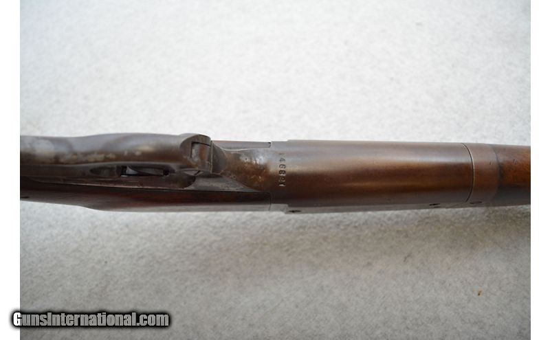 Description: Not great shape for certain. While the rifle appears to be functionally sound (lever works, firing pin seems to work, etc.) the finish has long since departed from most of the rifle. The finish on the receiver and lever looks to have been totally replaced with a dark patina. The bluing on the barrel is mostly gone, with patches of the patina and bare metal replacing it. The stock is cracked in two places. The biggest is about 4 inches and runs from the top tang back towards the left side of the stock. There is another crack in the fore arm of the right side near the tip. Along with a rather large dent on the left side; the finish is starting to look pretty rough too. .22 Savage Hi-Power SOLD Chambers: Lever action fed from a rotary internal magazine. Metal Condition: Fair. Wood Condition: Poor to fair. Bore Condition: Very good. Good rifling left but shows signs it's starting to darken a bit. Barrels: 20" Formerly blued. Triggers: Blued metal. Stock Dimensions: Varnished hardwood with 13" LOP. Fore End: Hardwood. Butt Pad: Savage branded black plastic plate. Weight: 7lbs Sights: Fixed front blade and adjustable rear peep. Chokes: N/A Item Location: Green Bay |