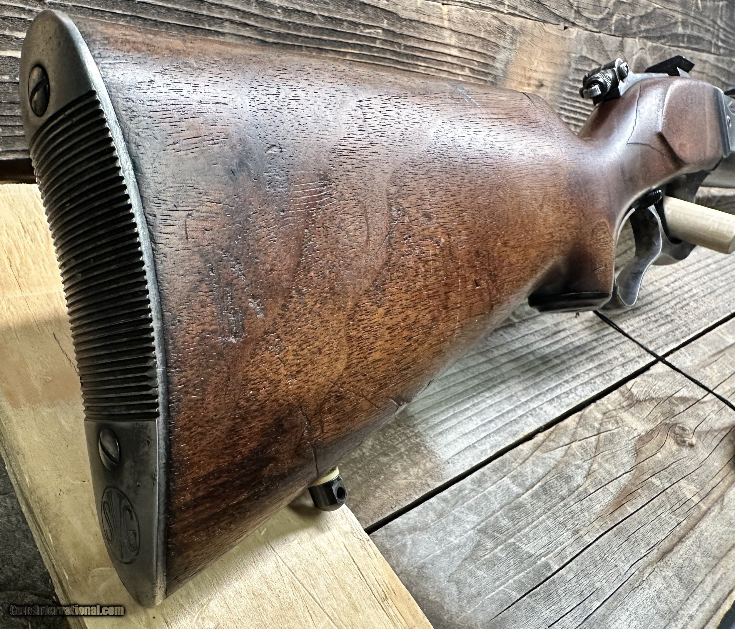 Description: Savage Model 99, chambered in 250-3000 Savage with a 22" barrel and a Lyman peep sight mounted on the tang, manufactured in 1938. Please do reference the included photos to examine the crack in the stock at the wrist. The stock does feel solid but the classic crack is present. Good bright and shiny bore with strong rifling. SOLD Rifle Caliber: .250-3000 Savage Manufacturer: Savage Model: 99 Serial Number: 378032 |