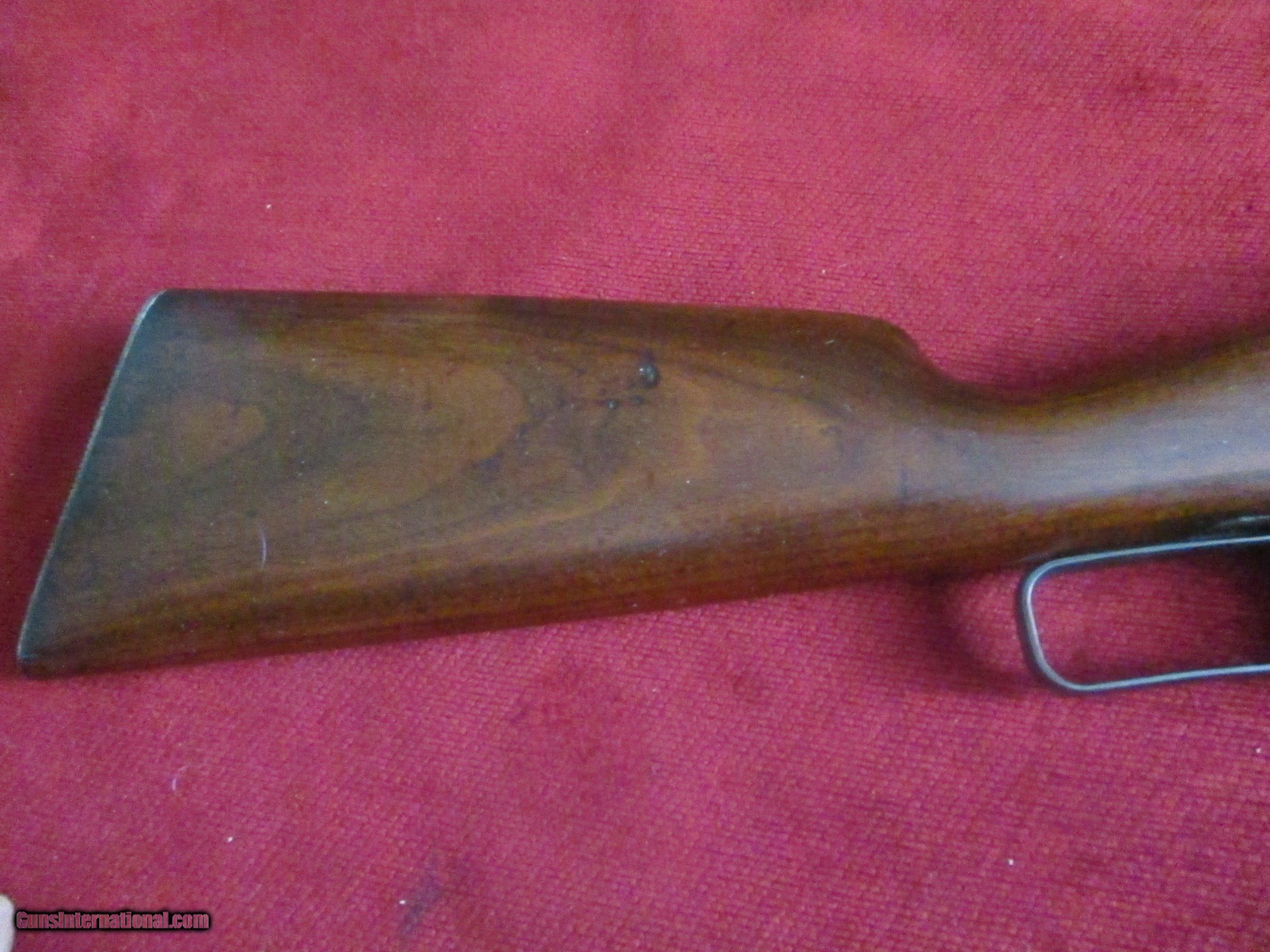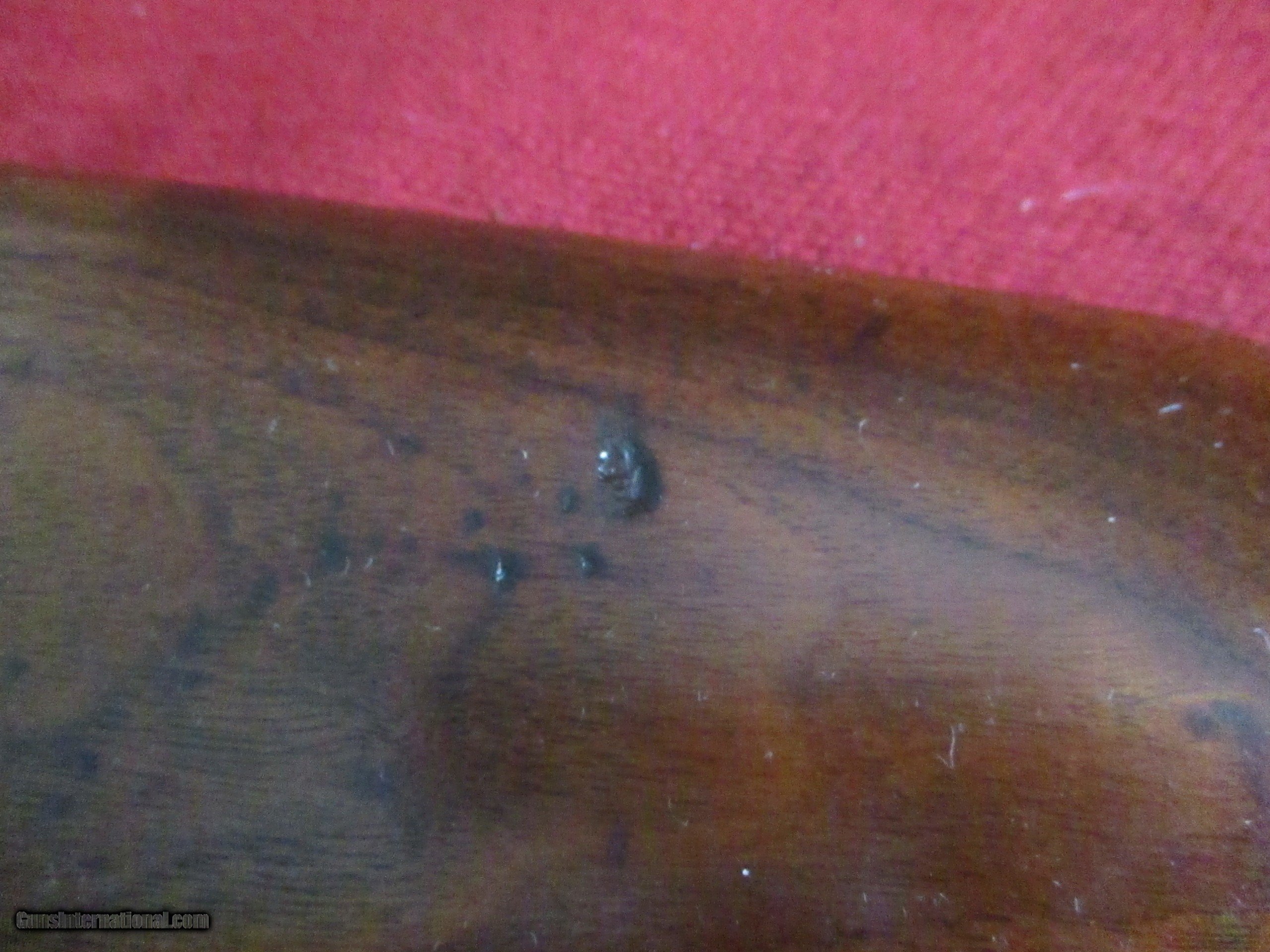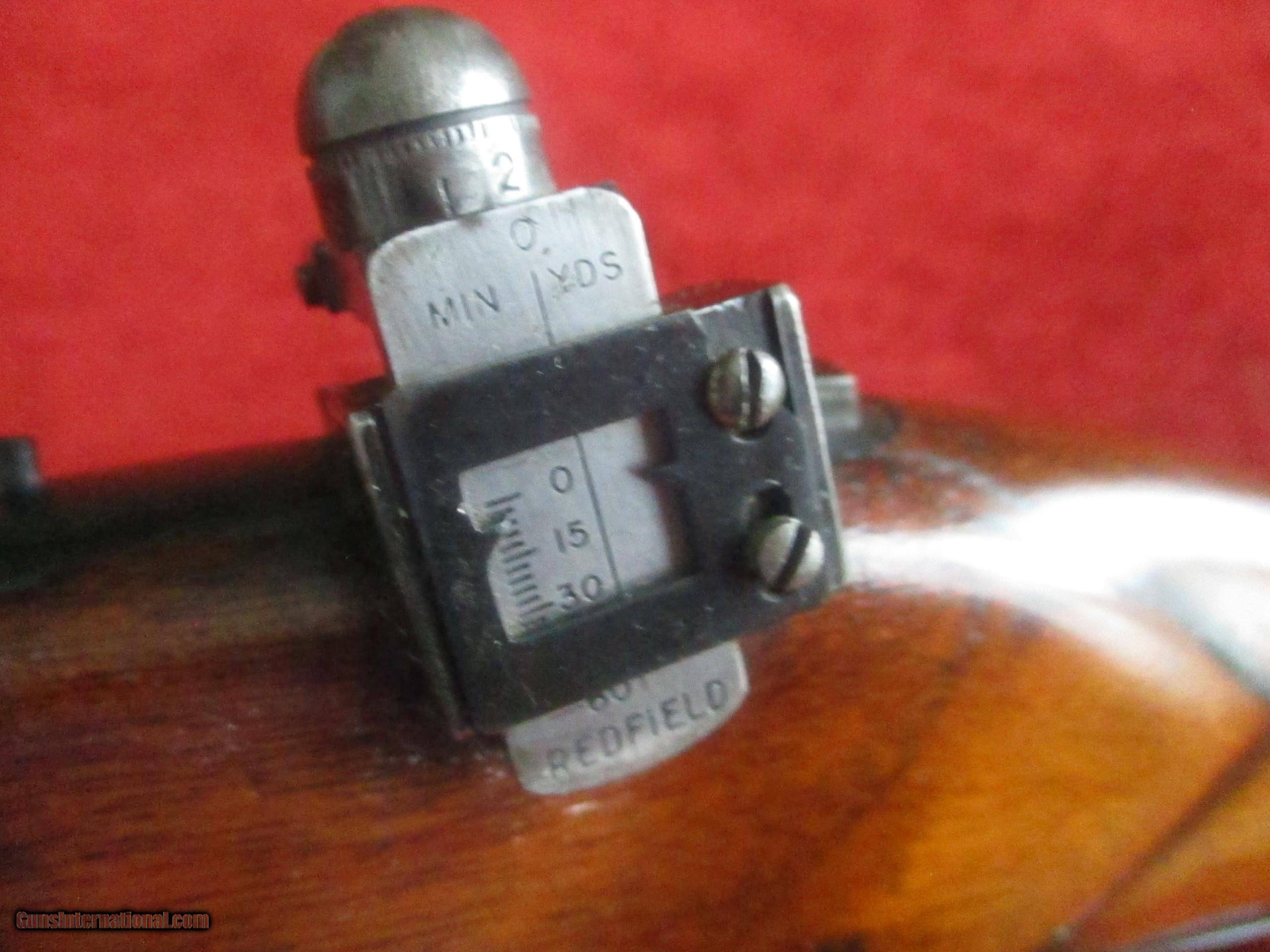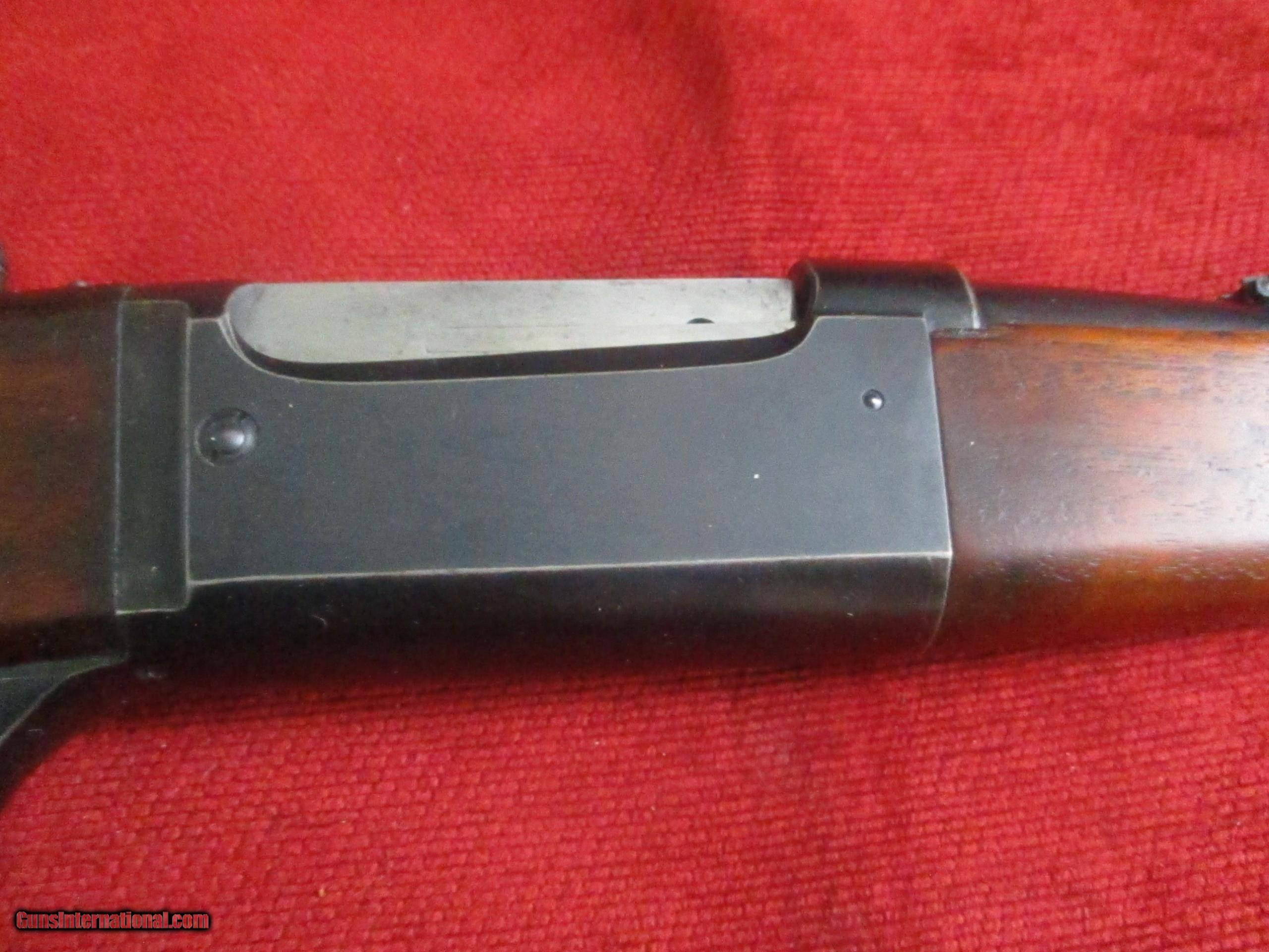 Description: 24" round bbl., #1 standibg blade front, #2Marbles open flip-up rear, #3 later but much better quality for hunting is a tang mounted fully adjustable early Redfield peep sight, brass cartridge counter, rear receiver safety firing indicator, American walnut straight stock, slight curved forearm with schnoble, checkered steel shotgun butt, re-varnished & cleaned stock,1 minor stock indentation (pictured), no cracks or repairs, 90% + original blue, case colored lever, excellent bore, extra tight & sound: This piece lacks collectable originally; however, not a better field hunting lever early 1923 99 short rifle! SOLD |