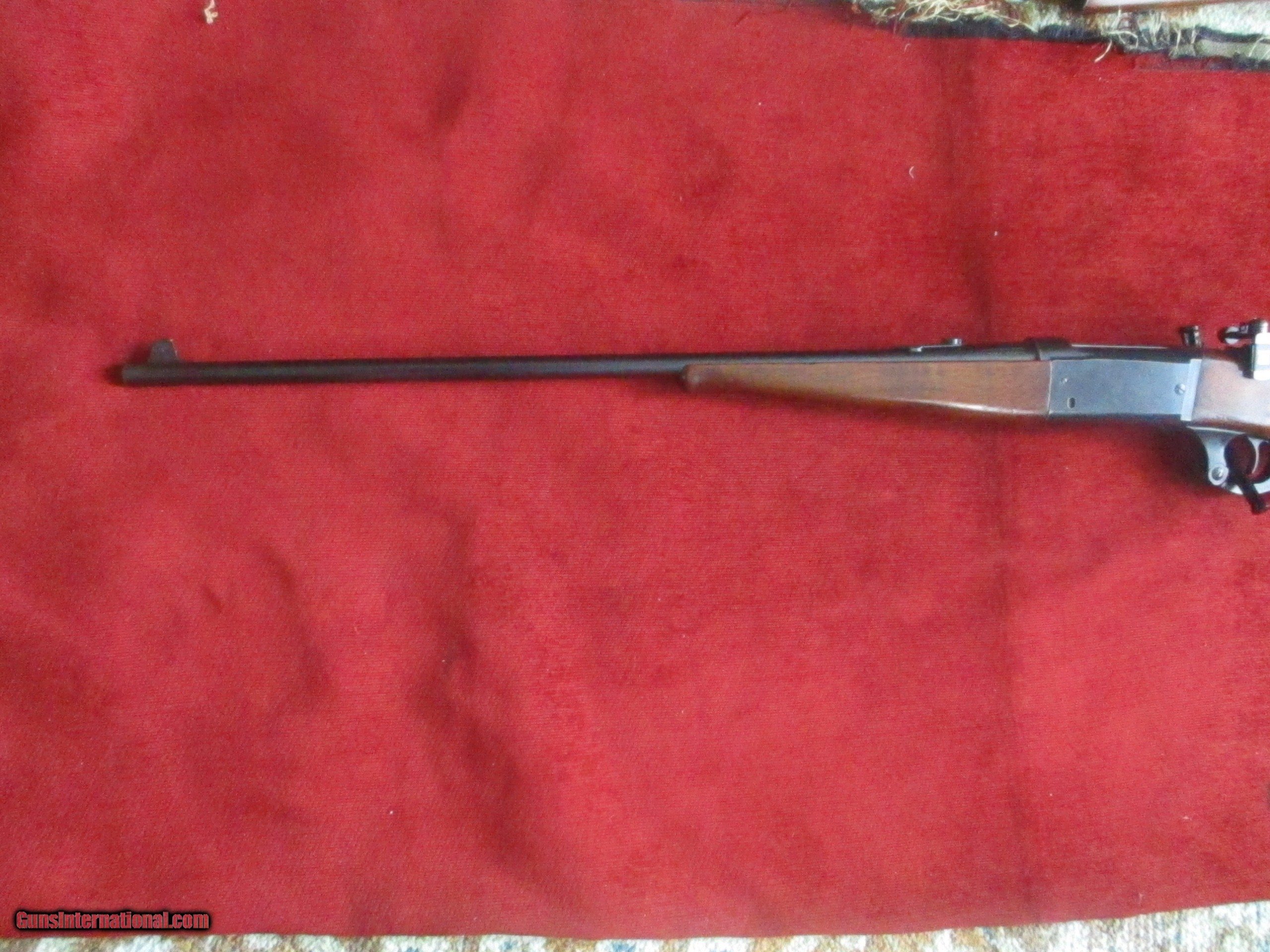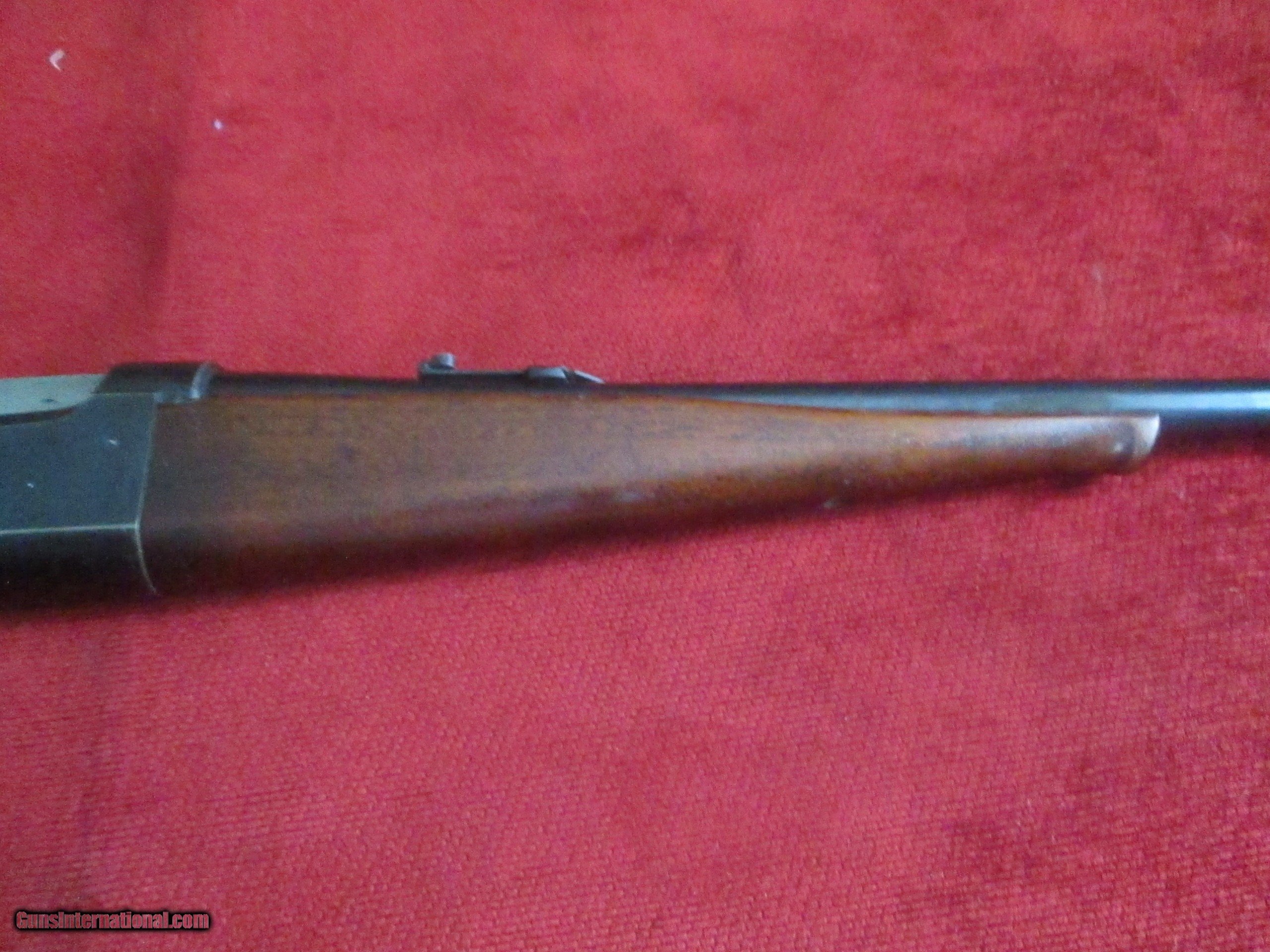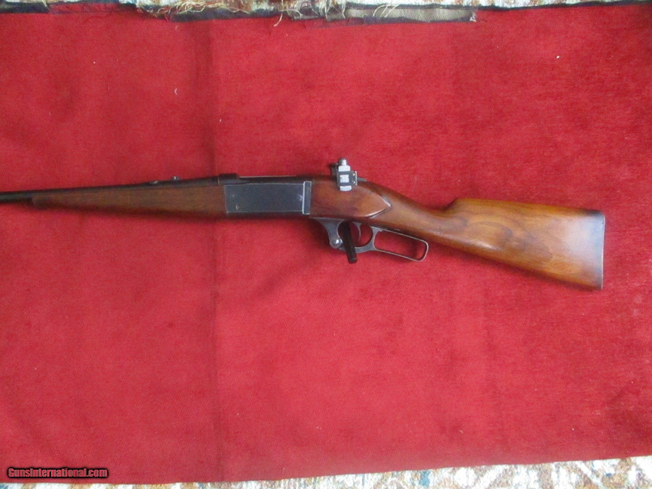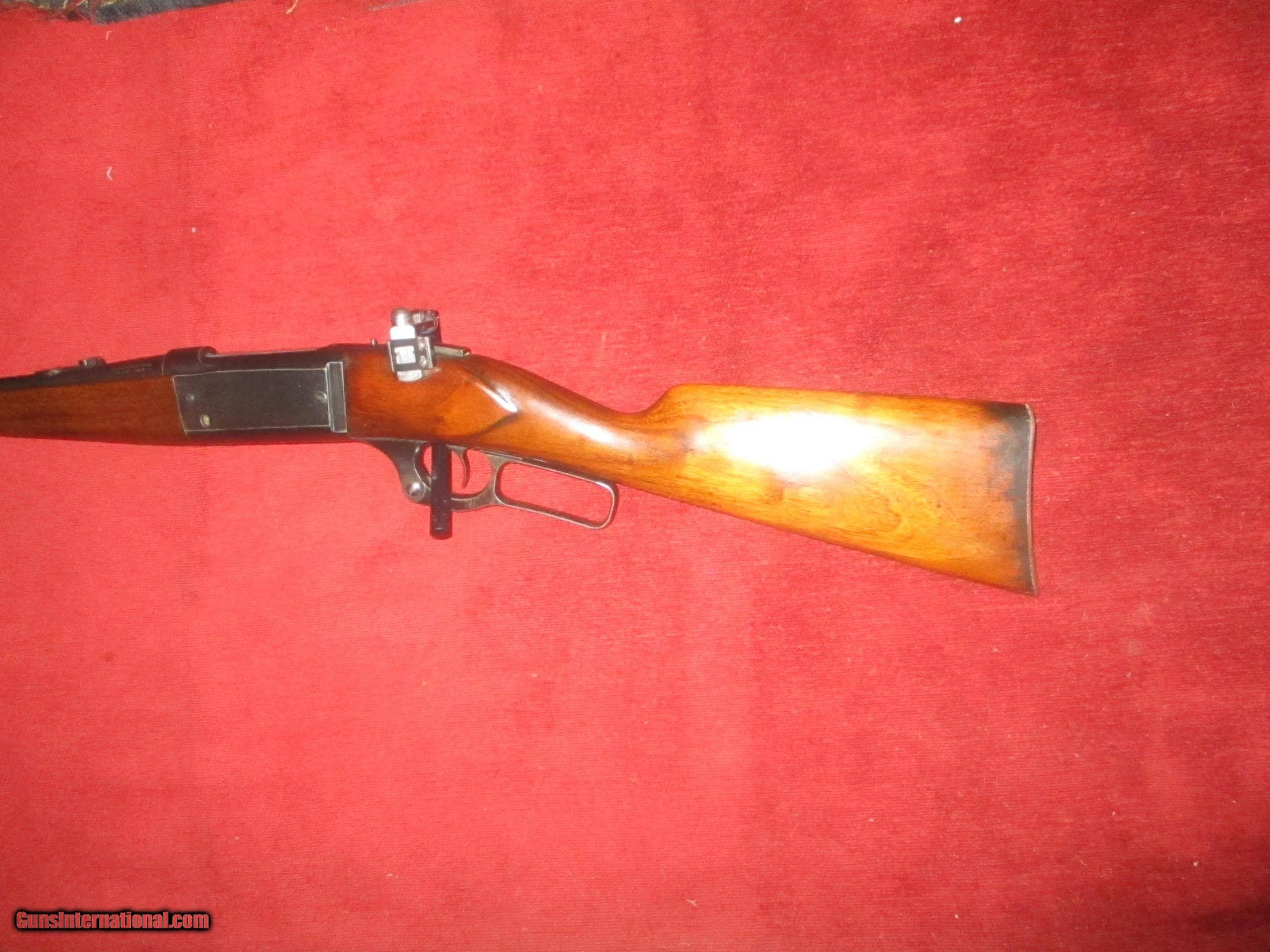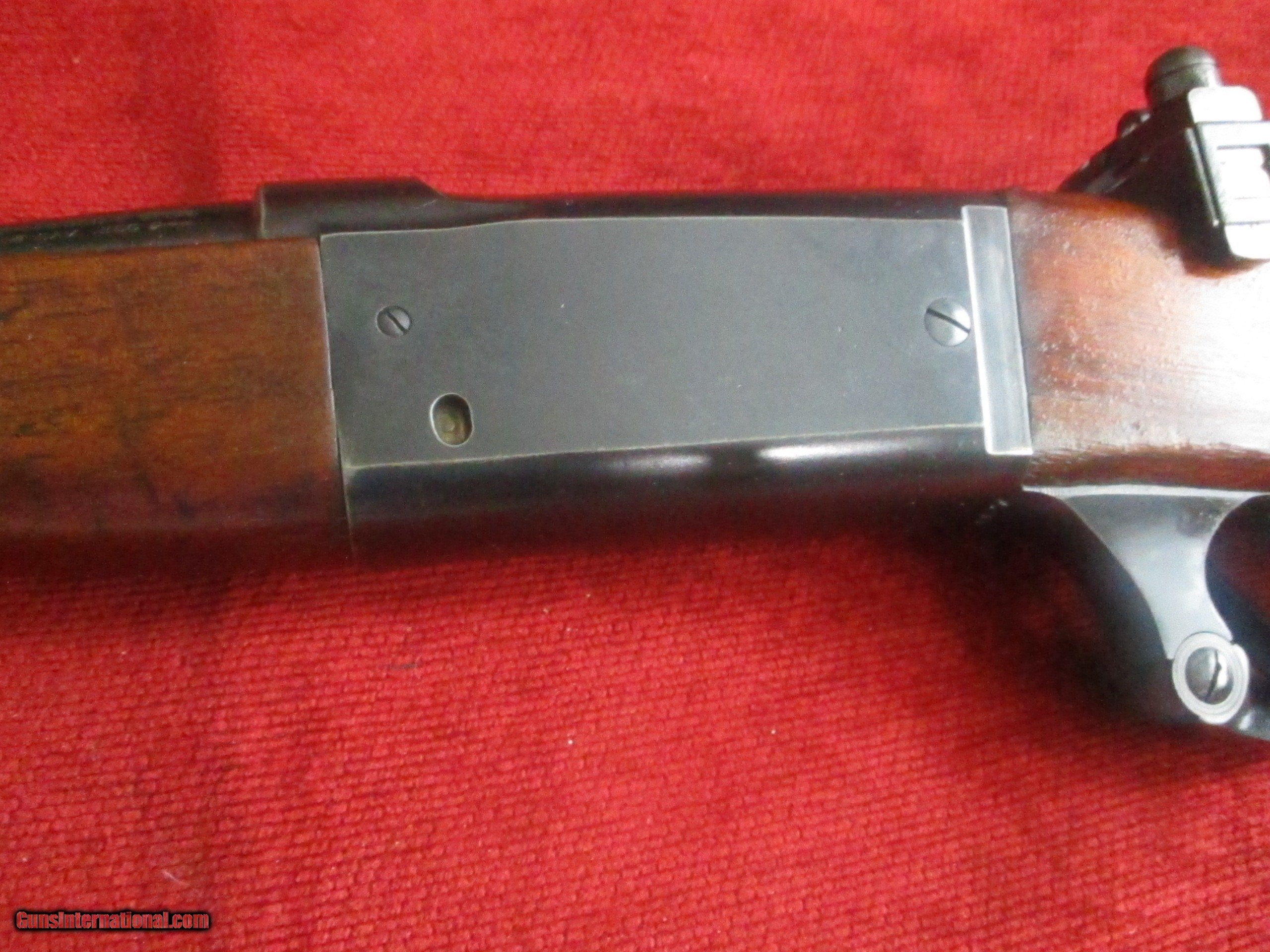 Description: 24" round bbl., #1 standibg blade front, #2Marbles open flip-up rear, #3 later but much better quality for hunting is a tang mounted fully adjustable early Redfield peep sight, brass cartridge counter, rear receiver safety firing indicator, American walnut straight stock, slight curved forearm with schnoble, checkered steel shotgun butt, re-varnished & cleaned stock,1 minor stock indentation (pictured), no cracks or repairs, 90% + original blue, case colored lever, excellent bore, extra tight & sound: This piece lacks collectable originally; however, not a better field hunting lever early 1923 99 short rifle! SOLD |