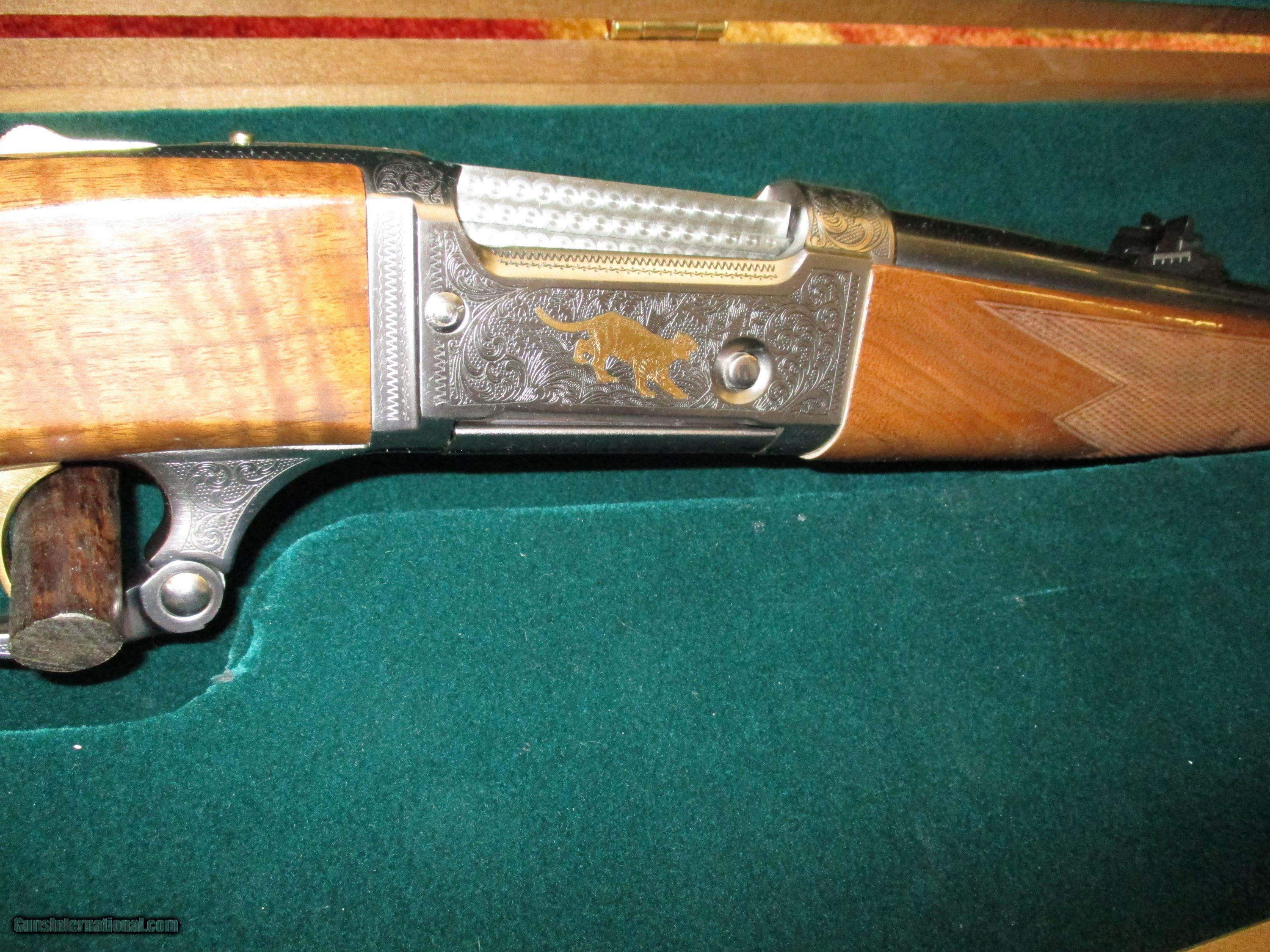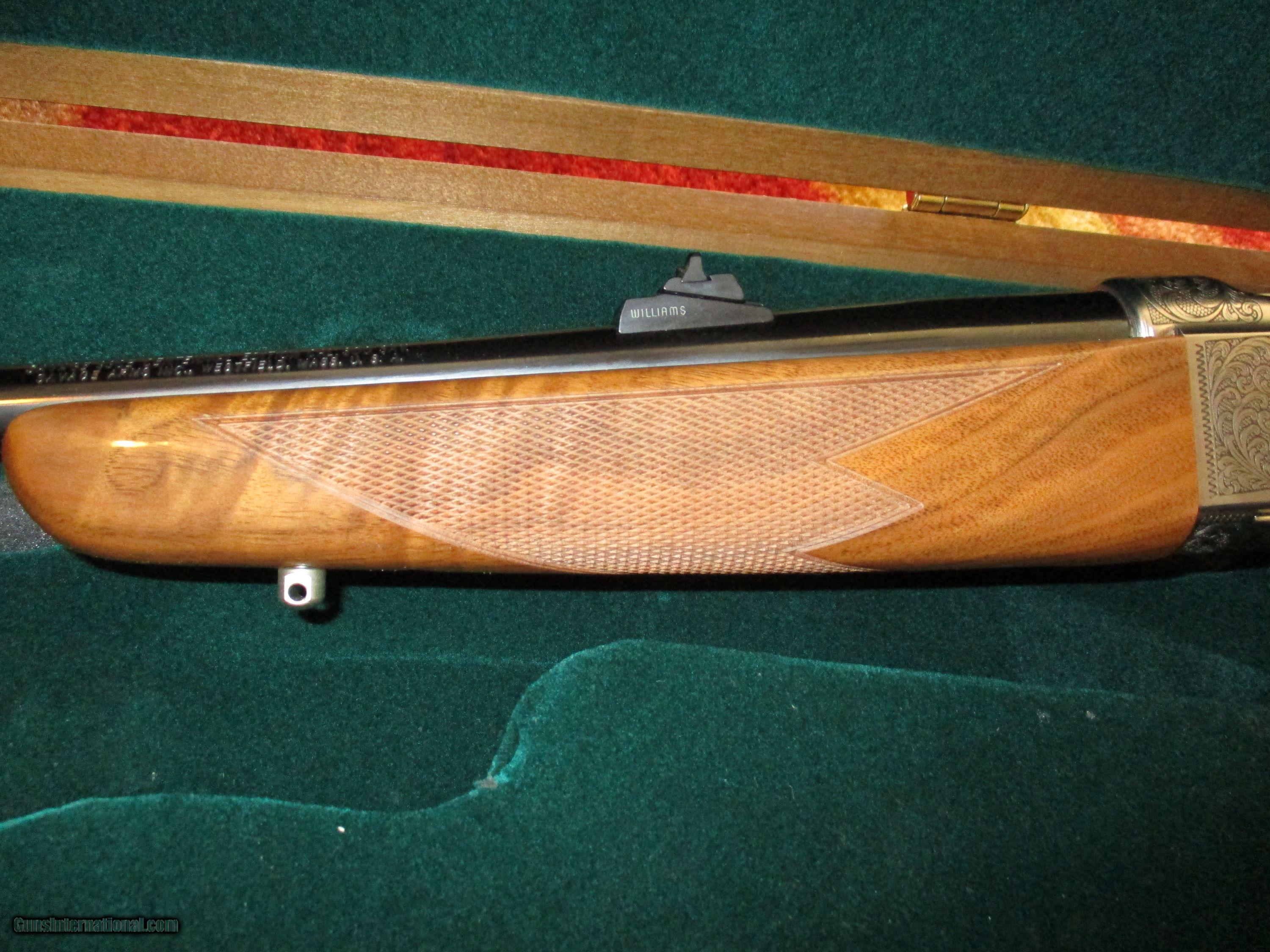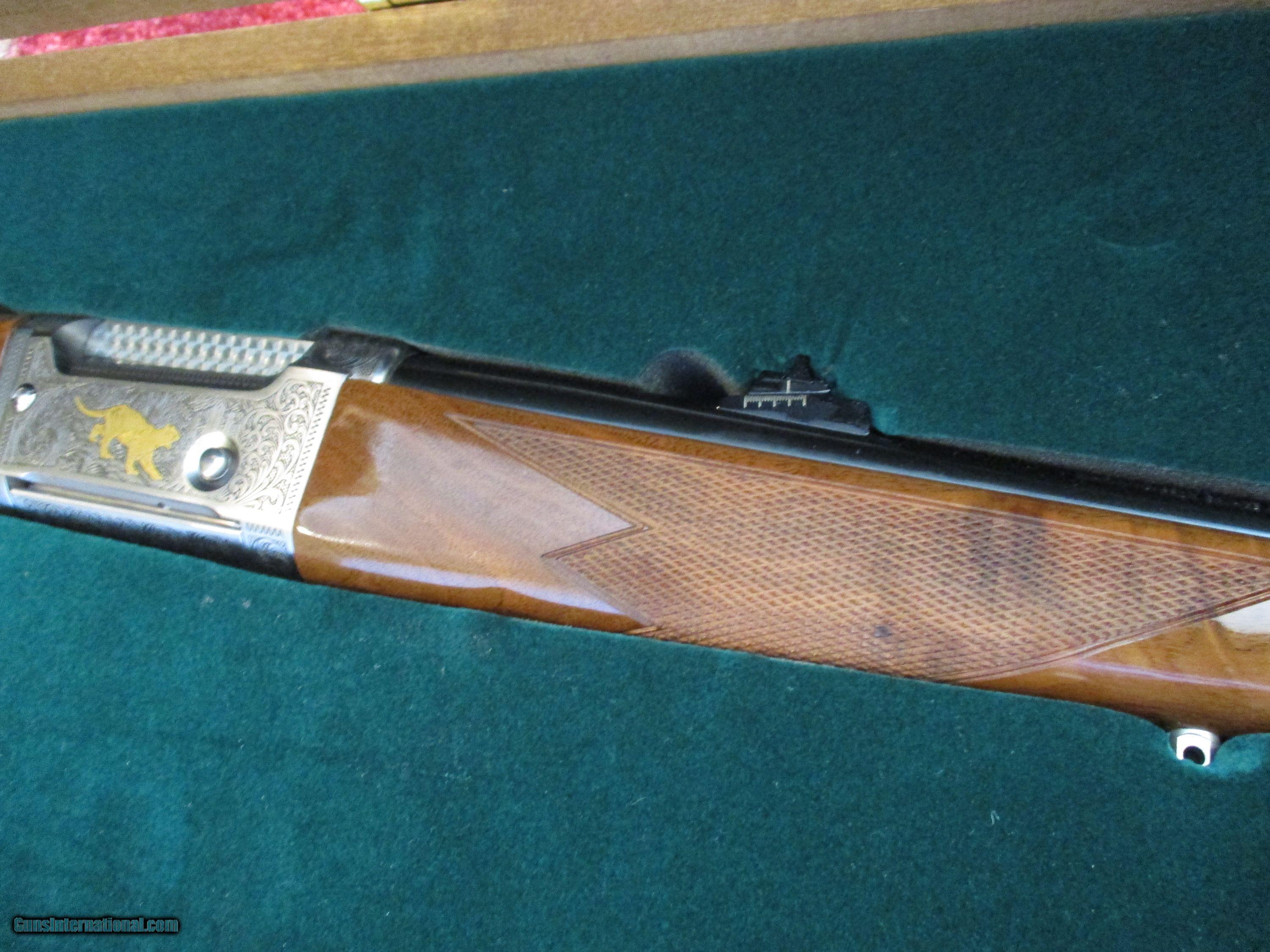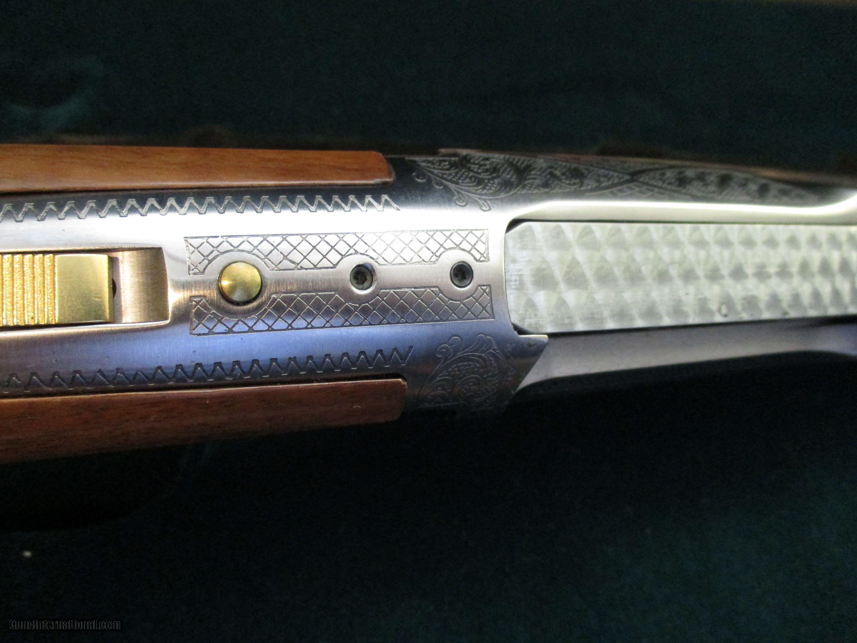 Description: 24" bbl., fully engraved of puma in 24kt gold, also a bellowing Elk with most tasteful scrollwork, many gold acsents, fine exotic highly figured American walnujt, unfired in exotic Walnut fleese lined case SOLD |