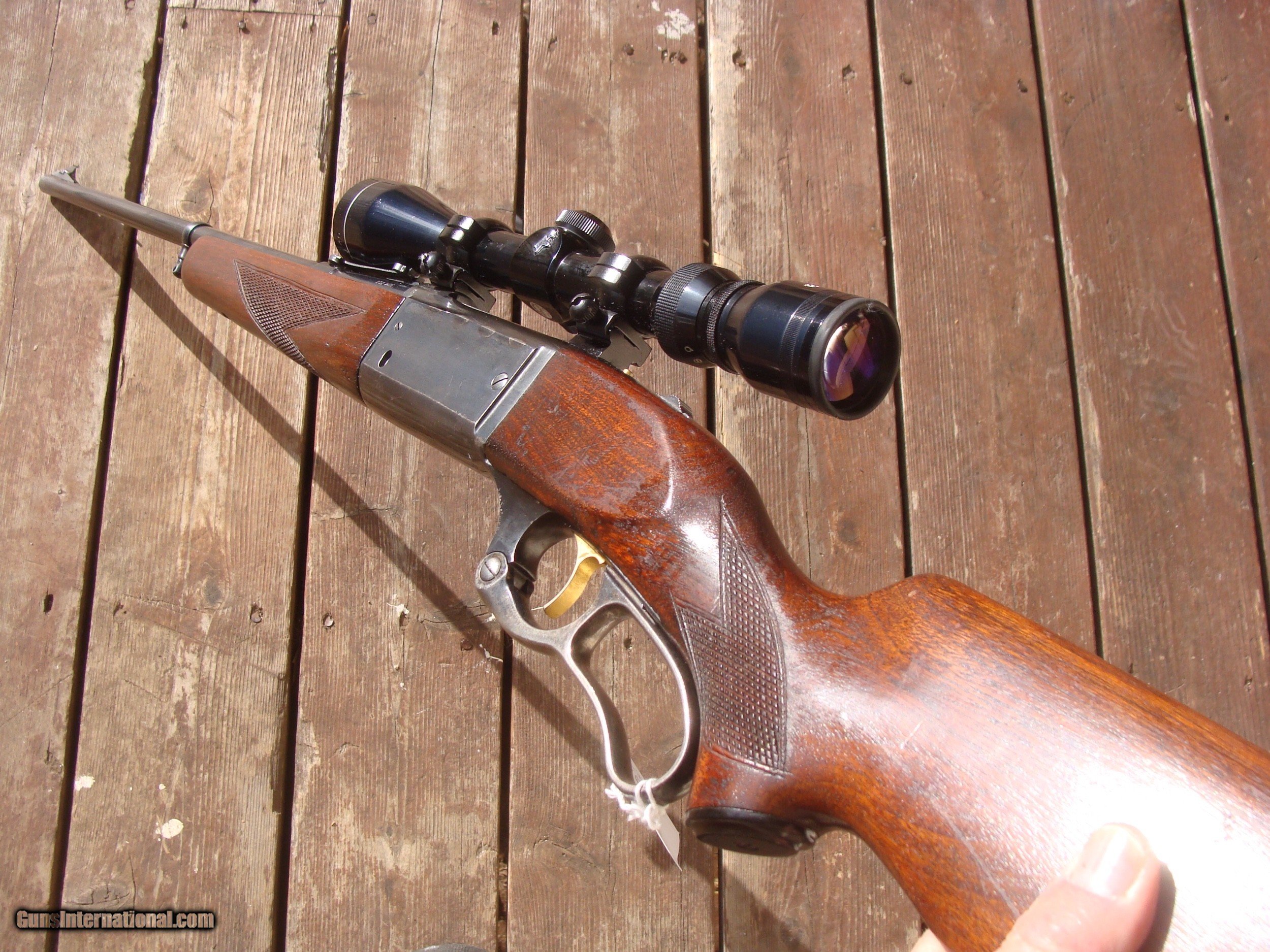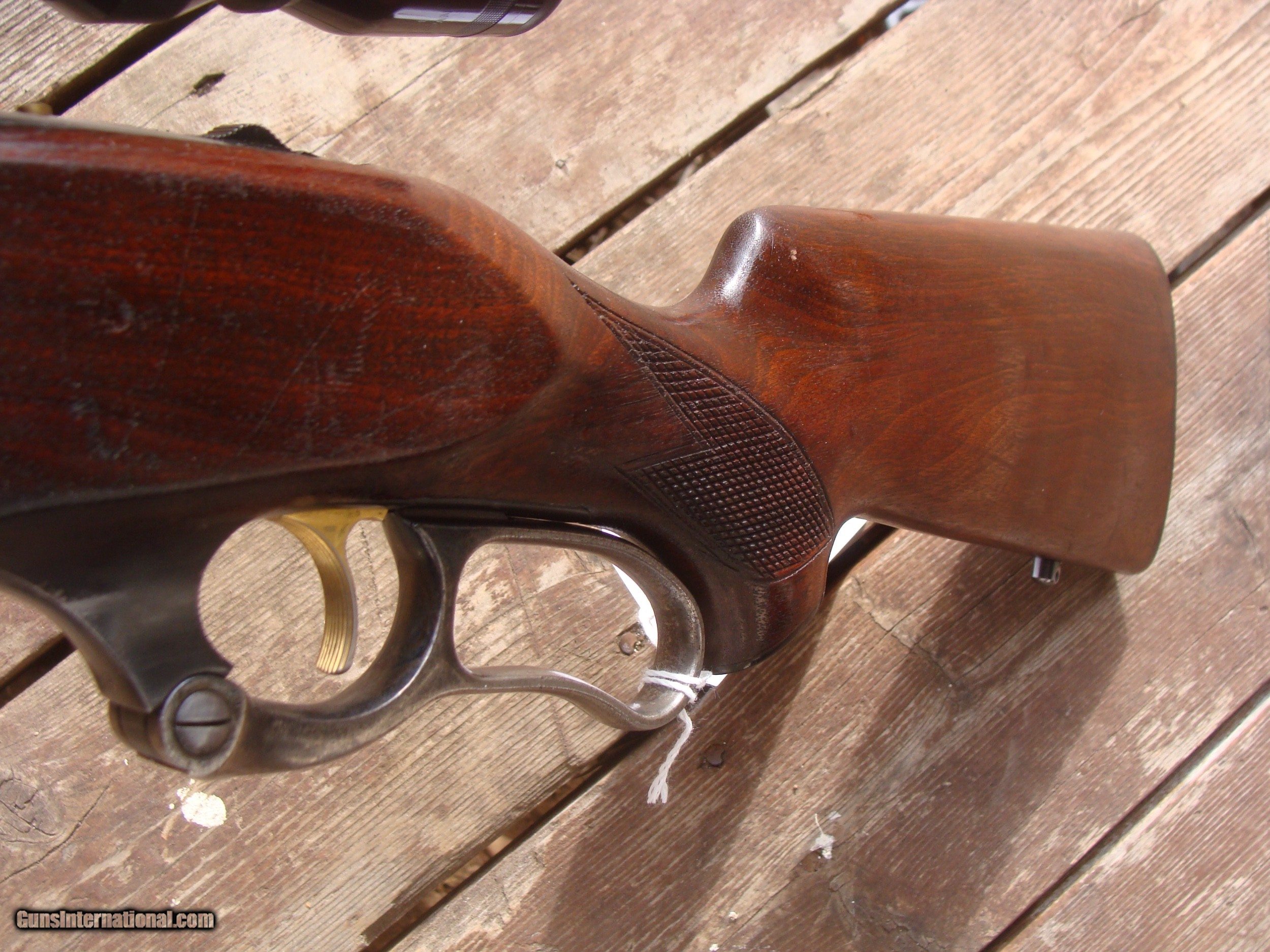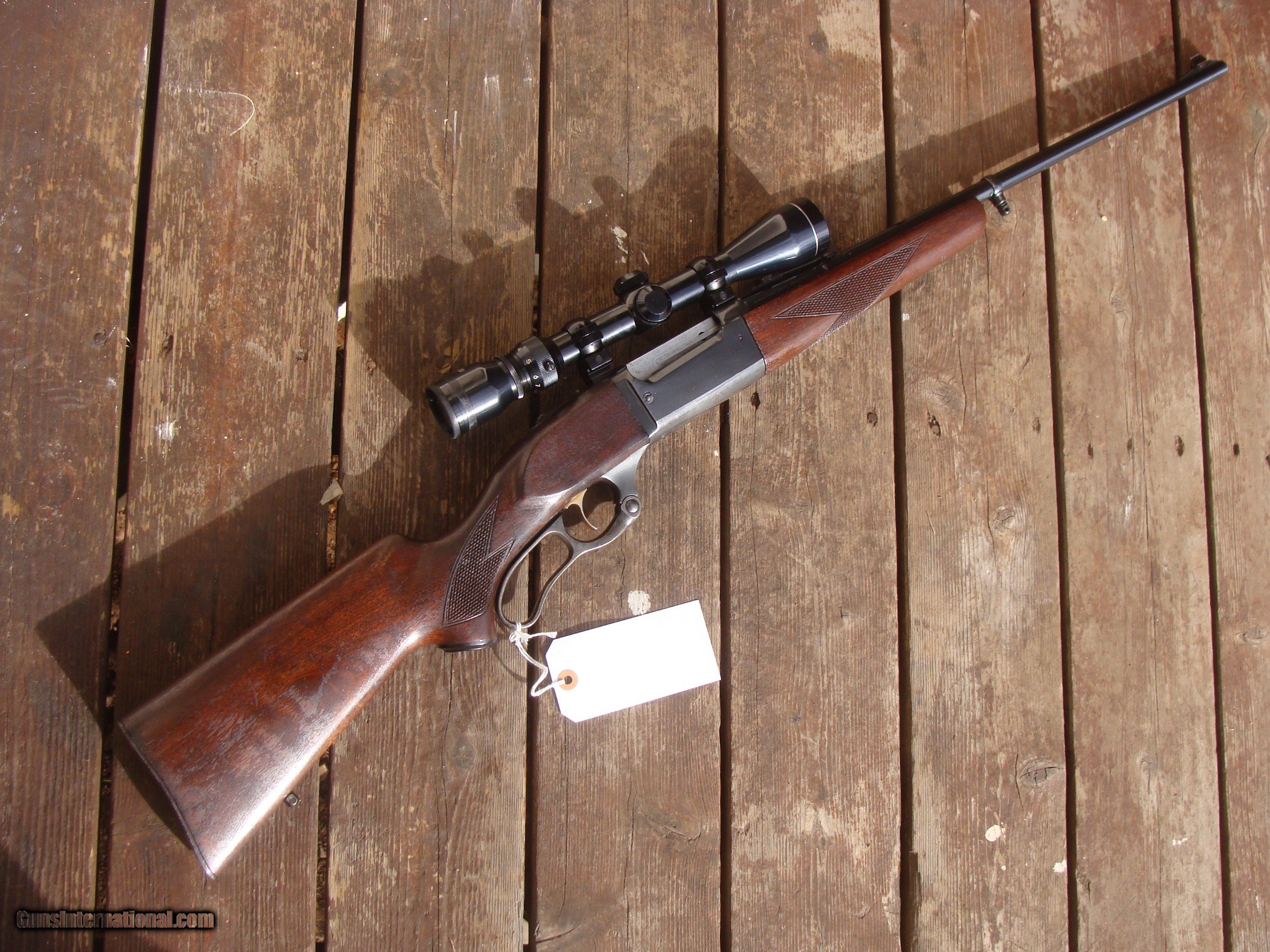 Description: This gun has all the best reatures of the older and semi modern 99's. In the desirable combination of 99F (Featherweight) chambered in .308 it has the more user friendly upper tang safety (vs the earlier lever safety), but still has the steel butt plate, the cartridge counter and cocking indicator. Handsome factory hand checkerd American Walnut Stock Set with near 90% of retained blue and stock finsihg with only modest handling and use marks. It is factory drilled for scope (it comes with an inexpensive but fully functional 3x9 duplex scope. It does NOT have the often found crack in the butt stock often found in the upper tang area and there have been no repairs. There are 4 small marks on the upper left side of the receiver. The correct factory butt plate has some crud but hese can usually be cleaned up nicely with a wire brush on a grinding wheel Please request additional pics if required to make your decision, the gun may not be returned for cosmetic issues unless not disclosed or shown in pics. We make every effort to present an accuart representation of the gun and its conditon Shipping is $ 55.00 IF IT DOES NOT SAY NEXT TO THE PRICE..."SALE PENDING OR UNDER DEPOSIT"...IT IS AVAILABLE. WE DO NOT REPLY TO INQUIRIES THAT SAY "INTERESTED IN THIS GUN" OR "IS IT AVAILABLE" IF YOU WOULD LIKE TO BUY THIS OR ANY OF OUR GUNS WE SUGGEST YOU PHONE US; WE ARE OFTEN AVAIALABLE LONG HOURS. IF YOU ARE INTERSTED IN A GUN THAT IS UNDER DEPOSIT AND WOULD LIKE TO BE NOTIFIED IF A SIMILAR GUN COMES IN DROP US A LINE AND WE WILL MAKE EFFORTS TO CONTACT YOU WHEN ONE DOES COME IN. WE HAVE OVER 2000 SALES ON ALL SITES WITH AN A+ RATING ON ALL WE ALSO KEEP AN INVENTORY OF OLDER PERIOD CORRECT SCOPES; CALL WITH NEEDS WE MOSTLY PICK VERY CLEAN AND LIGHLTY USED GUNS. WE ARE HAPPY TO TAKE CONSIGNMENT GUNS AND COLLECTIONS OR WILL BUY YOURS OUTRIGHT. WE SOMETIMES ARE EMPLOYED FOR ESTATE PURPOSES AND VALUATIONS. CT RESIDENTS MUST CONTACT US TO UNDERSTAND OUR IN STATE TRANSFER POLICIES. PAYMENT USPS MONEY ORDER ONLY AT THIS TIME. ( WE CAN TAKE A DEPOSIT WITH A CARD BUT THE GUN MUST BE PAID WITH A USPS MONEY ORDER) SOME EXCEPTIONS ARE AVAIL. IT IS THE BUYERS RESPONSIBILITY TO GET US A COPY OF YOUR RECEIVING FFL'S LIC AND A COPY OF YOUR PHOTO ID BEFORE THE GUN SHIPS YOU MUST CALL YOUR FFL.WE DO NOT CALL FOR YOU. LAYAWAY PURCHASES NOT COMPLETED OR ANY RETURNED ITEM UNLESS NOT AS DESCRIBED OR DAMAGED ARE SUBJECT TO A 10% RELISTING/RESTOCKING FEE AND MUST BE RETURNED WITH NO NEW MARKS OR SCRATCHES, SENT BACK INSURED, PRIORITY SIGNATURE REQUIRED. ALL INFORMATION CONTAINED HEREIN IS BELIEVED TO BE ACCURATE BUT IS NOT GUARANTEED. WITH ANY OLDER OR USED GUN IT SHOULD BE EXAMINED BY A GUNSMITH OR COMPETENT EXPERT PRIOR TO USE) SOLD |