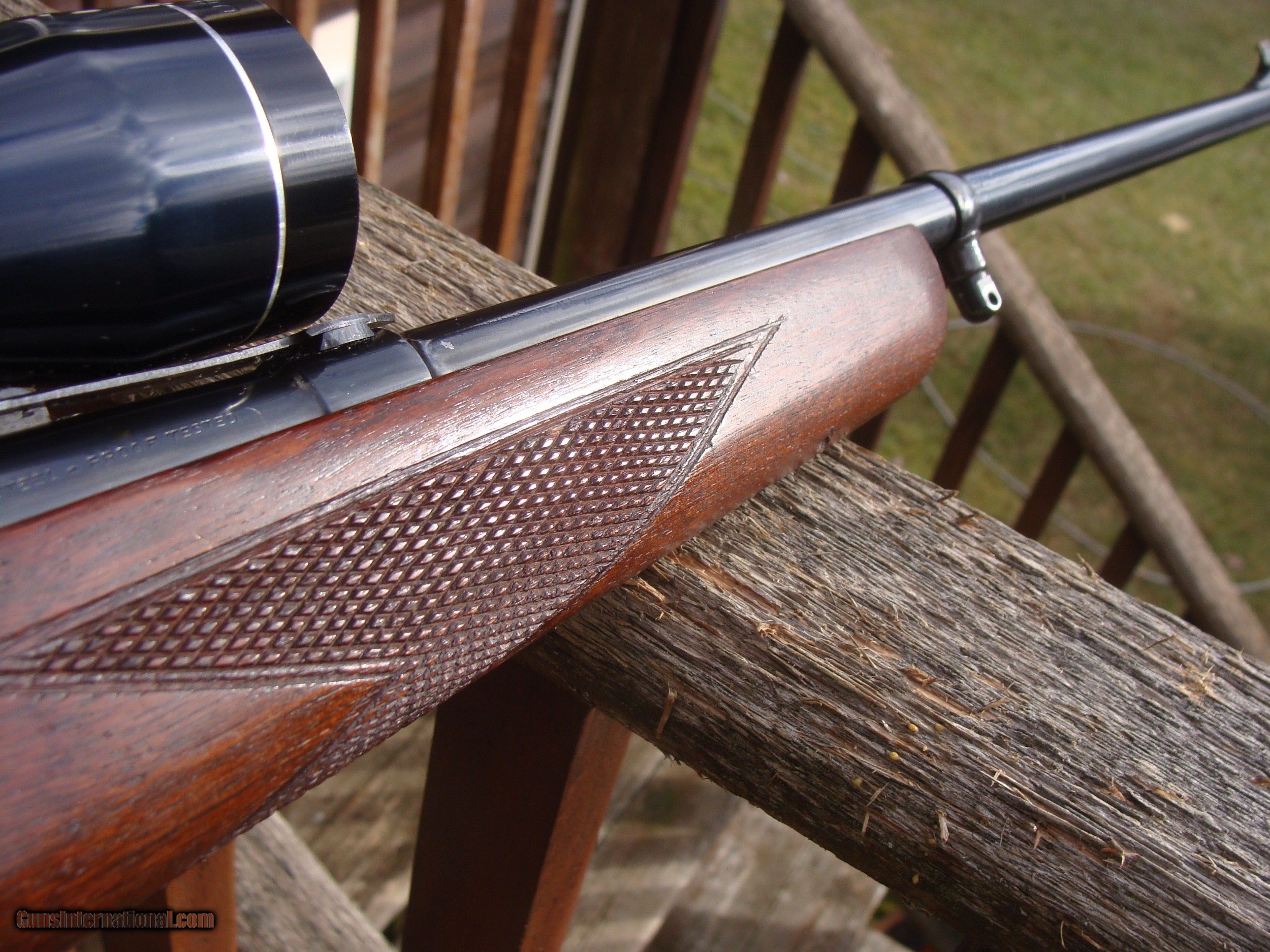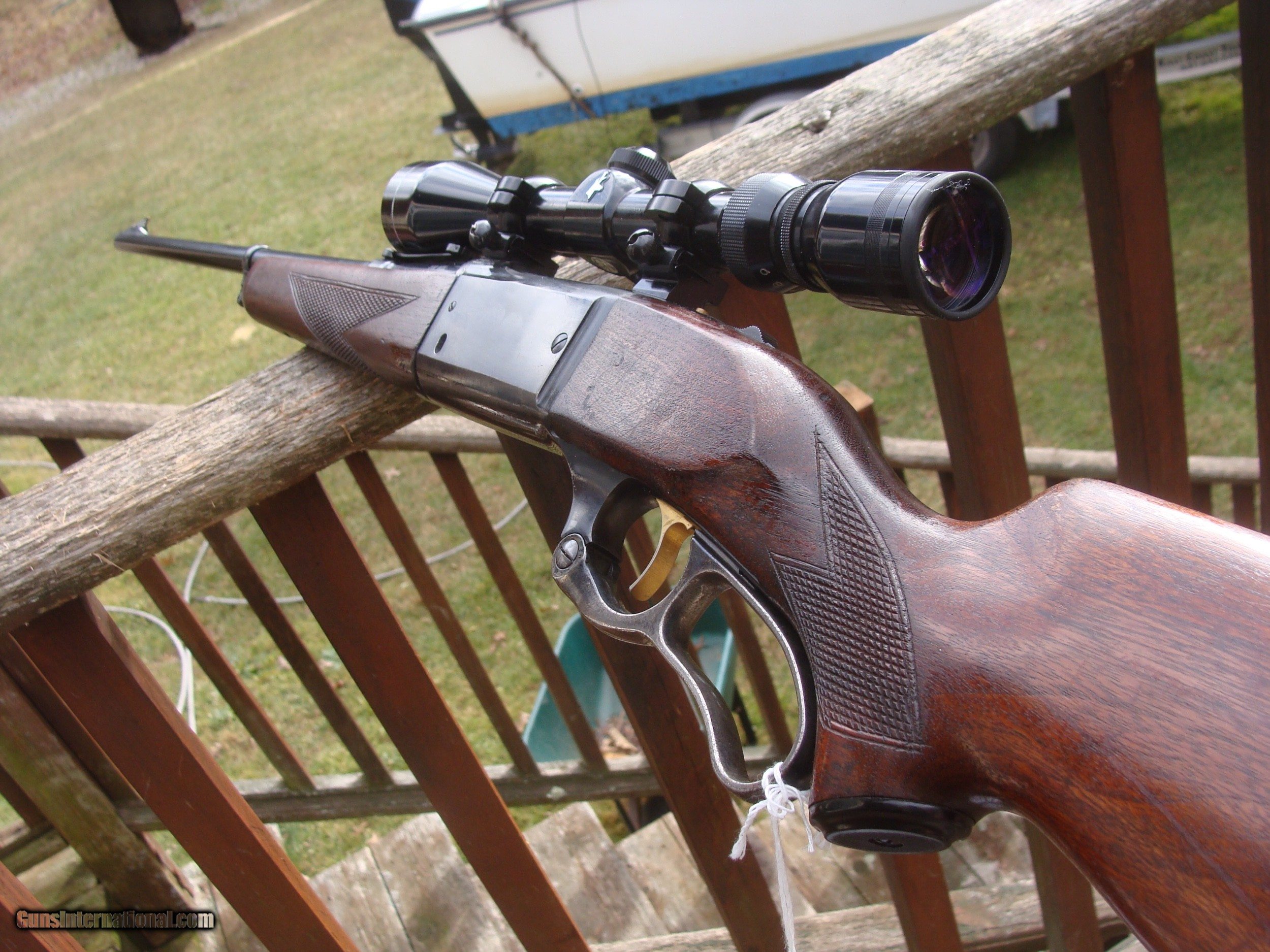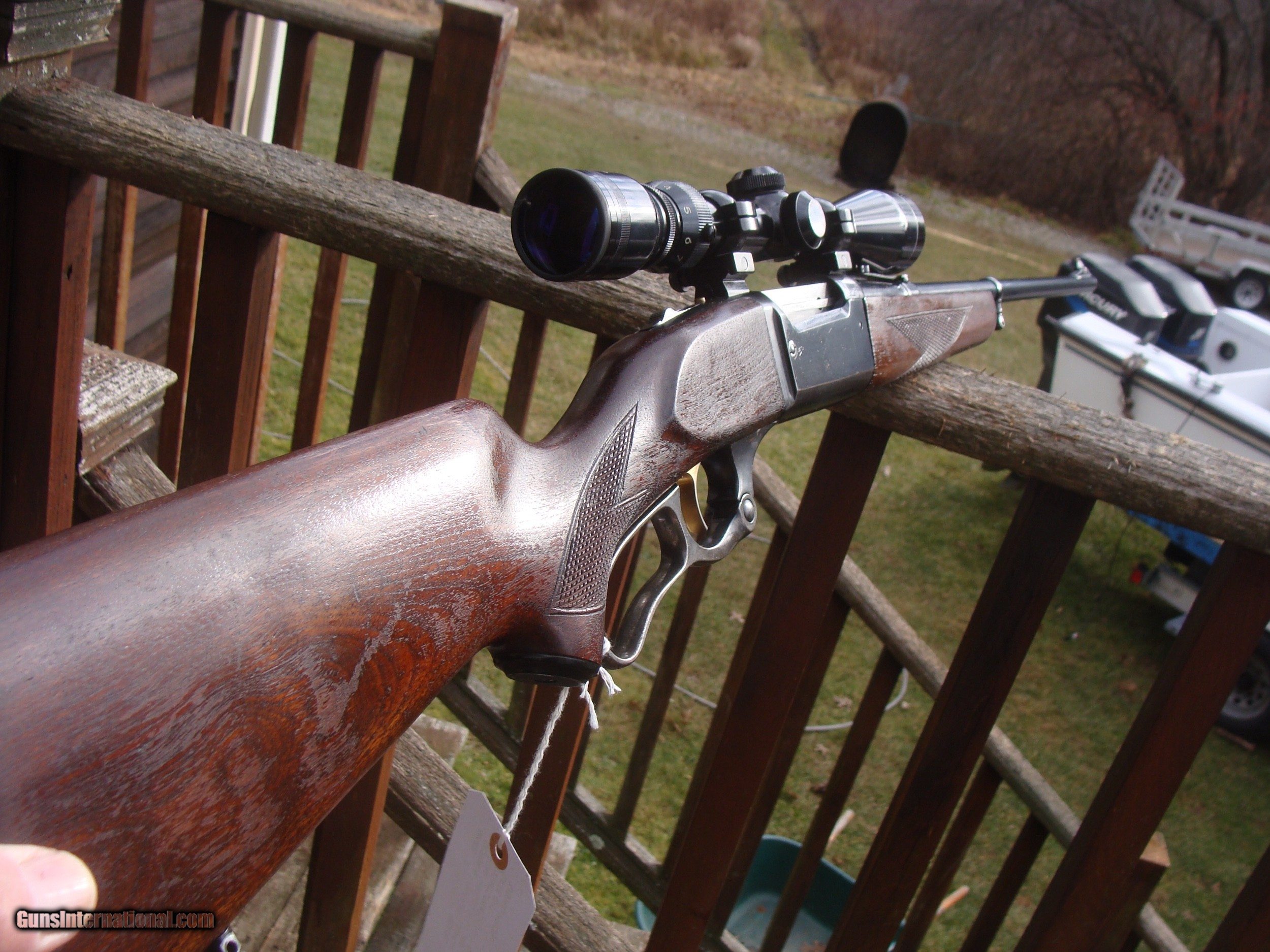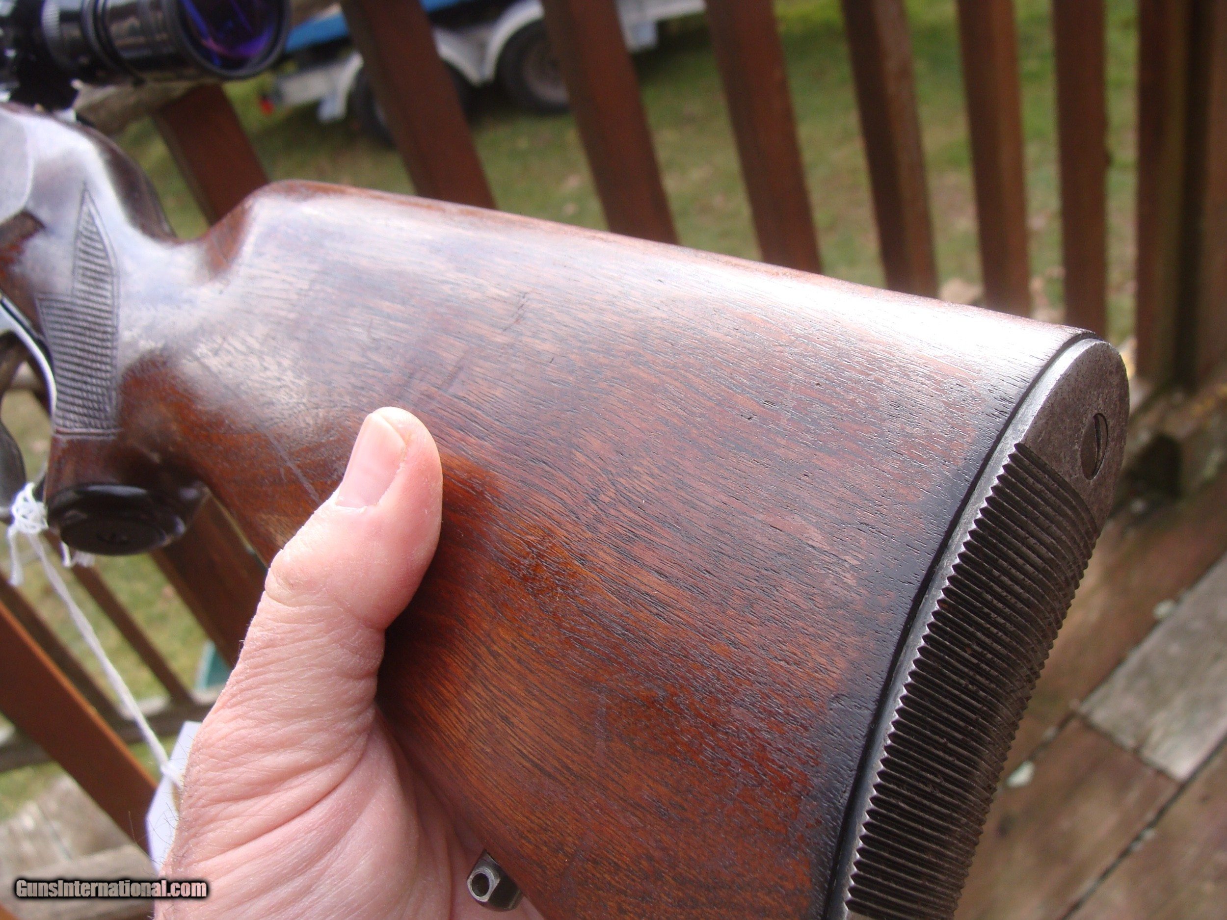 Description: This gun has all the best reatures of the older and semi modern 99's. In the desirable combination of 99F (Featherweight) chambered in .308 it has the more user friendly upper tang safety (vs the earlier lever safety), but still has the steel butt plate, the cartridge counter and cocking indicator. Handsome factory hand checkerd American Walnut Stock Set with near 90% of retained blue and stock finsihg with only modest handling and use marks. It is factory drilled for scope (it comes with an inexpensive but fully functional 3x9 duplex scope. It does NOT have the often found crack in the butt stock often found in the upper tang area and there have been no repairs. There are 4 small marks on the upper left side of the receiver. The correct factory butt plate has some crud but hese can usually be cleaned up nicely with a wire brush on a grinding wheel Please request additional pics if required to make your decision, the gun may not be returned for cosmetic issues unless not disclosed or shown in pics. We make every effort to present an accuart representation of the gun and its conditon Shipping is $ 55.00 IF IT DOES NOT SAY NEXT TO THE PRICE..."SALE PENDING OR UNDER DEPOSIT"...IT IS AVAILABLE. WE DO NOT REPLY TO INQUIRIES THAT SAY "INTERESTED IN THIS GUN" OR "IS IT AVAILABLE" IF YOU WOULD LIKE TO BUY THIS OR ANY OF OUR GUNS WE SUGGEST YOU PHONE US; WE ARE OFTEN AVAIALABLE LONG HOURS. IF YOU ARE INTERSTED IN A GUN THAT IS UNDER DEPOSIT AND WOULD LIKE TO BE NOTIFIED IF A SIMILAR GUN COMES IN DROP US A LINE AND WE WILL MAKE EFFORTS TO CONTACT YOU WHEN ONE DOES COME IN. WE HAVE OVER 2000 SALES ON ALL SITES WITH AN A+ RATING ON ALL WE ALSO KEEP AN INVENTORY OF OLDER PERIOD CORRECT SCOPES; CALL WITH NEEDS WE MOSTLY PICK VERY CLEAN AND LIGHLTY USED GUNS. WE ARE HAPPY TO TAKE CONSIGNMENT GUNS AND COLLECTIONS OR WILL BUY YOURS OUTRIGHT. WE SOMETIMES ARE EMPLOYED FOR ESTATE PURPOSES AND VALUATIONS. CT RESIDENTS MUST CONTACT US TO UNDERSTAND OUR IN STATE TRANSFER POLICIES. PAYMENT USPS MONEY ORDER ONLY AT THIS TIME. ( WE CAN TAKE A DEPOSIT WITH A CARD BUT THE GUN MUST BE PAID WITH A USPS MONEY ORDER) SOME EXCEPTIONS ARE AVAIL. IT IS THE BUYERS RESPONSIBILITY TO GET US A COPY OF YOUR RECEIVING FFL'S LIC AND A COPY OF YOUR PHOTO ID BEFORE THE GUN SHIPS YOU MUST CALL YOUR FFL.WE DO NOT CALL FOR YOU. LAYAWAY PURCHASES NOT COMPLETED OR ANY RETURNED ITEM UNLESS NOT AS DESCRIBED OR DAMAGED ARE SUBJECT TO A 10% RELISTING/RESTOCKING FEE AND MUST BE RETURNED WITH NO NEW MARKS OR SCRATCHES, SENT BACK INSURED, PRIORITY SIGNATURE REQUIRED. ALL INFORMATION CONTAINED HEREIN IS BELIEVED TO BE ACCURATE BUT IS NOT GUARANTEED. WITH ANY OLDER OR USED GUN IT SHOULD BE EXAMINED BY A GUNSMITH OR COMPETENT EXPERT PRIOR TO USE) SOLD |