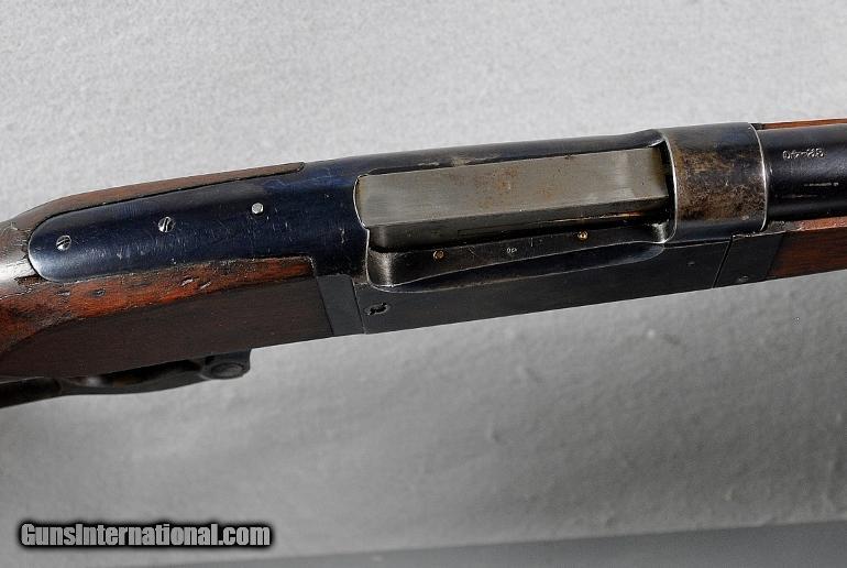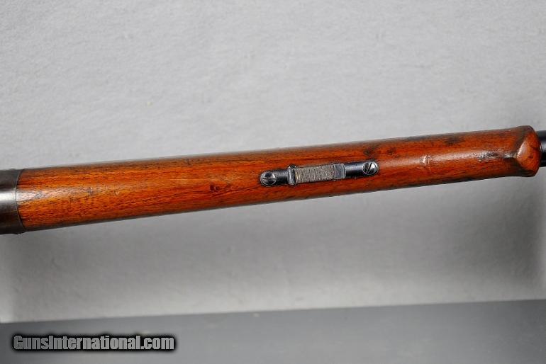 Description: Savage, lever action TAKEDOWN rifle, Model 1899TD, caliber .32-40, s/n 92.373 (Mfg. 1909), FRESH FROM A PRIVATE 99 COLLECTION, RECEIVER: TAKEDOWN, internal rotary magazine, brass cartridge counter and magazine follower, loaded cocking indicator on top tang, safety by lever, factory drilled and tapped for tangent sight, retains 75% of original blue with normal carry wear, lever exhibits moderate tarnish from handling, BARREL: length 22”, EXCELLENT BORE, open rear sight adjustable for elevation, Rocky Mountain front sight, retains 60% of original blue with a couple of areas of moderate to heavy carry wear, STOCK: Walnut, STRAIGHT GRIP, factory 13” L.O.P. over shotgun buttplate, Schnabel forearm, retains 60% of original finish with moderate normal handling marks, small chip and repairable crack in forearm, characteristic small crack behind top tang, TAKEDOWN RELEASE ON CENTER BOTTOM OF FOREARM, NICE CLASSIC TAKEDOWN RIFLE, Retail value $1000.00, Sale priced at $895.00 SOLD Curio/Relic: Yes |