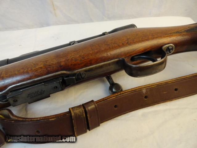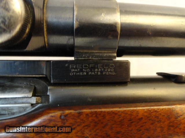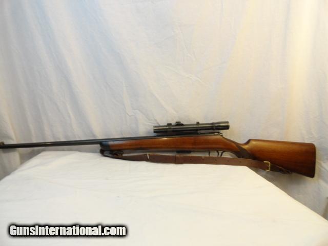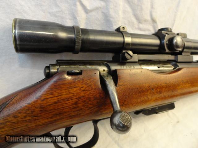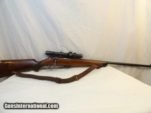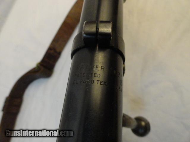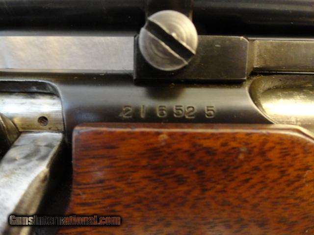 A wonderful bolt action pre war rifle in the wonderful .22 Hornet cartridge. Nice walnut hand checkered stock with no cracks.Deluxe with black forend tip and stock. Almost all of original blue intact. Mint bore and action. This is one slick rifle. In addition, there is a vintage Weaver K2.5