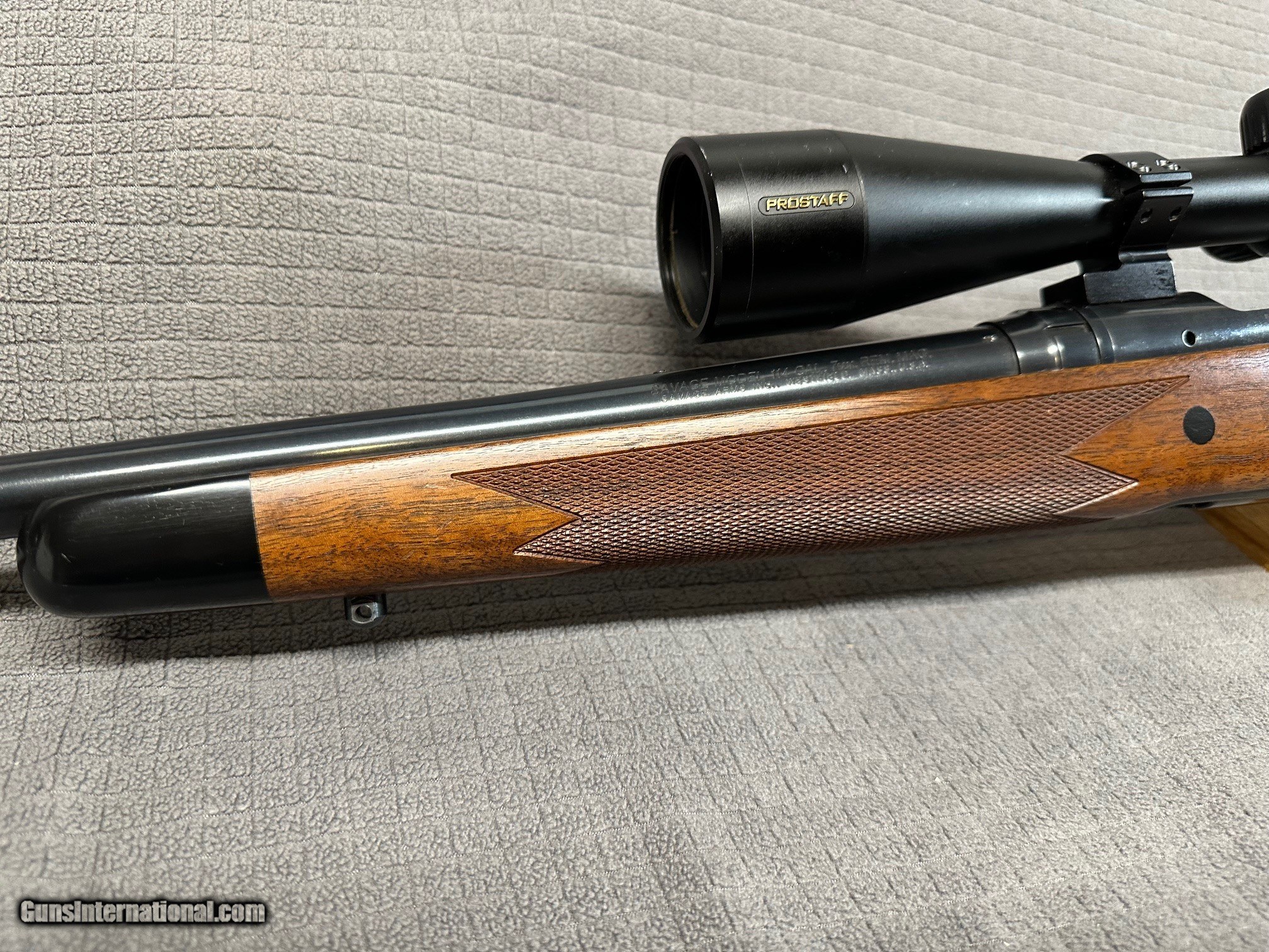 Description: VERY NICE Savage 114 American Classic in 7mm Rem. Mag. Nice looking American walnut Monte Carlo stock with cheekpiece. Nice, sharp cut checkering and black foretip cap. Wood is 98%. High polish blue is 95%+ due to a number of fine scratchs on the barrel and some wear on muzzle.. This was Savage's highest grade model. This 7 rem. Mag has a 24" barrel. Sights are removed and holes plugged. Bore is excellent. Equipped with the ACCU TRIGGER. Hinged floorplate magazine. This rifle is topped with a Nikon Prostaff 4-12X 40mm scope in excellent shape and mounted in quality Talley 1-piece mounts. RIFLE LESS SCOPE is $550.00. Overall, a pretty nice looking rifle. Shipping and insurance is $50.00 to your FFL(lower 48). NO CA Sales. Thanks for looking. SOLD |