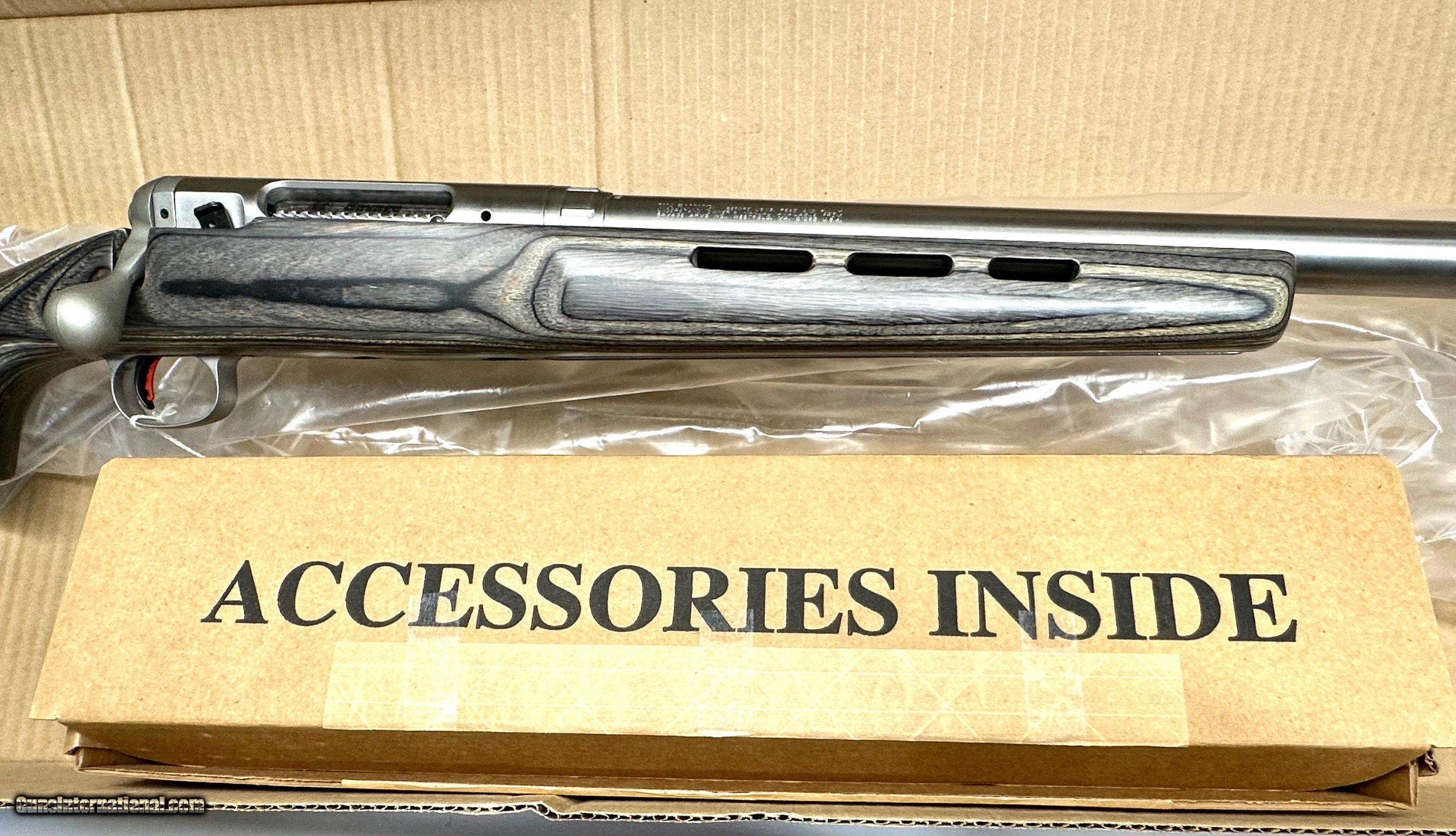 Description: 12 F/TR Gain an edge in any competition. The Model 12 F/TR is designed for unparalleled accuracy at extreme distances, thanks in part to a user-adjustable Target AccuTrigger™ that allows the shooter to fine-tune pull from 6 ounces to 2.5 pounds. The 30-inch, full-profile stainless steel barrel is button rifled and perfectly balanced with the wood laminate stock. The 12 F/TR includes an oversized bolt handle and single-shot Target Action. Flat 75.00 shipping (its heave and bulky) Price reflects a 3% cash discount Maine residents must add 5.5% sales tax SOLD Rifle Caliber: .308 Winchester Manufacturer: Savage Model: 12 F/TR Serial Number: H107533 Barrel Length: 30 Condition: New Old inventory Metal Condition: New Old inventory Wood Condition: New Old inventory Bore Condition: New Old inventory Action: Bolt Finish: Stainless Steel Extras: In box with all accessories Item Location: Buxton Maine |