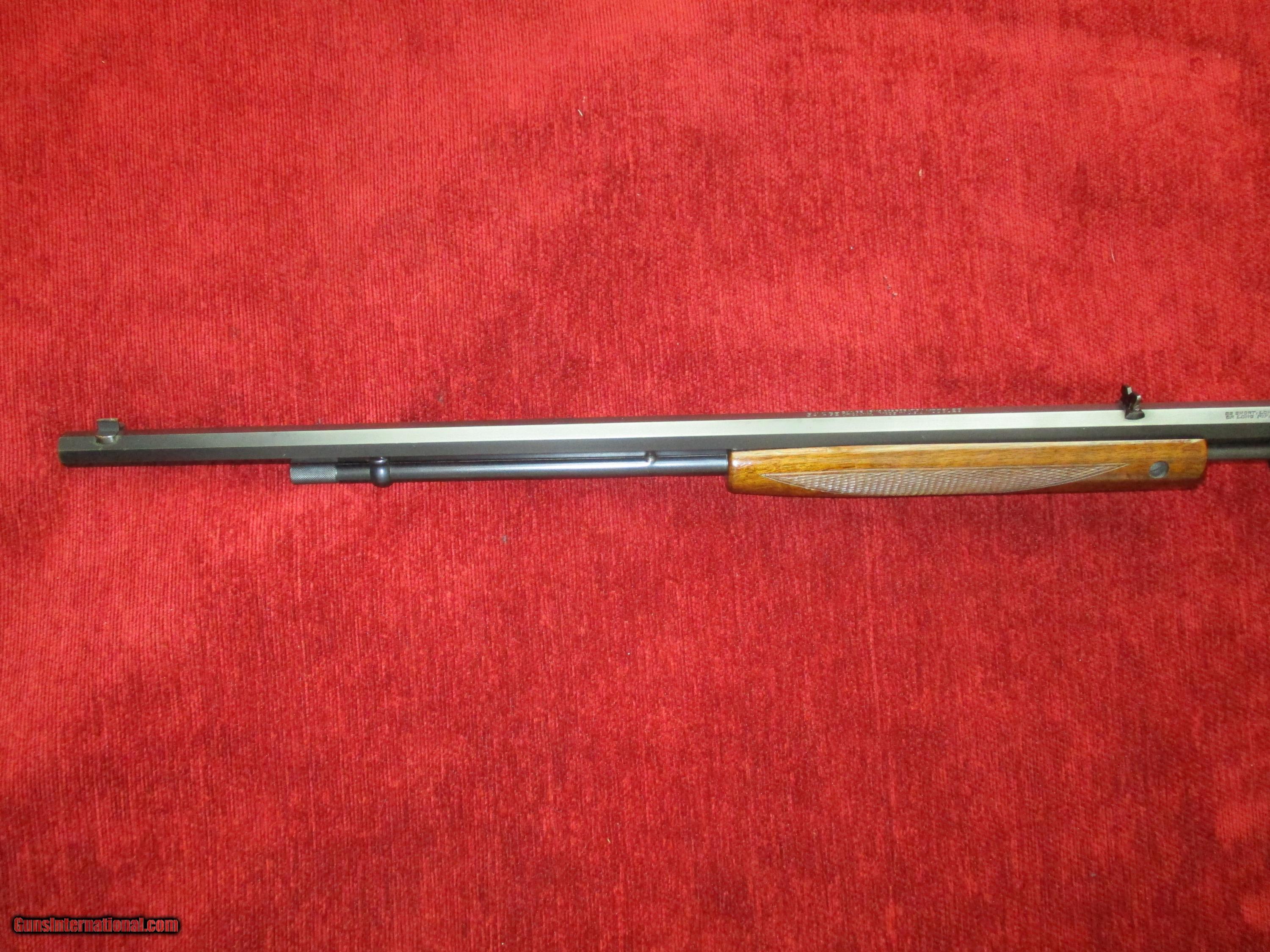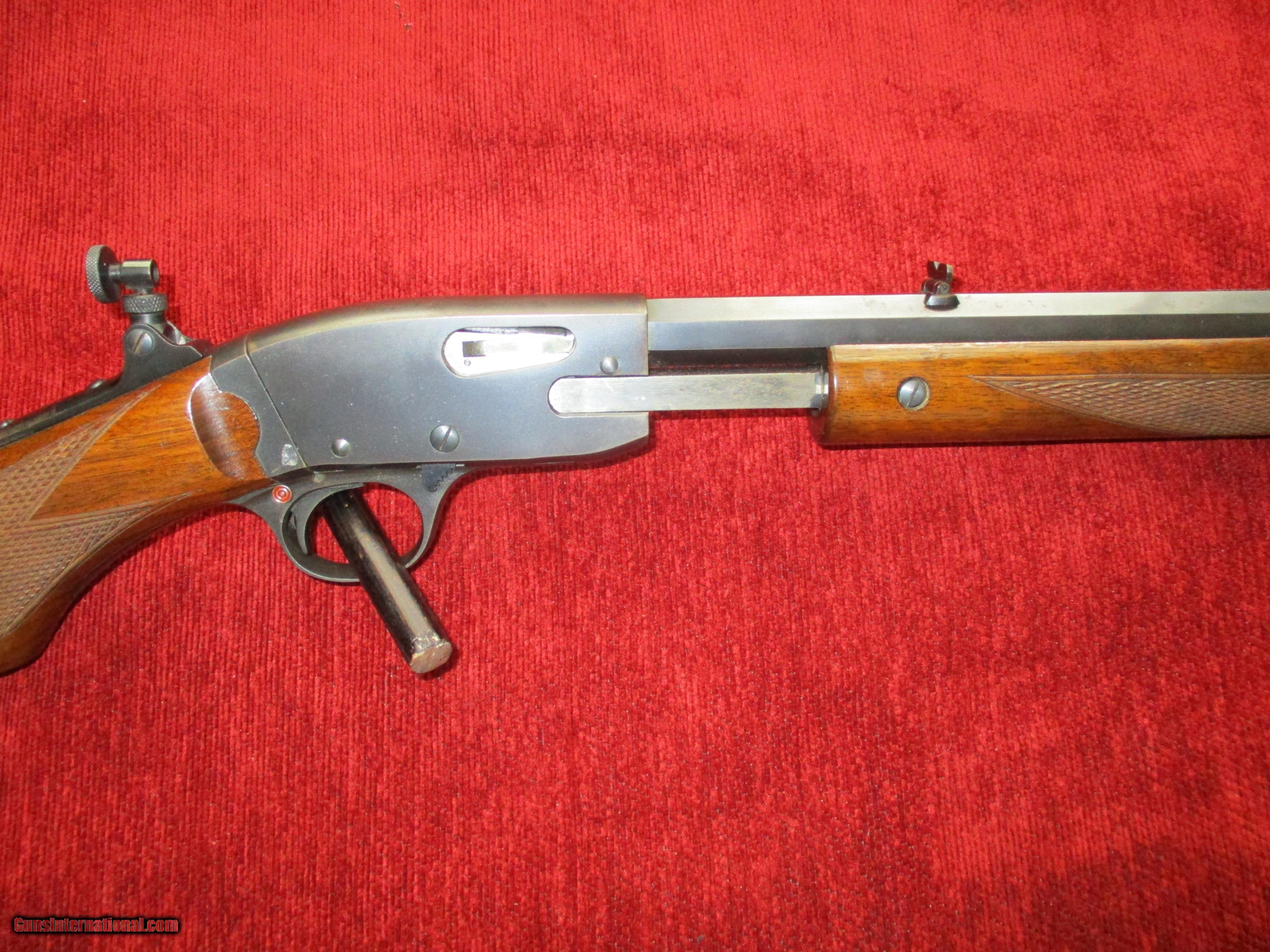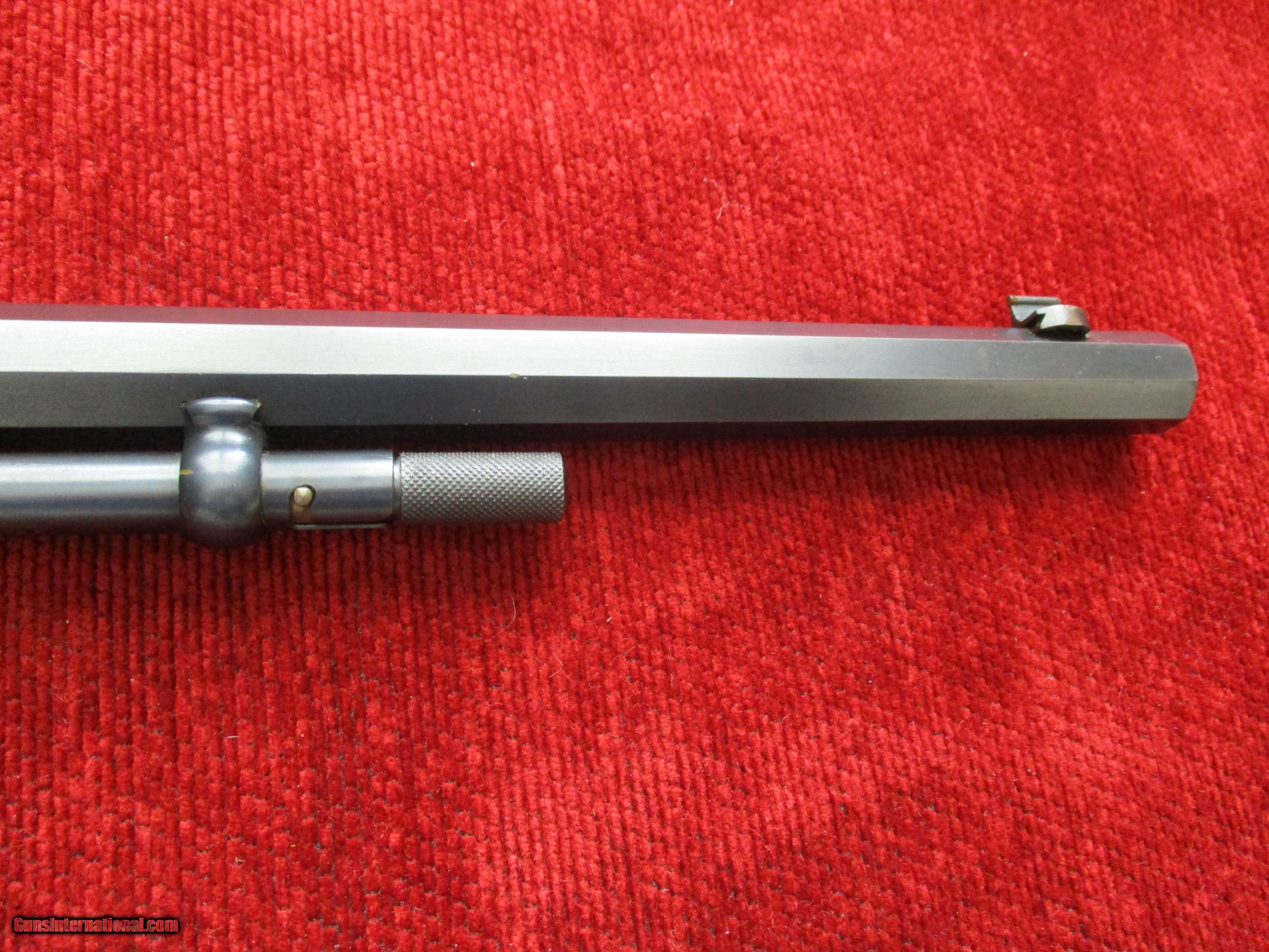 Description: 22" octogon, blade insert front, folding rear, factory tang pop-up peep sight, exotic checkered American walnut stock & forearm, 99% original blue & varnish finish, minor handling, bright, shiny, vivid bore, (nicest one encountered 38yrs.in gun business)!! SOLD |