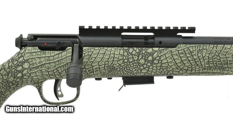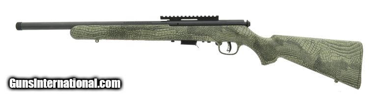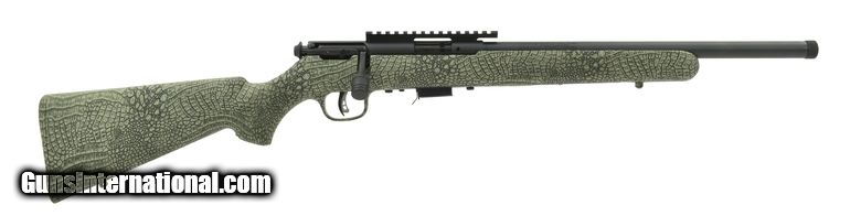Savage 93 .22 WMR caliber rifle. Bolt action Magnum with threaded barrel and synthetic camo stock.