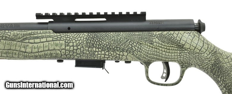 Description: Savage 93 .22 WMR caliber rifle. Bolt action Magnum with threaded barrel and synthetic camo stock.