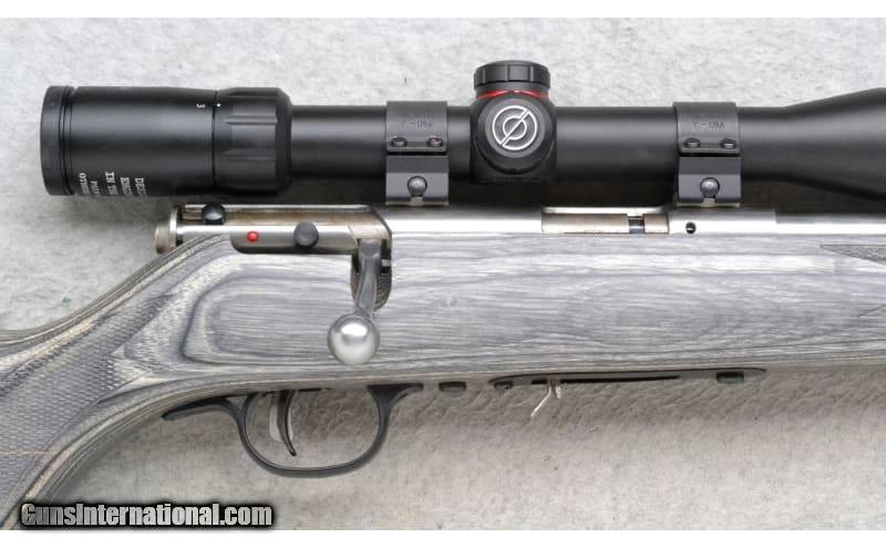 Description: This Savage Model 93R17 is a right hand bolt action rifle in .17 HMR Cal. It has a 21 inch heavy stainless steel barrel. It is outfitted with a Simmons 3-9x32 Scope. The butt stock is a checkered grip hardwood pistol grip. The forearm is a checkered grip hardwood. It has the Savage AccuTrigger. .17 HMR SOLD Chambers: Detachable Magazine. Metal Condition: Excellent. Wood Condition: Excellent. Bore Condition: Excellent. Barrels: 21 inch heavy stainless steel. Triggers: AccuTrigger Stock Dimensions: LOP 13 1/2 inches. Fore End: Checkered grip hardwood laminate. Butt Pad: Grooved black plate. Weight: 7 lb. 8 oz. Sights: Simmons 3-9x32 Scope. Item Location: Richfield, WI |