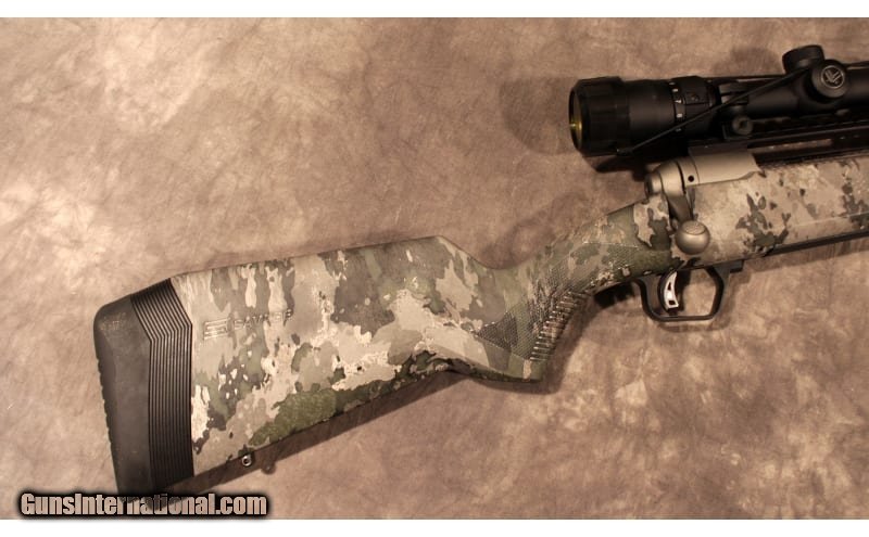 Description: A Bass Pro Shops and Cabela's Exclusive! The Savage Arms® 110 VSX Hunter XP Bolt-Action Rifle with Vortex Diamondback Scope Combo offers shooters a reliable and versatile bolt-action rifle that's well suited for hunting, target practice, or tactical shooting. The 110 VSX Hunter model comes with an injection-molded synthetic stock that allows you to quickly adjust length-of-pull from 12.75"–13.75". A factory-installed, Picatinny rail provides a solid attachment point for the included Vortex® Diamondback™ Scope. An oversized bolt handle facilitates working the action when you're in a hurry, keeping your hand clear of optic. Savage's AccuTrigger® is user adjustable to obtain a light, crisp release with no creep. A lever mounted within the trigger body blocks the sear unless the trigger is intentionally pressed in the center, reducing the risk of a negligent discharge. The medium-contour barrel is fluted and threaded for attaching aftermarket suppressors or muzzle brakes. The basic bolt design assures that the locking lugs fully contact the receiver, holding the headspace to a minimum every time the bolt is locked. The Savage 110 VSX Hunter Bolt-Action Rifle utilizes a detachable magazine to facilitate loading and unloading, and the 3-position safety allows the chamber to be loaded and unloaded with the safety engaged. Made in USA. Synthetic stock adjusts for LOP Factory-installed Picatinny rail Fully adjustable AccuTrigger 4-round detachable magazine Fluted medium-contoured barrel Oversized bolt handle 3-position safety Threaded muzzle Cerakote on barrel and action VSX camo on stock Includes Vortex Diamondback 4-12x40 scope .30-06 Springfield SOLD Barrels: 5/8x24 threaded barrel Triggers: Accutrigger Weight: 9 pounds Sights: Factory mounted Vortex Diamondback 4-12x40 Item Location: Bossier City, LA |