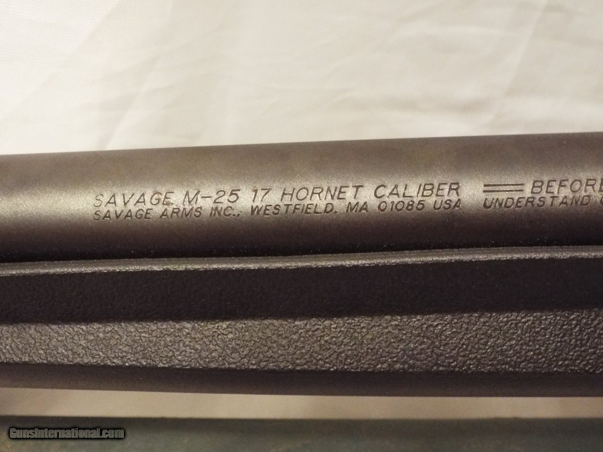 Description: Guns Listing ID: 1297339 Savage Arms, 25 Walking Varminter, Bolt Action, 17 Hornet, 22\" Barrel, Matte Finish, Black, Black Polymer Stock, AccuTrigger, Detachable Box Magazine, 4 Rounds, Right Hand Excellent condition Includes Scope Ring/Mounts SOLD Manufacturer: SAVAGE ARMS Model: 25 Caliber Info: .17 HORNET Condition: Used - Non-Certified Barrels: 21 BARREL Finish: SYNTHETIC |