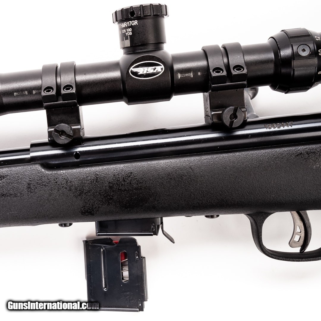 Description: Guns Listing ID: 350366 The Savage Arms Model 93R17 is an affordable rimfire rifle ideal for small game hunting and recreational shooting. Savage Arms is known for its precision barrels, which maximize the effectiveness of the high-velocity 17 HMR cartridge. This 93R17 has a BSA 6-18x40 Sweet 7 scope and a bi-pod. It's in very good condition and comes with two 5-round magazines. SOLD Manufacturer: SAVAGE ARMS Model: 93R17 Caliber Info: .17 HMR Condition: Used - Certified Barrels: 21 BARREL Finish: BLACK |