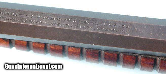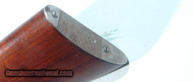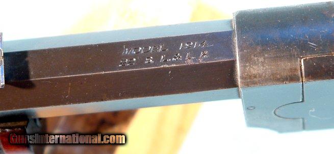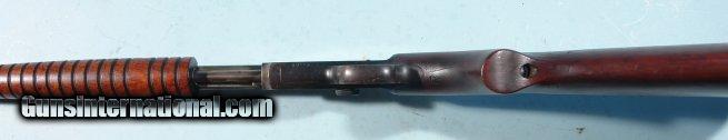 Description: SAVAGE ARMS CO. MODEL 1914 TAKEDOWN .22 LONG, SHORT AND LONG RIFLE PUMP RIFLE, CIRCA 1914-24. Serial number "301XX". 24" octagonal barrel with factory sights(rear "Savage Arms…..1914"). Mint bore and rifling. 90% original blue remaining. Magazine tube fully functioning with original plunger and spring tension. Some blue missing where forend slides forward and backward. Forend excellent with almost no signs of handling. Screw unturned. Takedown receiver with 80% original blue with balance a mottled finish(see photos). Some areas of surface rust on top but no pits or salt and peppering(will clean to excellent). Takedown knob only used once or twice excellent. Original buttstock finish like new and never sanded. Slight hairline to right wrist with no losses(just needs some TLC and a bit of glue and will disappear). Original steel buttplate with unturned screws. SOLD Curio/Relic: Yes |