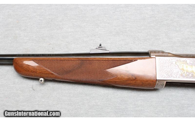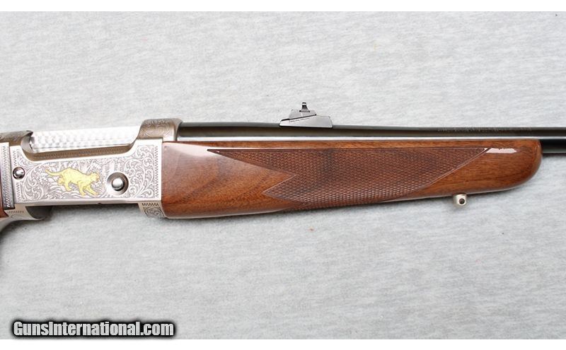Description: Savage 99 Centennial Edition in .300 Savage. Introduced in 1995 this limited-edition Model 99 was limited to 1,000 rifles. It features a fixed front ramp sight and adjustable Williams rear sight. The left side of the barrel is marked " SAVAGE 99 CE CENTENNIAL EDITION CAL. 300 SAV." over the one-line address. The top of the receiver is drilled and tapped for scope blocks. The trigger and safety are gold washed. The barrel is blue while the remainder of the rifle is coin finish with a jeweled bolt and scroll engraved receiver with a gold inlayed mountain lion in a wooded scene on the right side and a gold inlayed elk in a wooded scene on the left side. Select American walnut checkered forearm and pistol grip stock with a Monte Carlo Comb, black plastic grip cap with the Savage logo, red rubber recoil pad and sling swivel studs. Complete with a nice walnut-stained presentation case with, Centennial plaque on the lid, polished brass hardware and padded hunter green velvet liner. .300 Savage SOLD Metal Condition: Excellent Wood Condition: Excellent Bore Condition: Bright Barrels: 22 Inches Triggers: Factory Stock Dimensions: LOP 13 3/4 Inches Fore End: Checkered Walnut Butt Pad: Hard rubber pad Sights: "Front blade on ramp, Williams rear adjustable notch sight Item Location: La Vista, NE |