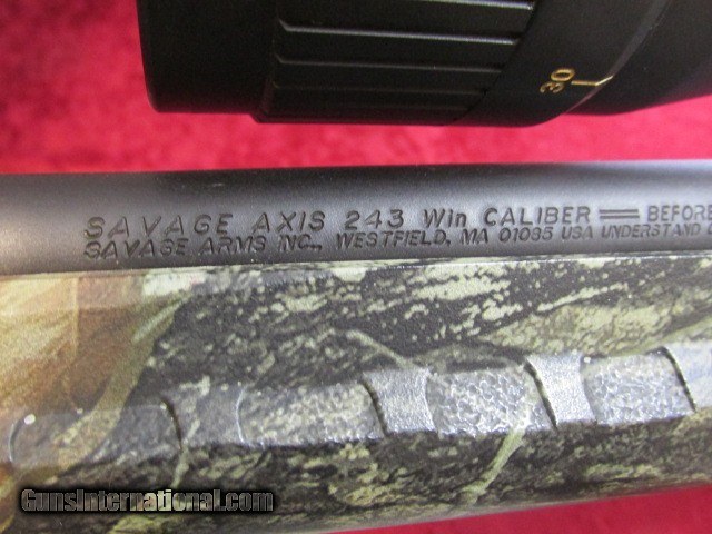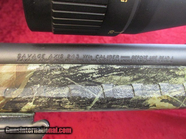 Description: Savage Axis CAMO bolt action .243 rifle with scope & bipod This used Savage Axis is in excellent condition. Has A1 Optic 8-32x50R scope with rings. Comes with Champion Target Adjustable Bipod (13.5" - 23") = $50 value and updgraded bolt handle. See pictures of actual item you will receive.