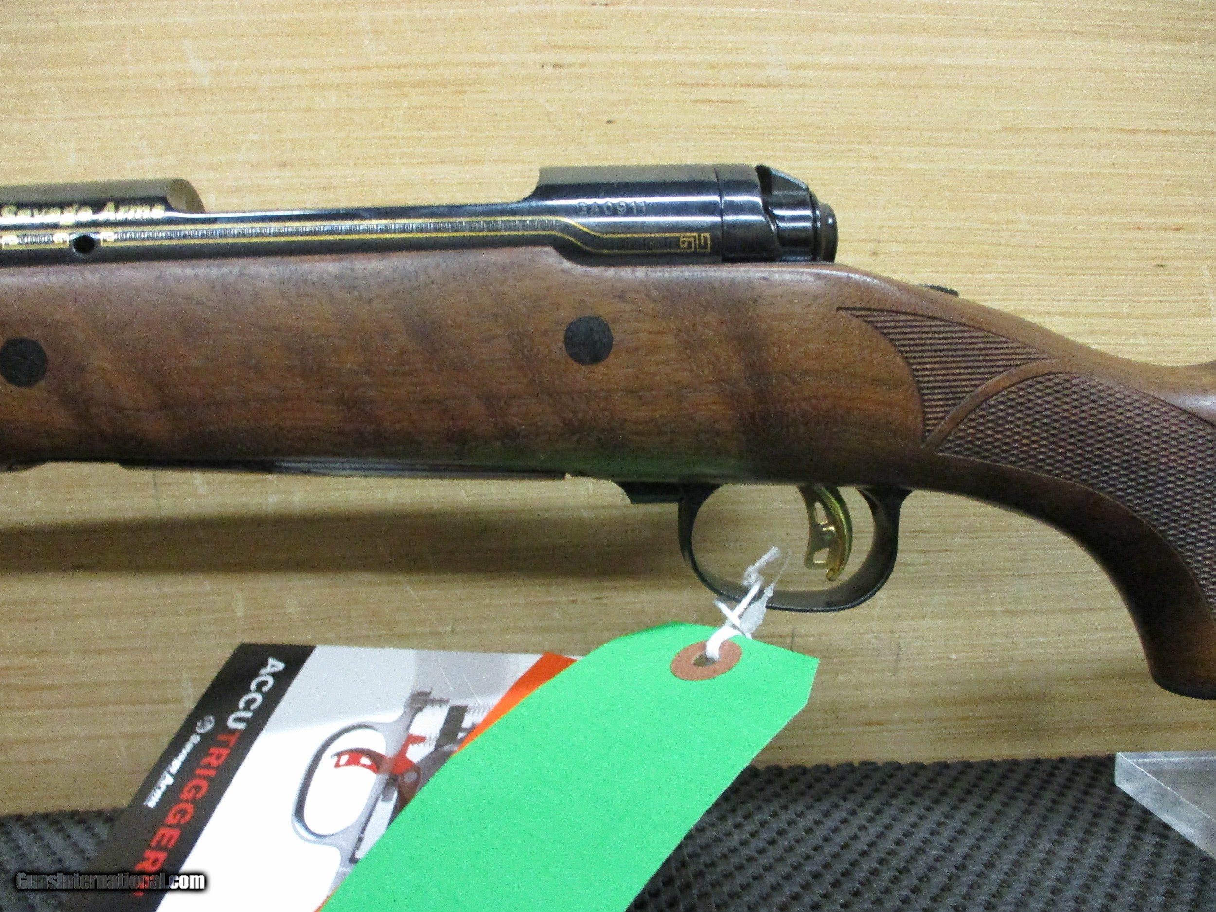 Description: CONSIGNMENT NEW IN BOX SAVAGE MODEL 10 50TH ANNIVERSAY .300 SAVAGE Limited Edition: 1 of 1,000 NIB, unfired and perfect in everty detail, with Savage custom fitted & zippered semi-rigid case Stock: nicely figured American walnut. Metal Work: highly polished, blued finish with engraving and 24-karat inlaying Barrel: 22" alloy steel Rate of Twist - 1:10 Scope mounts: drilled & tapped receiver rings Trigger: Savage AccuTrigger, adjustable Magazine Capacity: 4+1 (hinged floor plate) Length of pull: 13-1/4" Overall length: 42" ****PLEASE CALL IN THE WITH THE SELLER’S INVENTORY NUMBER IF INQUIRING ABOUT A FIREARM****** WE DO NOT SHIP FIREARMS AND/OR FIREARMS’ PARTS OUT OF THE 50 UNITED STATES, SO DON’T ASK—YOU NEED TO KNOW IF FIREARM IS LEGAL FOR YOUR STATE PRICE REFLECTS PAYMENT BY MONEY ORDER / CASHIERS CHECK. A 3% PREMIUM IS ADDED FOR CREDIT CARDS. WE DO ACCEPT PERSONAL OR BUSINESS CHECKS, BUT THERE IS A GRACE PERIOD OF 10 BUSINESSS DAYS ON THEM. Shipping is $60 for handgun and $50 for long gun. Shipping to Alaska and Hawaii will be more based on weight of firearm. USPS SHIPPING IS HIGHER. WE DO OFFER LAYAWAY PLANS FOR 30,60, OR 90 DAYS.NOT ON CONSIGNMENT GUNS THERE IS A $5.00 CHARGE FOR EVERY 30 DAYS ITEM IS ON LAYAWAY. WE ALSO REQUIRE A 20% DOWN PAYMENT ON TOTAL OF LAYAWAY SALE. LAYAWAYS ARE NON- REFUNDABLE. HERE IS HOW THIS PROCESS WORKS. YOU WOULD CALL US AT 540-337-9218 WITH LISTER # TO PURCHASE THE GUN. THEN ONCE I HAVE RECEIVED PAYMENT AND AN FFL (FEDERAL FIREARMS LICENSE) FROM A LICENSED DEALER IN YOUR AREA OF YOUR CHOICE. WE WILL THEN SHIP THE GUN TO THEM. YOU WOULD THEN PICK UP THE GUN AT YOUR LOCAL DEALER AND DO PAPER WORK THERE. Please have your FFL Dealers contact information when you call. DOMINION OUTDOORS 15 ANGELA COURT FISHERSVILLE, VA 22939 540-337-9218 540-337-2422 fax M – F 9 a.m. to 6 p.m. ETZ Sat 9 a.m. to 4 p.m. ETZ ****PLEASE CALL IN THE WITH THE SELLER’S INVENTORY NUMBER**** ***PLANO HARD CASES AVAIABLE FOR PURCHASE $25.00 WITH THE PURCHASE OF A FIREARM** *** Online prices compared to in store prices will vary. *** SOLD |