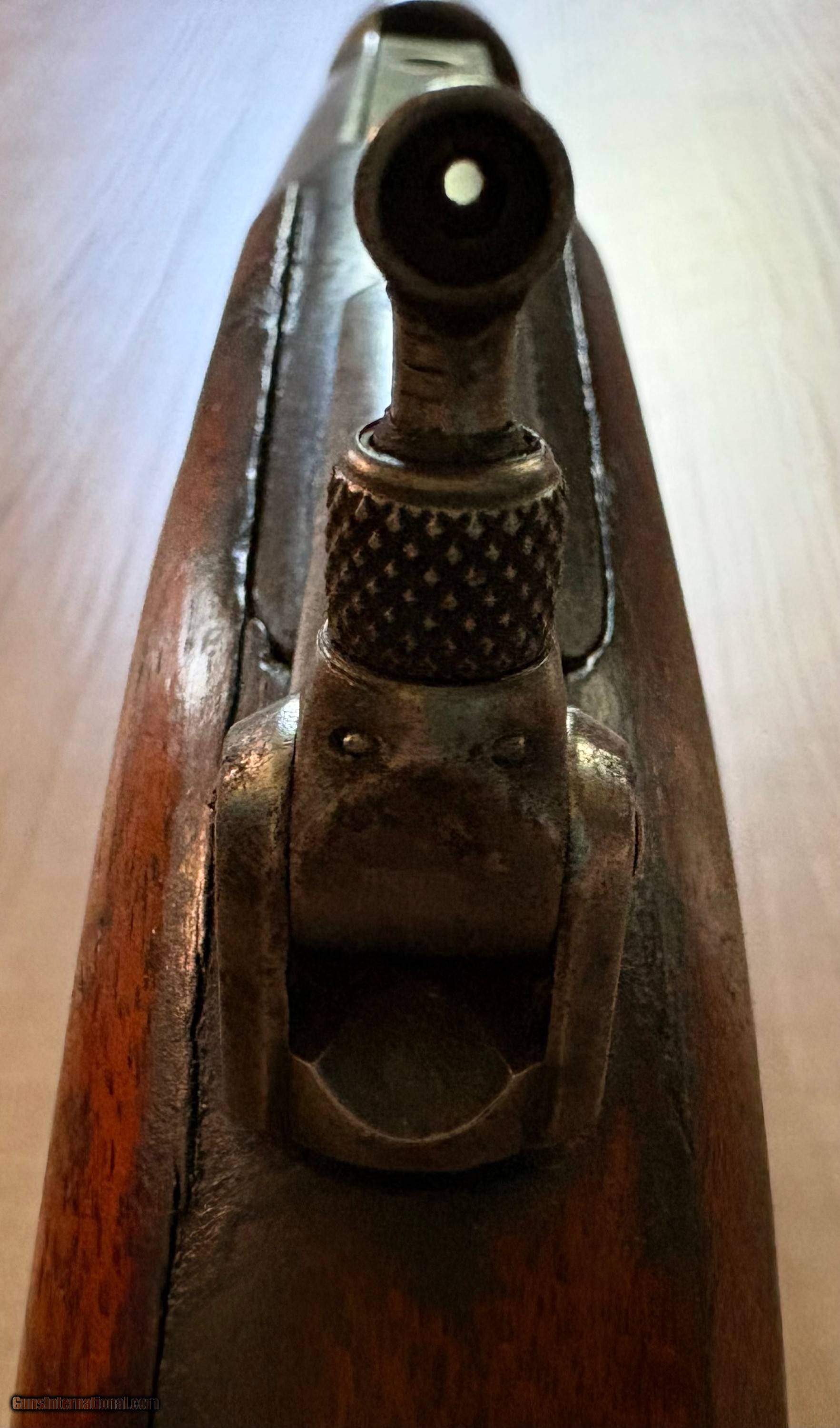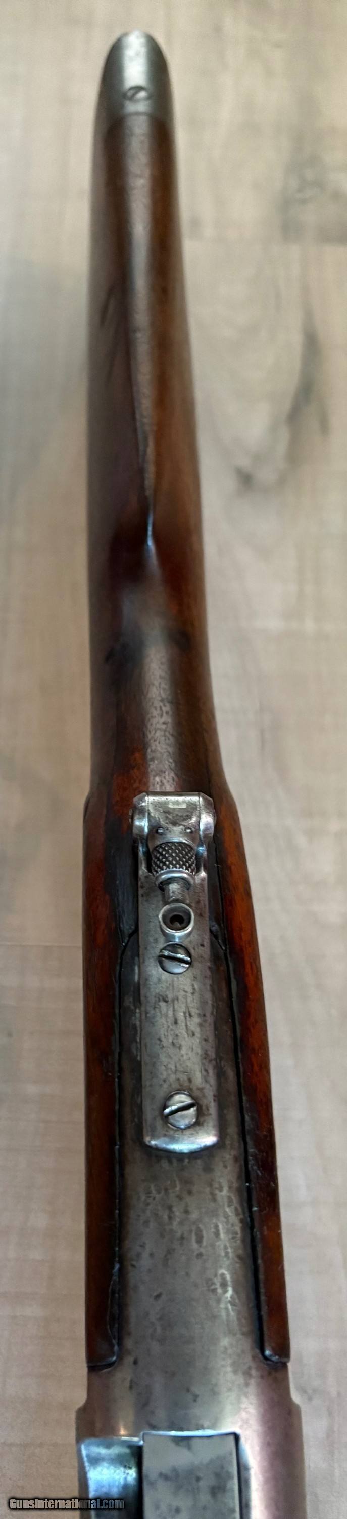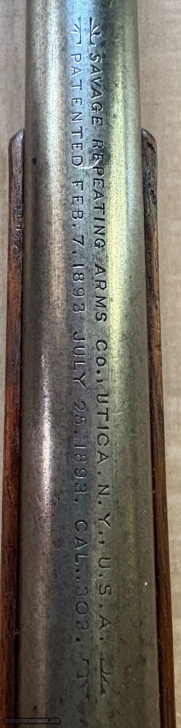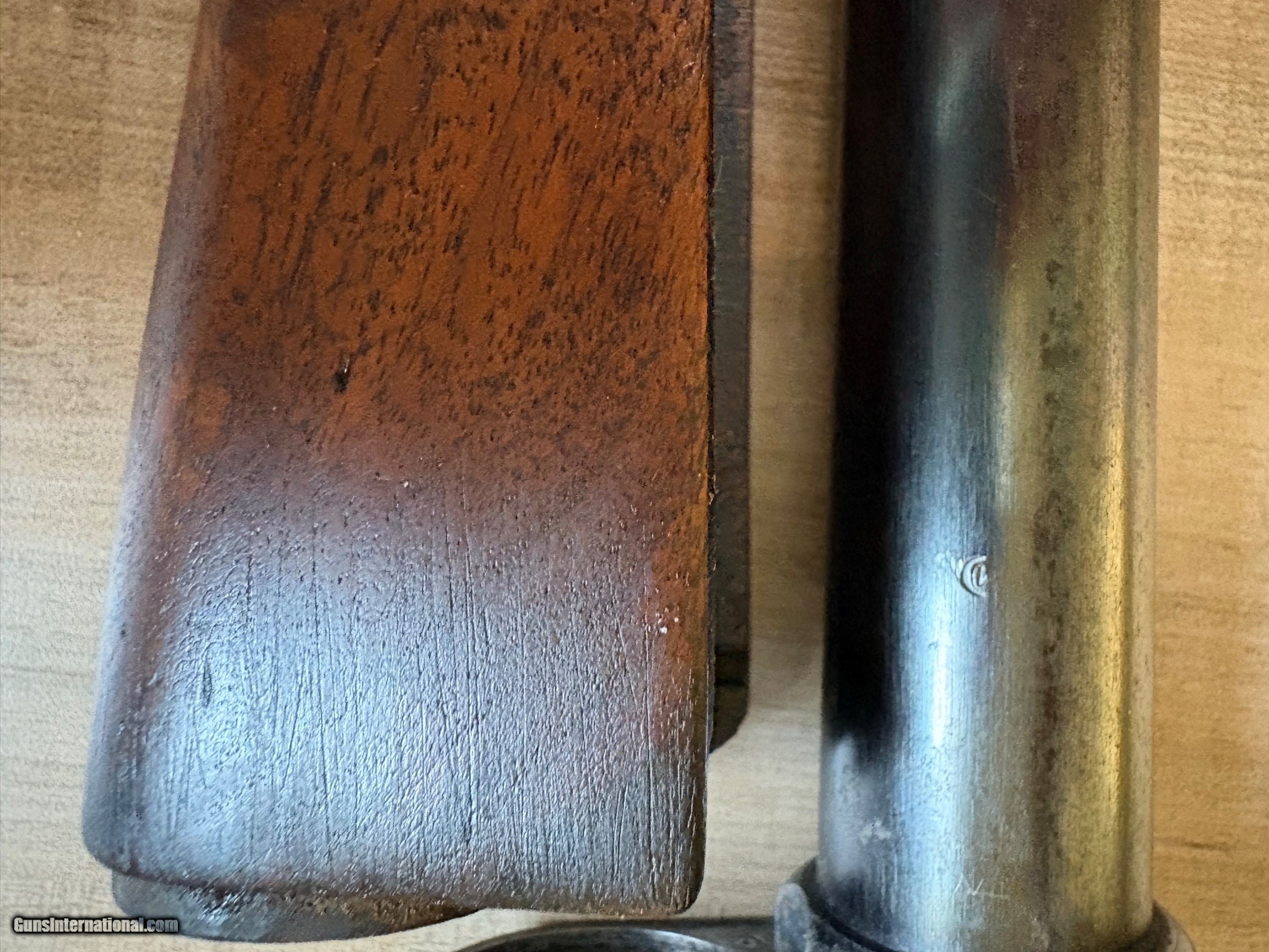 Description: This is a nice antique Savage 1895 rifle. The butt plate and stock match the serial number on the receiver as number 4537. The round 26 inch barrel has the JM stamp for the Marlin Co. that made the barrel. The bore is shiny with excellent rifling. The safety and cocked indicator is the hole in the top of the bolt and works correctly. The brass cartridge indicator on the side of the receiver shows the number of shells in the receiver. The barrel has faded blue patina and the receiver is clear with no bluing. There are no pits or rust. The lever still has some of the case hardening. The forearm number doesn't match the serial number. The front sight is the original Marlin Shear number 9 Rocky Mountain sight. The rear sight is a blank because of the tang sight which is a number 18 Savage combination rear sight from Lyman number 1 combination tang sight. The action is strong and locks up tight with no slack in the lever. It will take a 90 grain bullet and out perform a 30-30. Shipping and insurance to your residence $60.00 SOLD Antique: Yes Rifle Caliber: .303 Savage Manufacturer: Savage Model: 1895 Serial Number: 4537 Barrel Length: 26 inches Condition: Good Metal Condition: Fair Wood Condition: Good Bore Condition: Excellent Sights: Lyman No. 1 Tang |