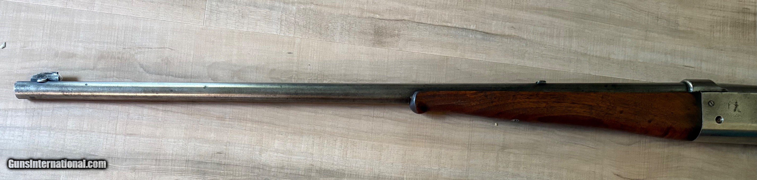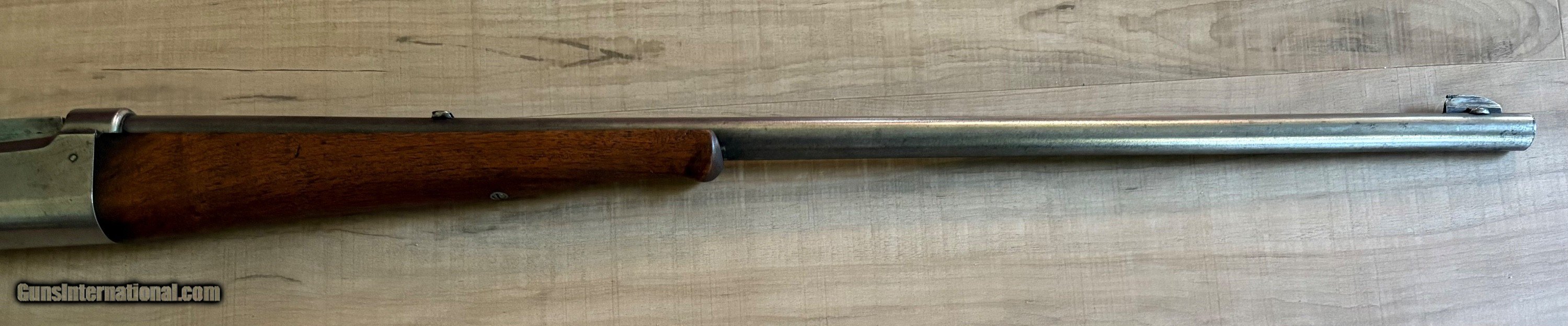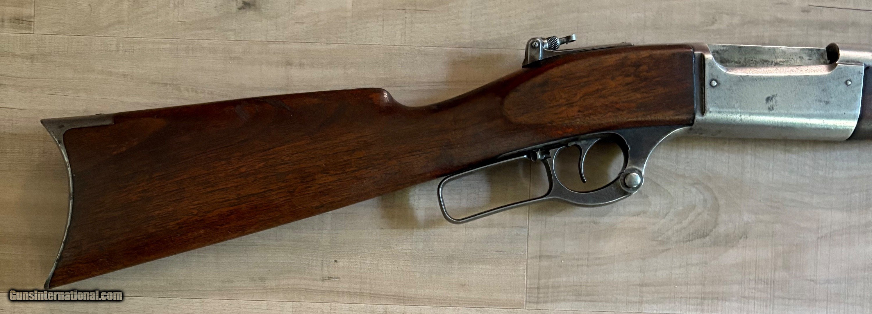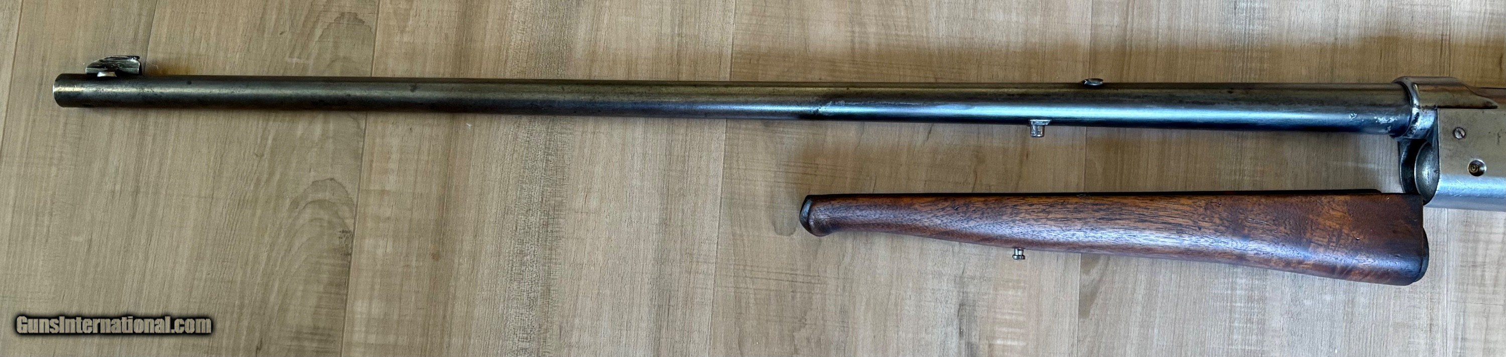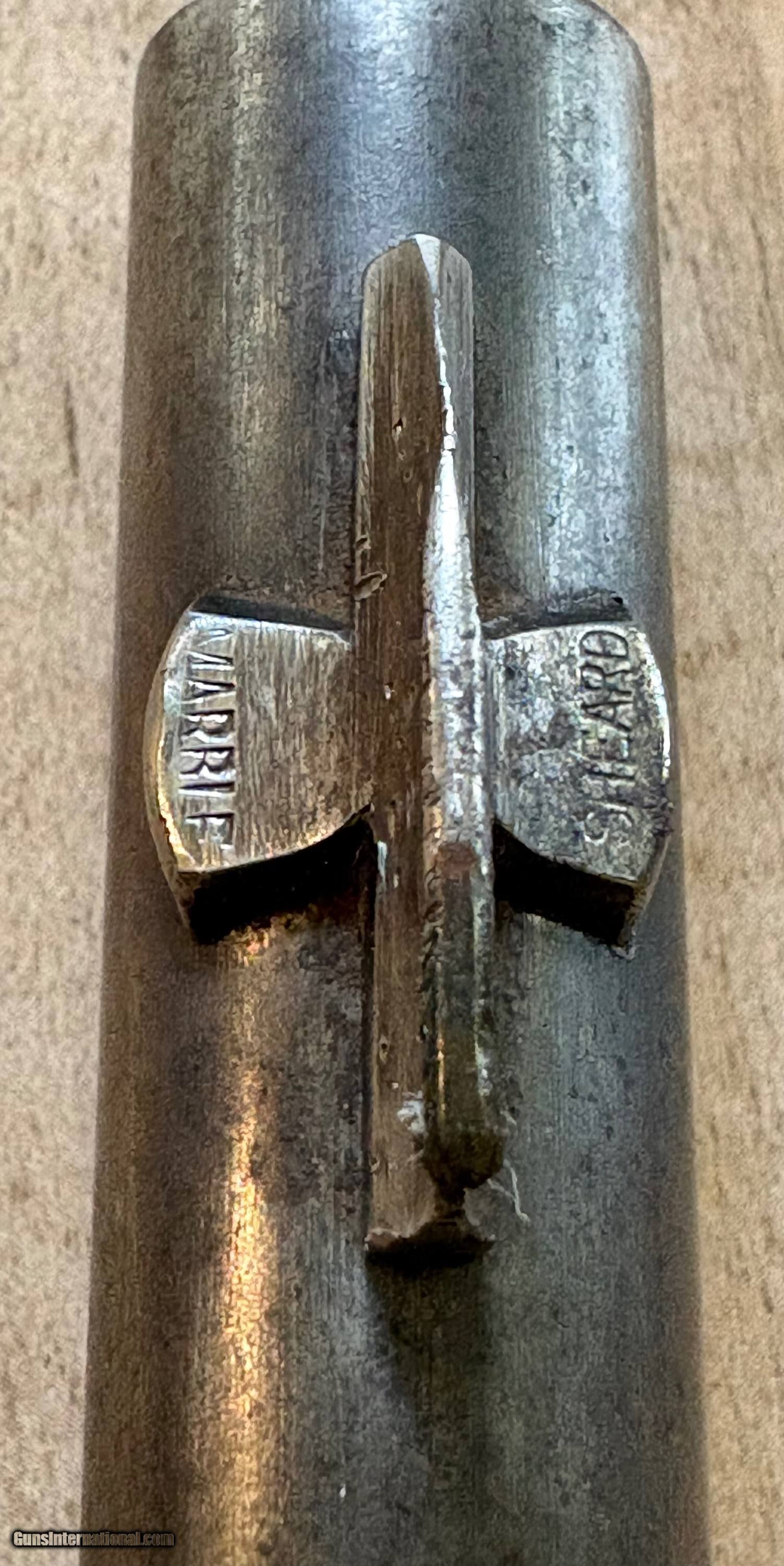 Description: This is a nice antique Savage 1895 rifle. The butt plate and stock match the serial number on the receiver as number 4537. The round 26 inch barrel has the JM stamp for the Marlin Co. that made the barrel. The bore is shiny with excellent rifling. The safety and cocked indicator is the hole in the top of the bolt and works correctly. The brass cartridge indicator on the side of the receiver shows the number of shells in the receiver. The barrel has faded blue patina and the receiver is clear with no bluing. There are no pits or rust. The lever still has some of the case hardening. The forearm number doesn't match the serial number. The front sight is the original Marlin Shear number 9 Rocky Mountain sight. The rear sight is a blank because of the tang sight which is a number 18 Savage combination rear sight from Lyman number 1 combination tang sight. The action is strong and locks up tight with no slack in the lever. It will take a 90 grain bullet and out perform a 30-30. Shipping and insurance to your residence $60.00 SOLD Antique: Yes Rifle Caliber: .303 Savage Manufacturer: Savage Model: 1895 Serial Number: 4537 Barrel Length: 26 inches Condition: Good Metal Condition: Fair Wood Condition: Good Bore Condition: Excellent Sights: Lyman No. 1 Tang |