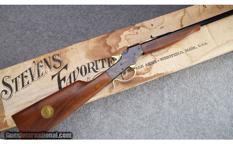 Description: This Stevens Model 71 "Favorite" is a commemorative celebrating "Joshua Stevens - Father of 22 Hunting". There were approximately 10,000 of these guns manufactured in 1971. This gun remains in excellent overall condition showing only some light wear to left receiver and gold-plated lever and butt plate. Gun has nice case coloring and blue. Complete with original box and paperwork. Box has much water damage but foam insert is still intact. .22 Short/Long/Long Rifle SOLD Metal Condition: Excellent Wood Condition: Excellent Bore Condition: Excellent Barrels: 22" Octagon Triggers: Factory Stock Dimensions: 12 7/8" LOP Fore End: Uncheckered Walnut Straight Grip - Uncheckered Walnut Schnable Forend Butt Pad: Crescent Brass Butt Plate Weight: 4 lb Sights: Blade Front - Adjustable Notch Rear Item Location: Wheeling |