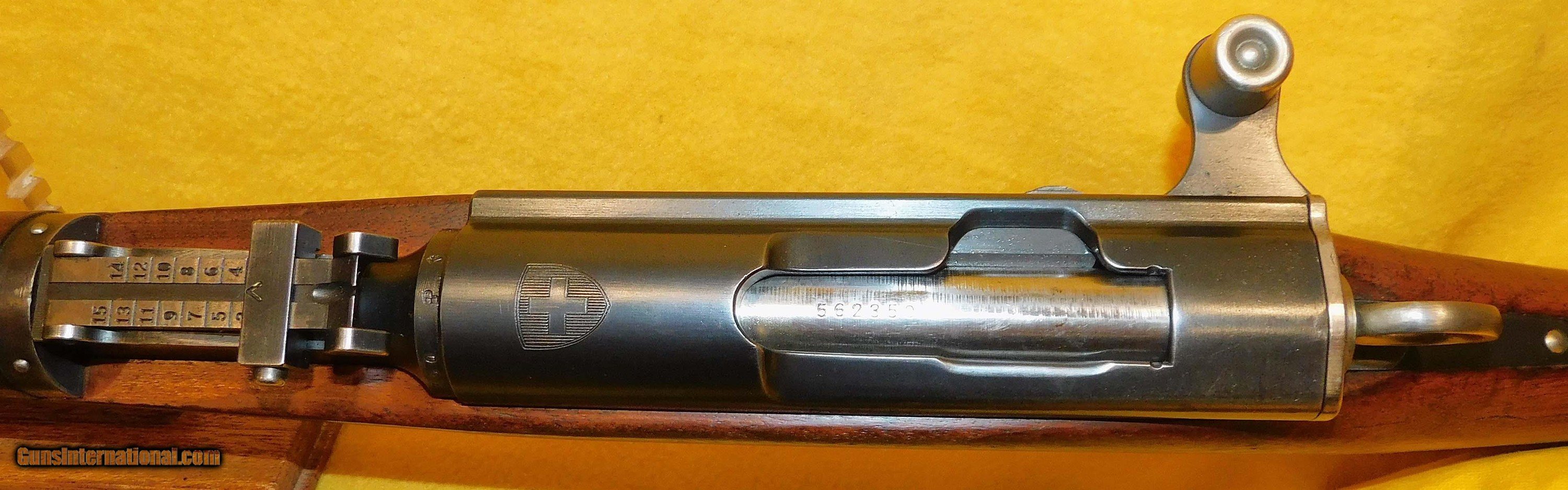 Description: SCHMIDT RUBEN K31 IN 7.5X55 SWISS CAL., WITH 26" BARREL. COLOR BLUE. CONDITION 95%+. SERIAL NUMBER 562350. SCHMIDT RUBEN MODEL K31 IN 7.5X55 SWISS CALIBER, MIRROR BORE WITH STRONG RIFLEING, STRAIGHT PULL BOLT, WOOD EXCELLENT, MUZZLE CAP, LEATHER PERIOD SLING, 95%+ OVERALL CONDITION, OUR STOCK # D4561 SOLD |