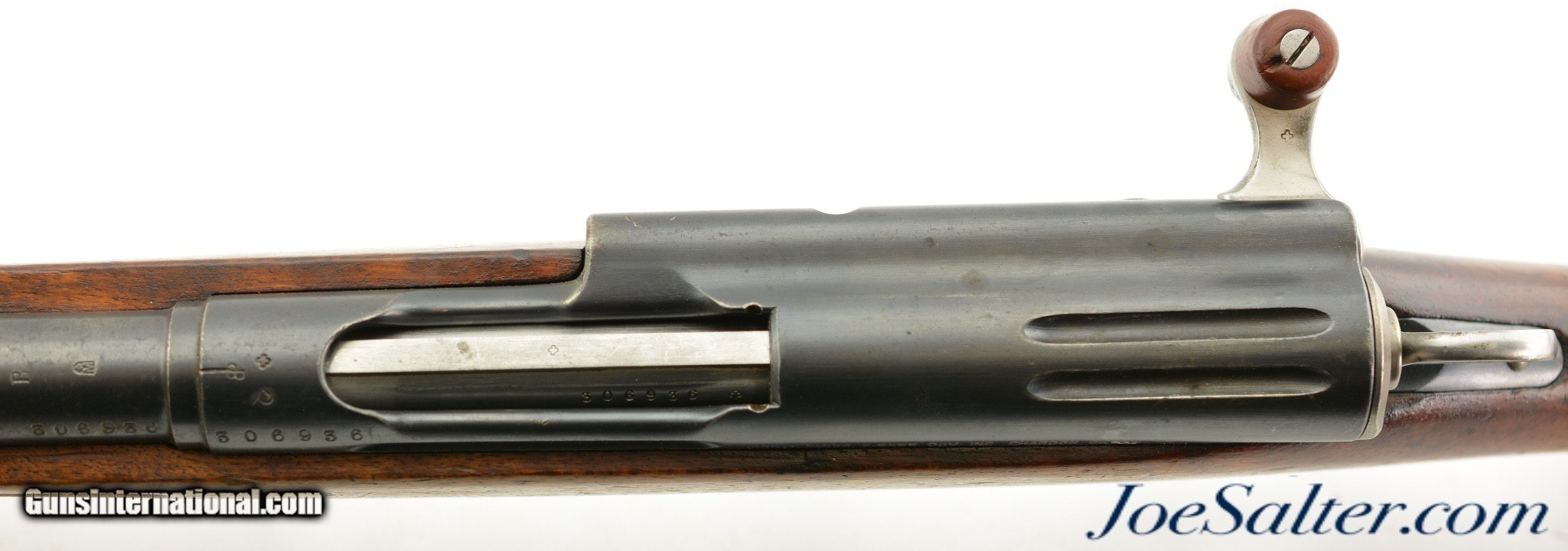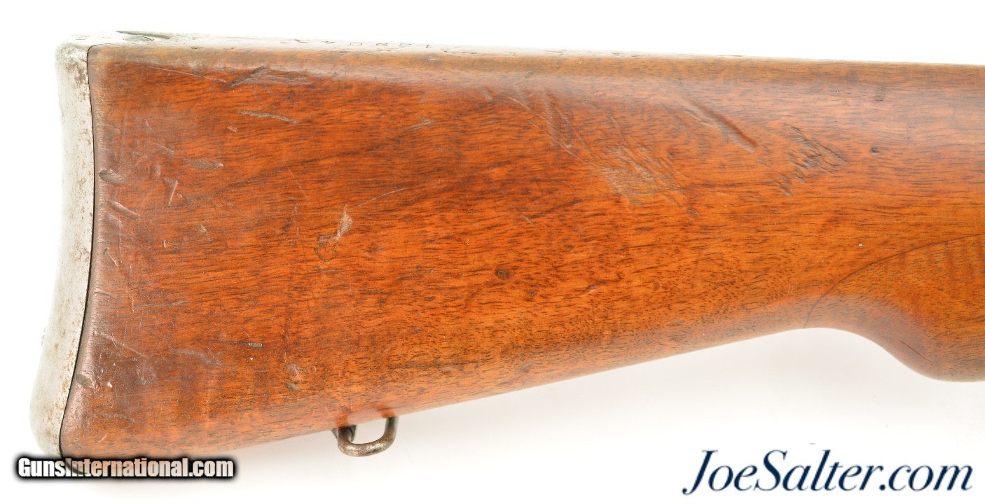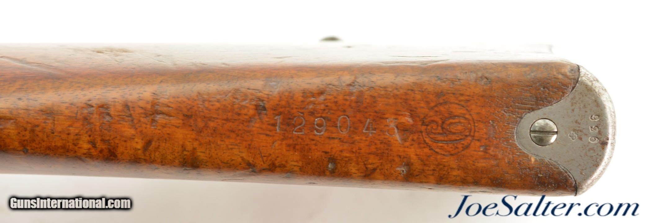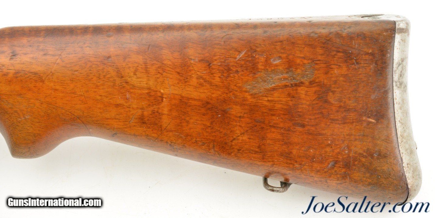 Description: Serial #306936, 7.5mm Swiss, 30 3/4" barrel with an excellent, bright bore. This rifle was made in 1904 and has matching numbers on the receiver, barrel, bolt, magazine, and buttplate, with the metal retaining 80-85% of the original blue finish that has silvered at the muzzle, faded to mottled gray along the high edges and projections, and also has a mild plum-brown patina starting to form on some spots as well. The bolt has a mostly bright gray patina, and the red-brown resin handle is intact. An import mark is present on the left side of the receiver. The wooden stock and handguard have an armory added finish over numerous small handling marks and minor blemishes throughout with a soft, but still visible, Swiss cartouche on the right side of the buttstock. Additional numbers are stamped onto the comb just ahead of the buttplate tang: "129043" and "6 (in circle)." An original steel and brass muzzle cover is also included. This is a very good-near fine example of a modernized, pre-Model 1911 Schmidt-Rubin, and would make a splendid addition to any collection of 20th century military rifles. FFL or C&R; Curio/Relic: Yes Price: $850.00 Contact Seller |