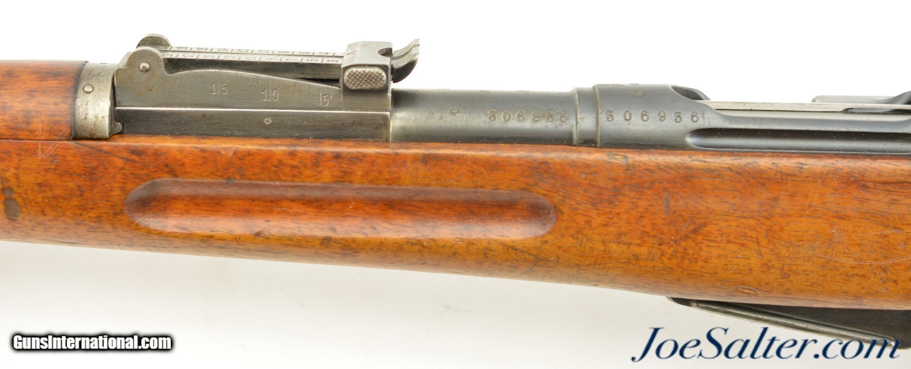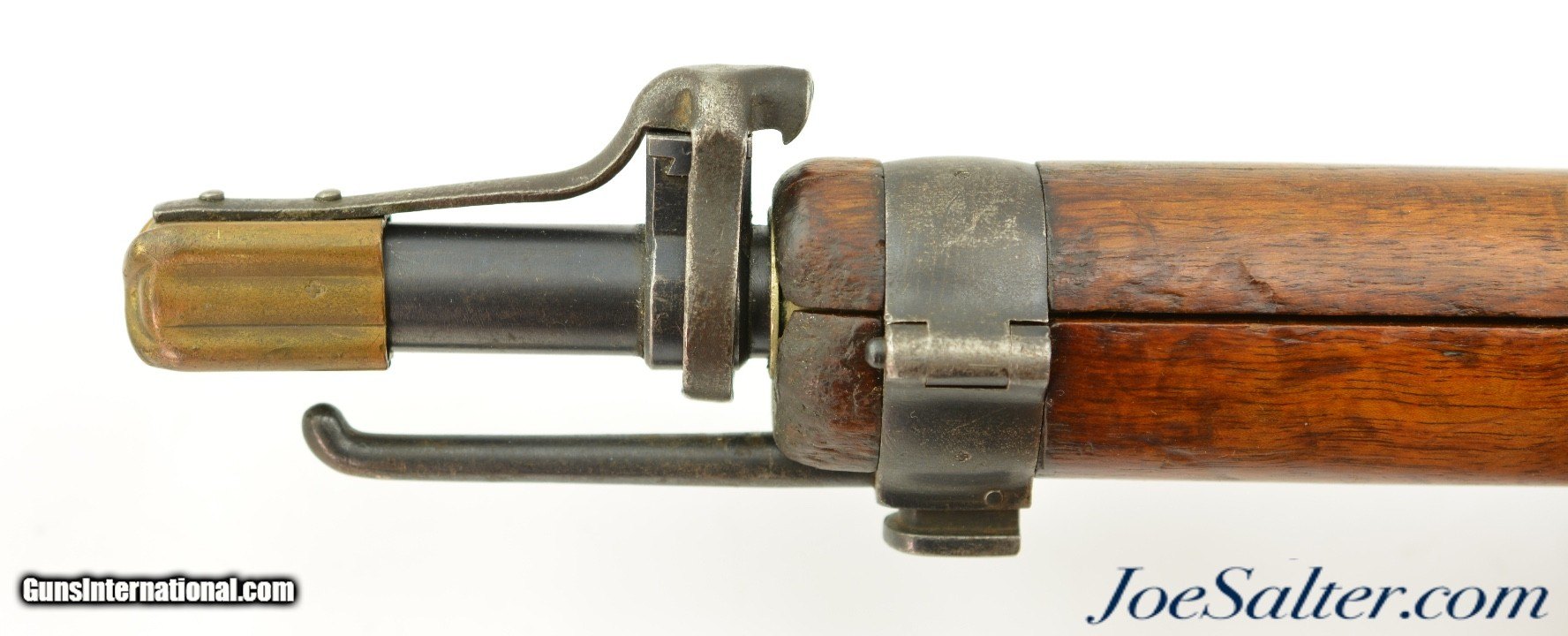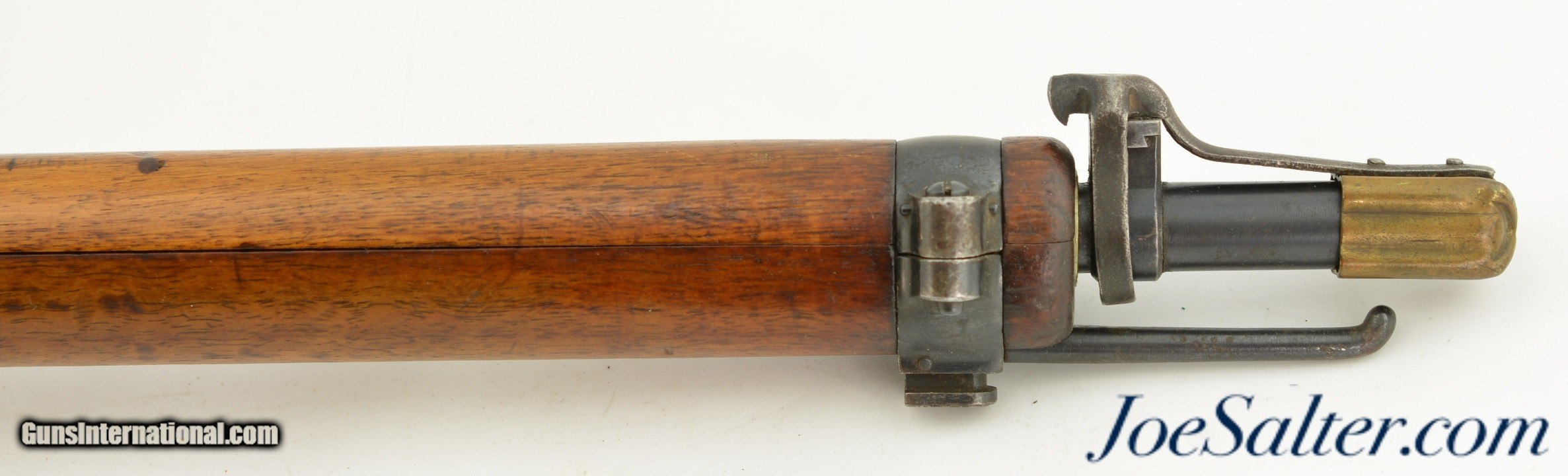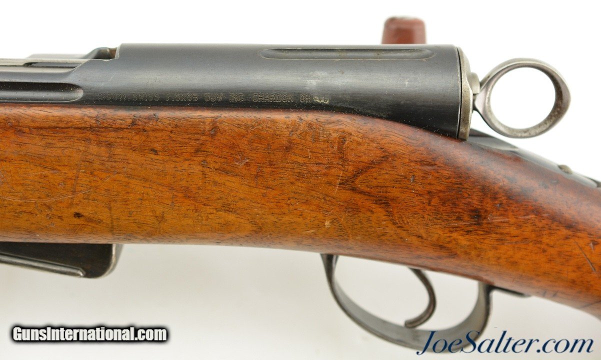 Description: Serial #306936, 7.5mm Swiss, 30 3/4" barrel with an excellent, bright bore. This rifle was made in 1904 and has matching numbers on the receiver, barrel, bolt, magazine, and buttplate, with the metal retaining 80-85% of the original blue finish that has silvered at the muzzle, faded to mottled gray along the high edges and projections, and also has a mild plum-brown patina starting to form on some spots as well. The bolt has a mostly bright gray patina, and the red-brown resin handle is intact. An import mark is present on the left side of the receiver. The wooden stock and handguard have an armory added finish over numerous small handling marks and minor blemishes throughout with a soft, but still visible, Swiss cartouche on the right side of the buttstock. Additional numbers are stamped onto the comb just ahead of the buttplate tang: "129043" and "6 (in circle)." An original steel and brass muzzle cover is also included. This is a very good-near fine example of a modernized, pre-Model 1911 Schmidt-Rubin, and would make a splendid addition to any collection of 20th century military rifles. FFL or C&R; Curio/Relic: Yes Price: $850.00 Contact Seller |