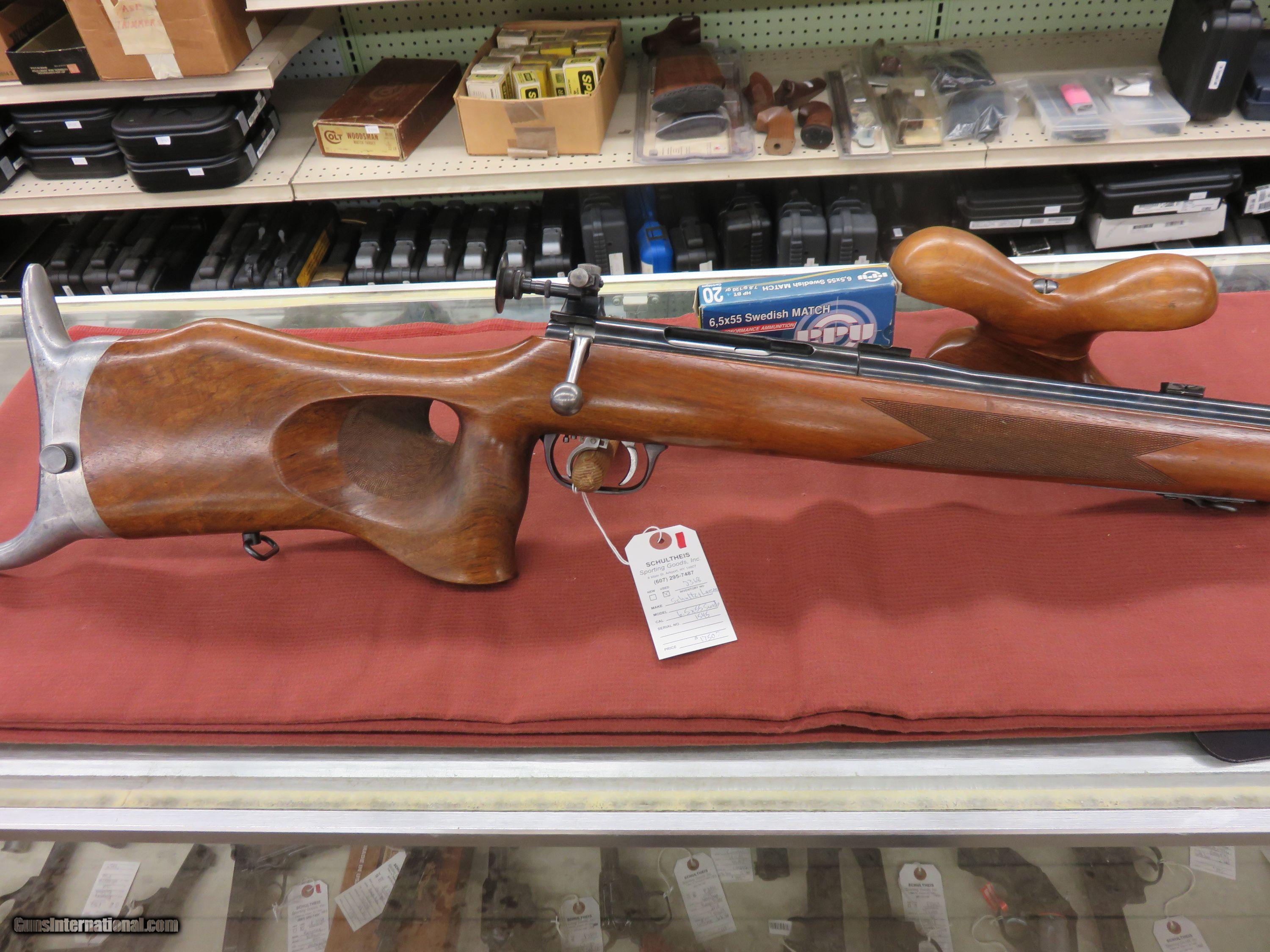 Description: Schltz & Larsen Single Shot 6.5x55 Swede. 28" heavy barrel. Globe front and rear peep sights of unknown maker. Thumbhole stock. weighs 14 lbs. 10 oz. Scope target blocks. Excellent overall. SOLD Curio/Relic: Yes |