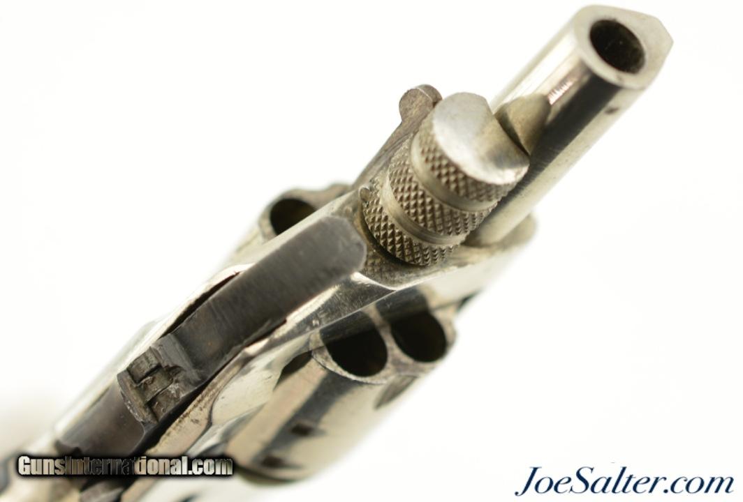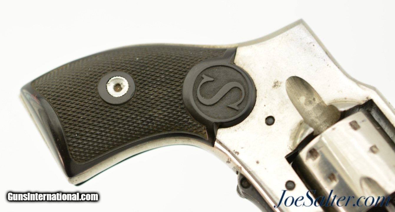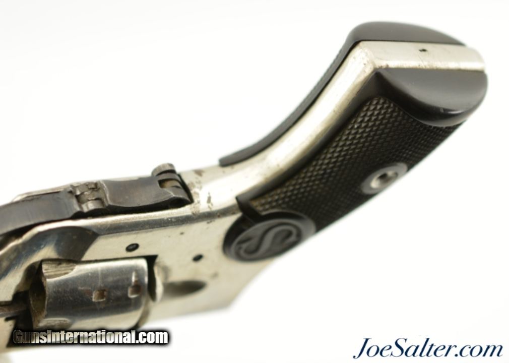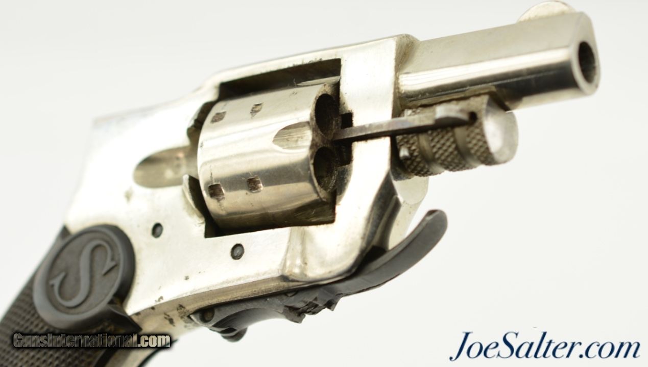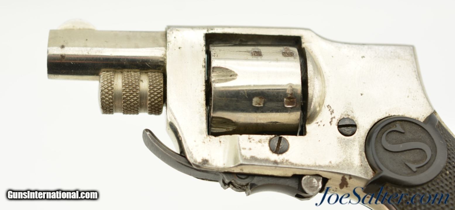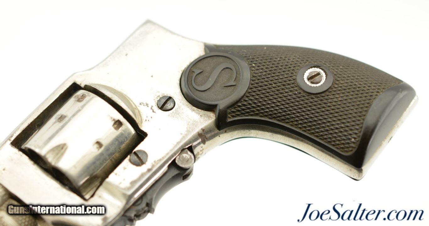 Description: Serial #356, .22 Short, 1 3/8 inch barrel with a near excellent bore. This is the Model 1916 "Baby Hammerless" revolver manufactured in Philadelphia by R.F. Sedgley, Inc. and is marked with a weak double Strike of "PATS. APRIL 5.10 / BABY HAMMERLESS / MODEL 1916" which is the early first type after the take over of the factory by Sedgley. In excellent condition this tiny double action retains virtually all 97-98% of the original nickel finish with slight drag lines and wear on the leading edges of the cylinder. The "S" hard rubber grips are in excellent condition. Mechanically it functions properly with a crisp trigger pull, proper timing and tight lock up but the firing pin has been taken out so that it does not fire. It looks like the firing pin can be re-attached but we cannot guarantee that it will function properly. An excellent, de-activated early example of the Sedgley Baby Hammerless. FFL or C&R SOLD Curio/Relic: Yes |