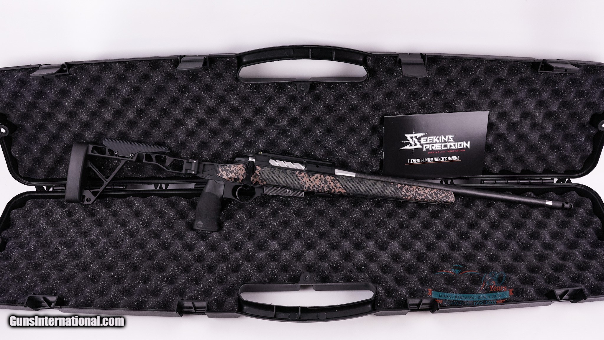 Description: Seekins Precision Element Hunter - 6.5 PRC - Factory New - Ultra Lightweight Seekins Element Hunter – Revolutionary Mountain Rifle – Under 6lbs This Seekins Precision Element Hunter in 6.5 PRC is in factory new condition and represents a revolutionary advancement in mountain hunting rifles. Weighing in at an incredible less than 6 pounds out of the box, this rifle redefines what's possible in a lightweight precision hunting platform. Specifically designed for the rugged, unforgiving terrain of Idaho's mountains, the Element Hunter combines cutting-edge technology with traditional hunting rifle ergonomics. At the heart of this rifle is Seekins' first carbon fiber barrel - a Seekins Mountain Contour 20" carbon-wrapped 416R stainless steel barrel with 1:8 twist rate optimized for heavy 6.5 PRC projectiles. The Element M3 action features a 60-degree bolt throw and 3-lug tool-less removable bolt for lightning-fast operation and easy maintenance. With the innovative Quick-Change Barrel Collar system, you can easily switch calibers to meet any hunting need, making this the most versatile mountain rifle ever created. Specifications