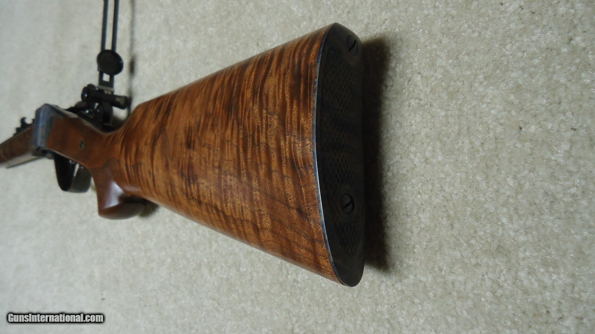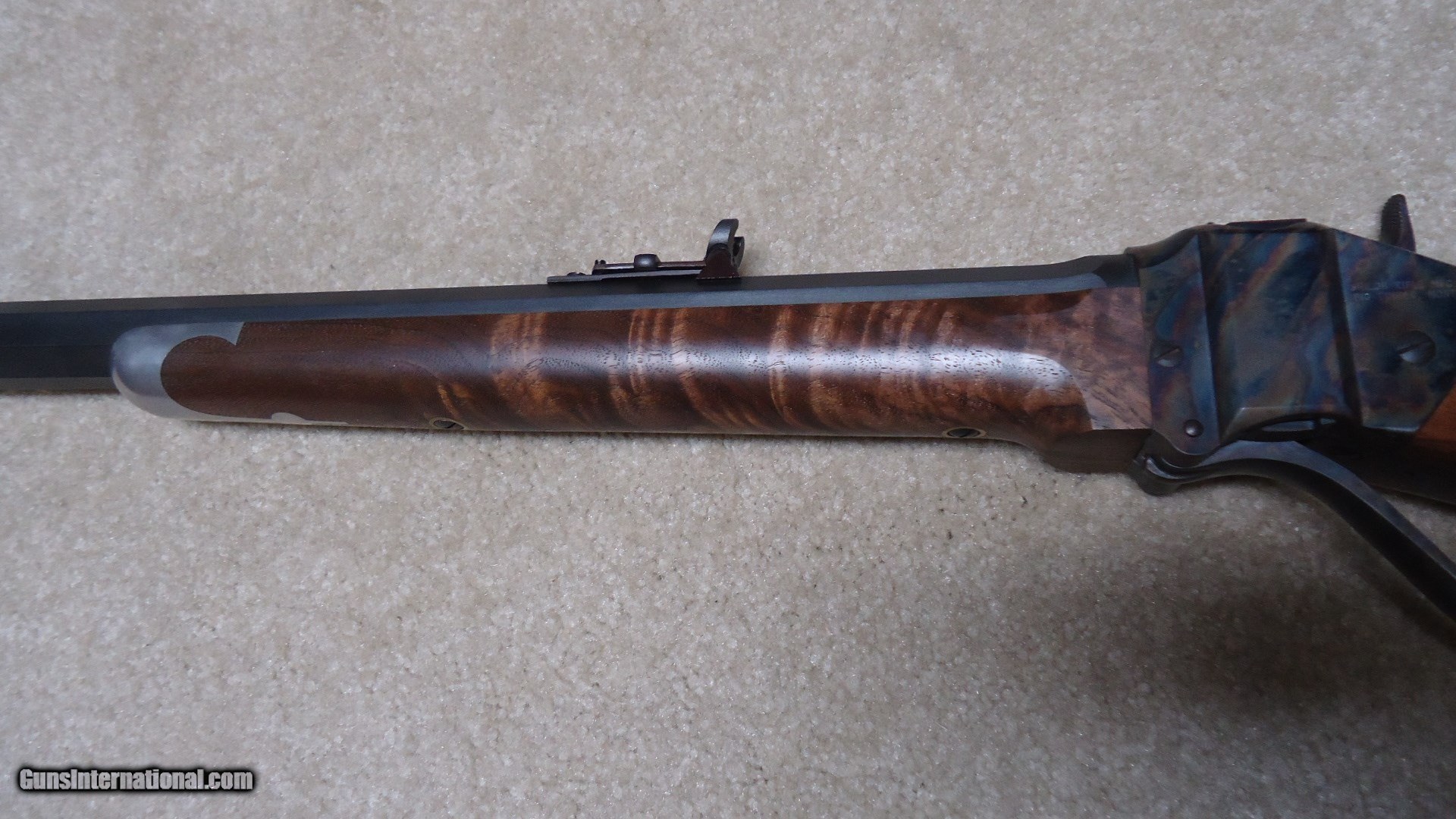 Description: A SHILOH SHARPS VERY SELDOM SEEN ON THE SECONDARY MARKET! THIS IS A LEFT HAND CHEEK PIECE, LONG RANGE EXPRESS RIFLE IN .45 CALIBER WITH 2.4” CASE (.45-90). This was a special order custom rifle delivered as a gift for a person who never fired it. Serial number is in the 37XXB range which puts it at about 2008. It has been in its original box ever since. It has a beautiful extra fancy walnut in the butt stock and forend that was hand selected for contrasting close-lined fiddleback grain structure. This Shiloh has a traditional checkered steel shotgun butt plate, left hand cheek piece, pistol grip, double set triggers, 34” standard octagon barrel with a full buckhorn Lawrence ladder rear sight plus an extra semi-buckhorn Lawrence rear sight and blade front sight, traditional pewter forend tip, brass escutcheons around the screws and is mounted with a Montana Vintage Arms long range Soule rear tang sight with a globe front sight that will accept inserts. Weighs just under 12 lbs. This rifle would cost well over $3800 catalogue price plus require about a two year wait time. Price on this one is $3350. SOLD Manufacturer: Shiloh Rifle Mfg. Co., Big Timber, MT Model: 1874 LONG RANGE EXPRESS, LEFT HAND Serial Number: 37XX B Caliber Info: .45-90 Condition: ANIB Barrels: 34" STANDARD OCT. |
