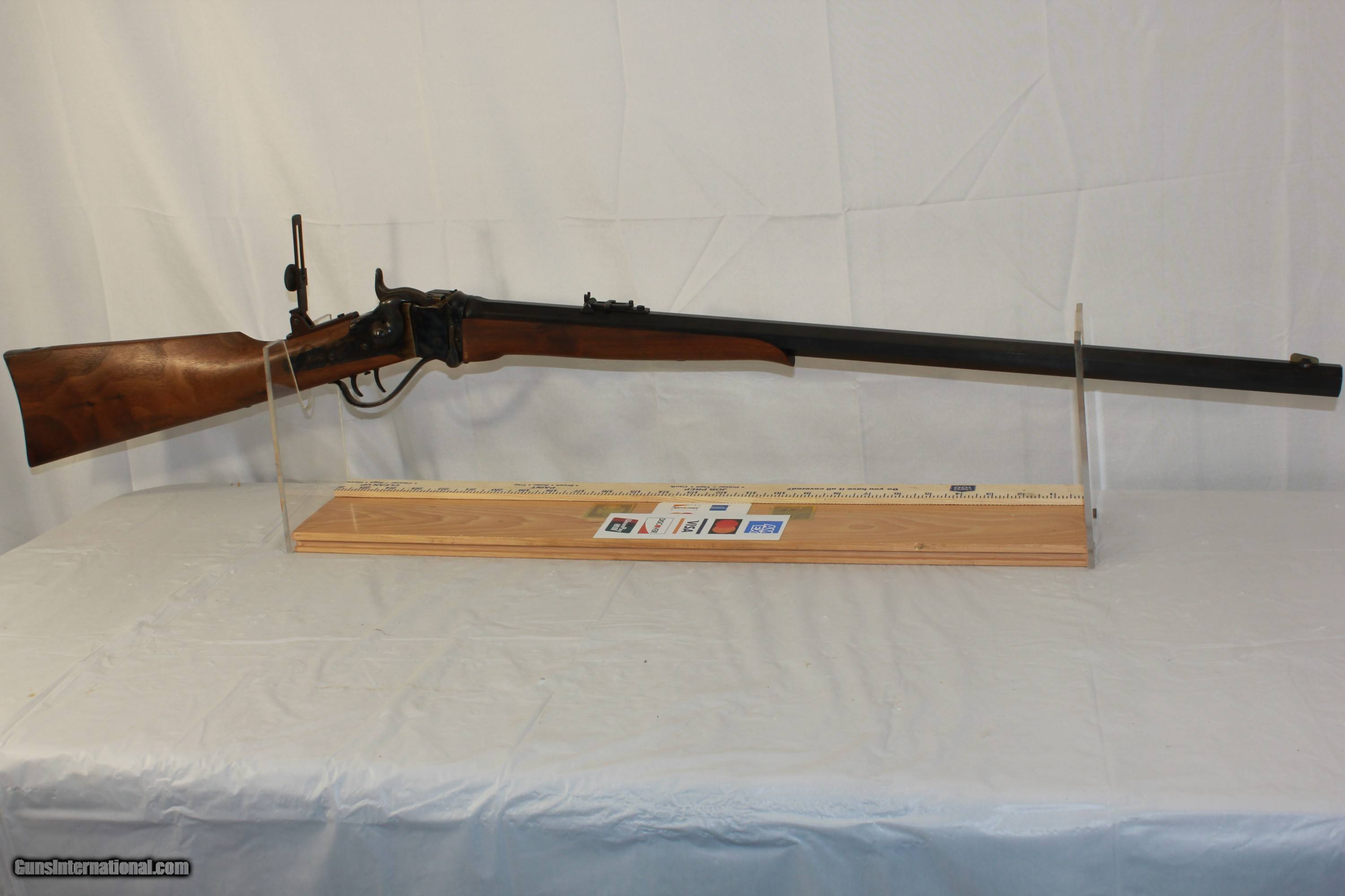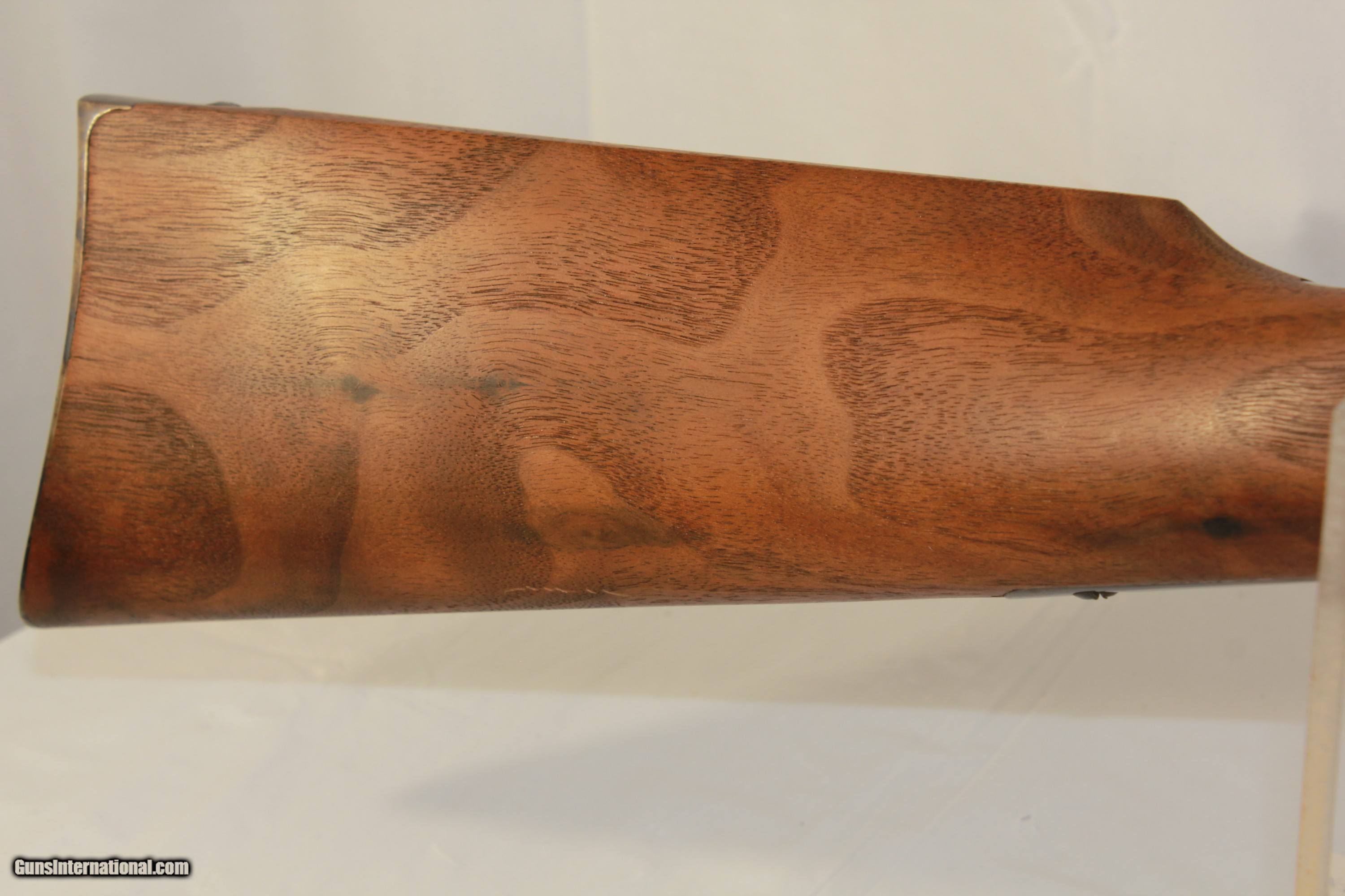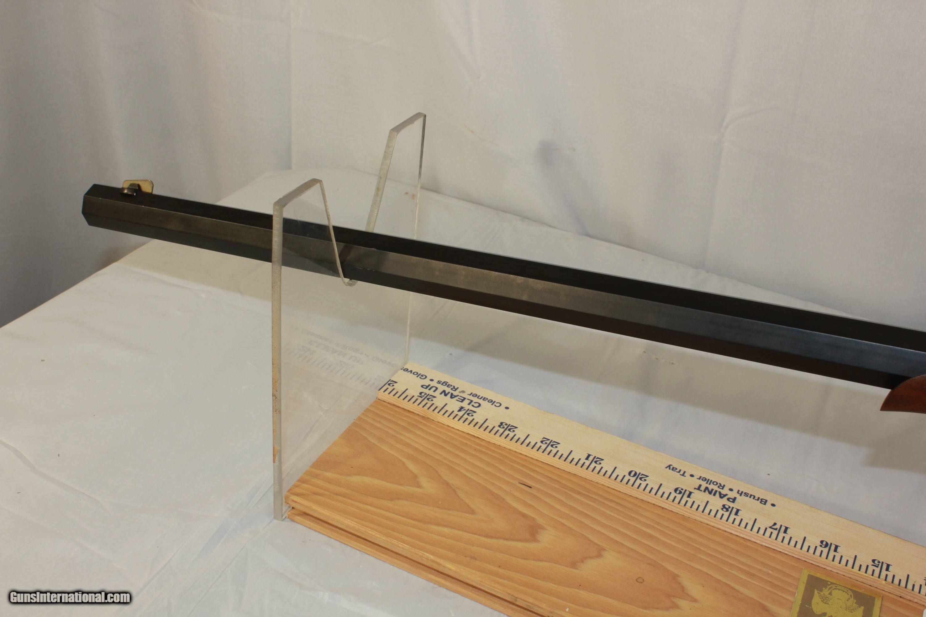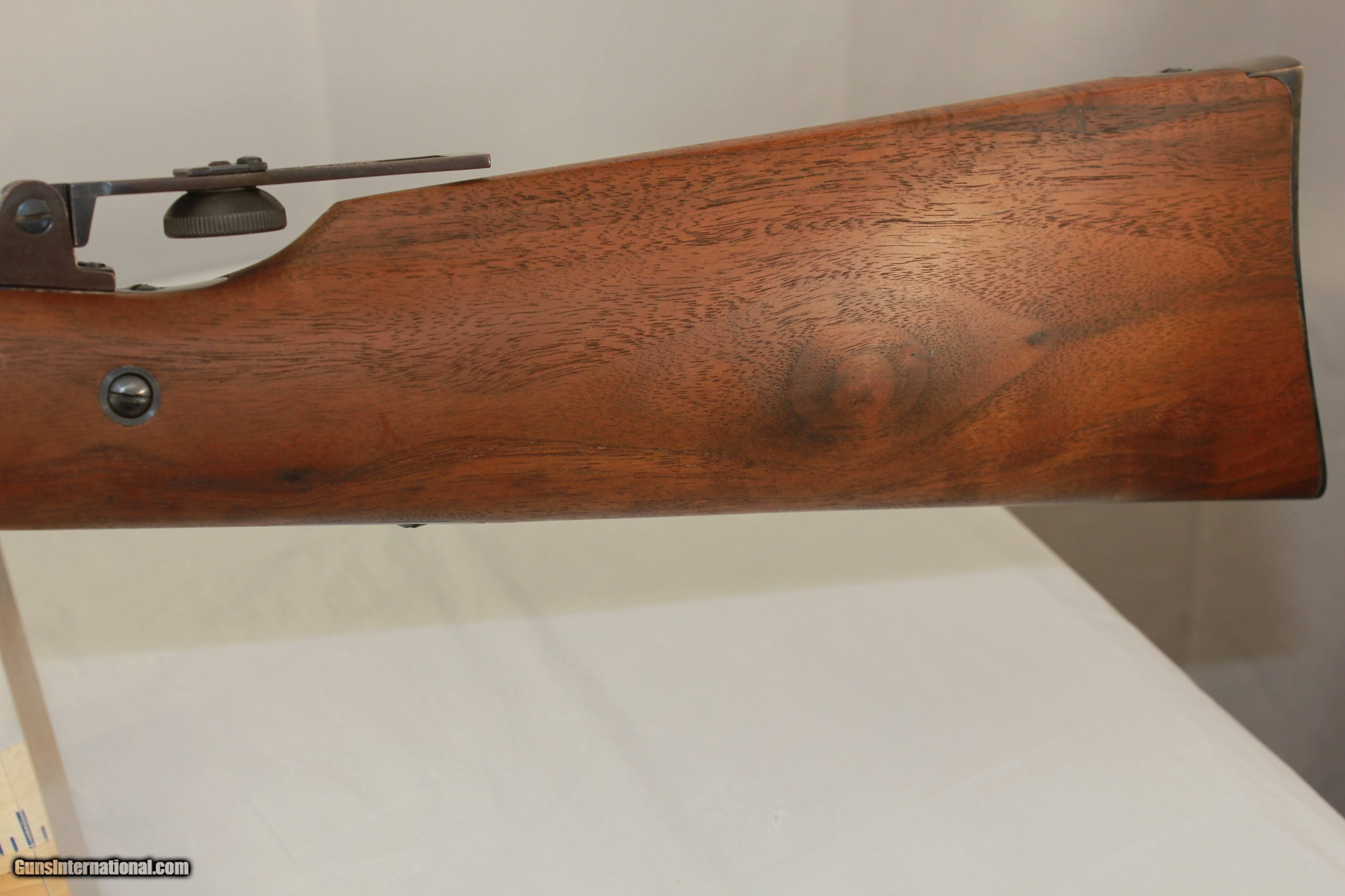 Description: This is a very early Model 1874 Sharps made in Farmingdale, NY before Shiloh moved to Big Timber, MT. It was made between 1976 and 1983. It is marked as were the original Sharps rifles with the "OLD RELIABLE" and"'CALIBRE 50/3 1/4". It is in excellent condition with the original finish and minimal handling marks. It has a 28 inch barrel with an as new bore. It had the ladder sight as well as a wrist peep sight. Very few gun of this chambering have been shot more than a few times. People never learned that you don't have to load all 140 grains of powder in the case. The case colors are almost as new as is the blueing. It has double set triggers. The stock is from a quarter sawn blank that has the grain running up and down through the wood, which is the best for strength, but is rare because of the waste in wood for stock blanks. $75.00 shipping via Priority Mail SOLD |