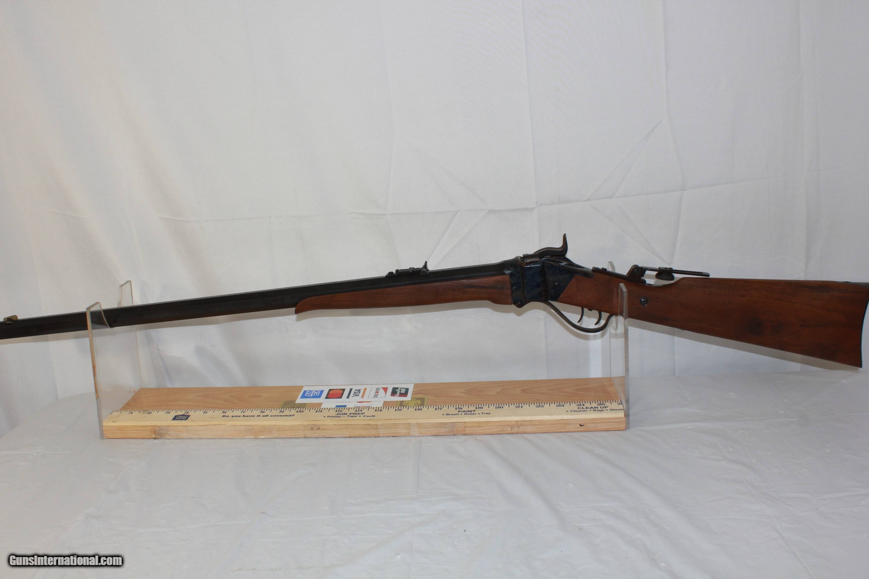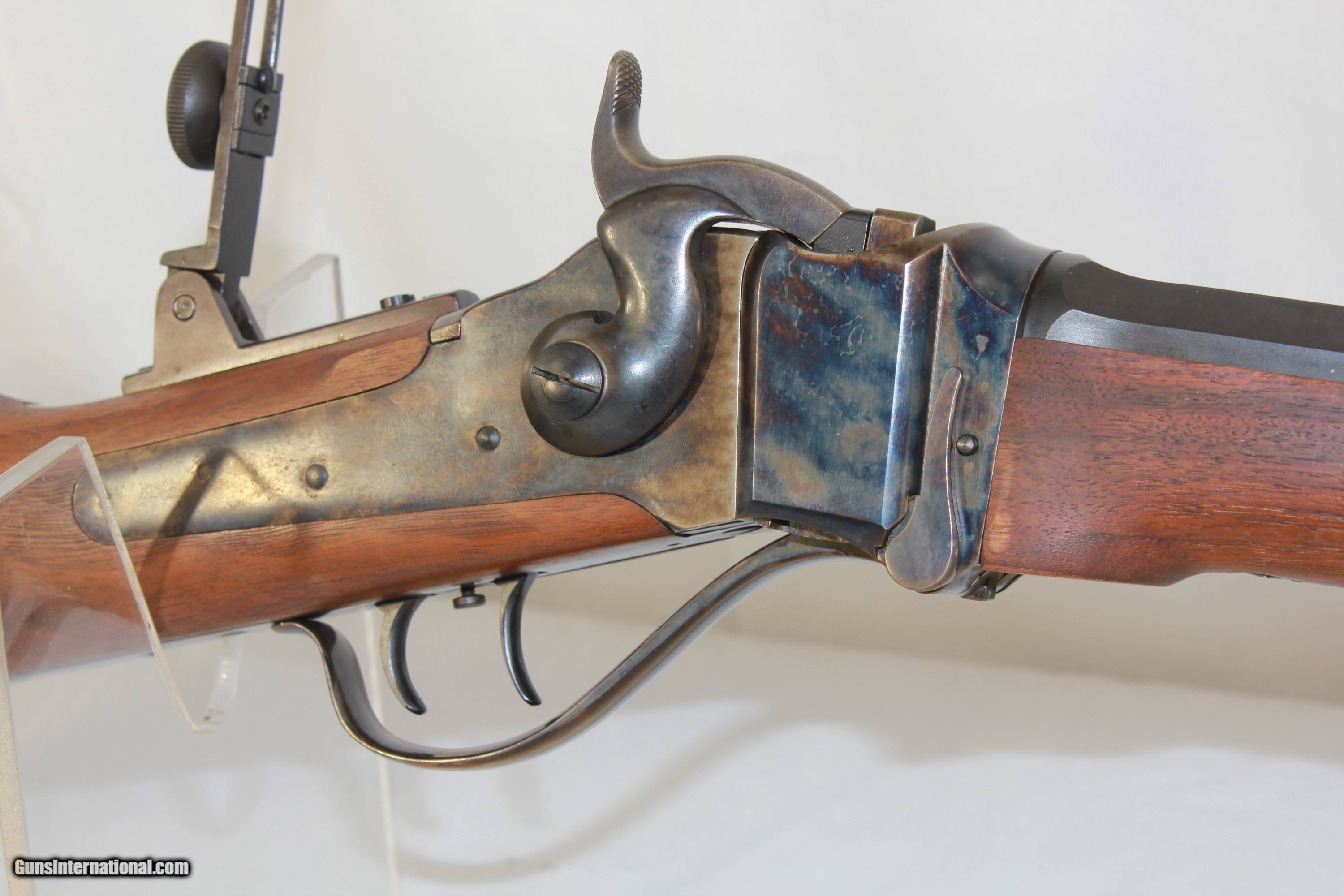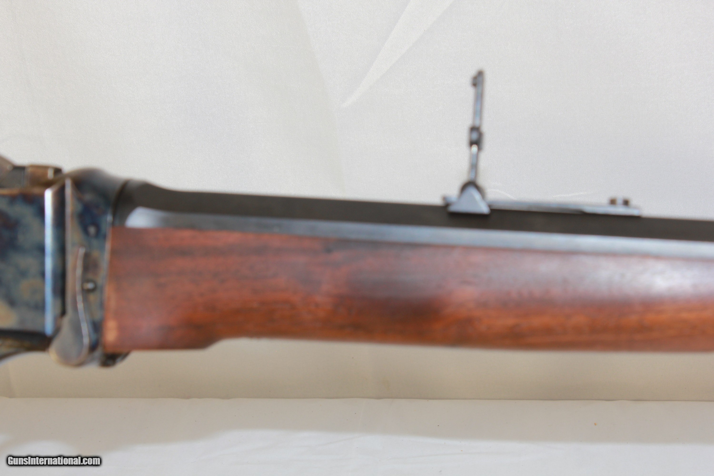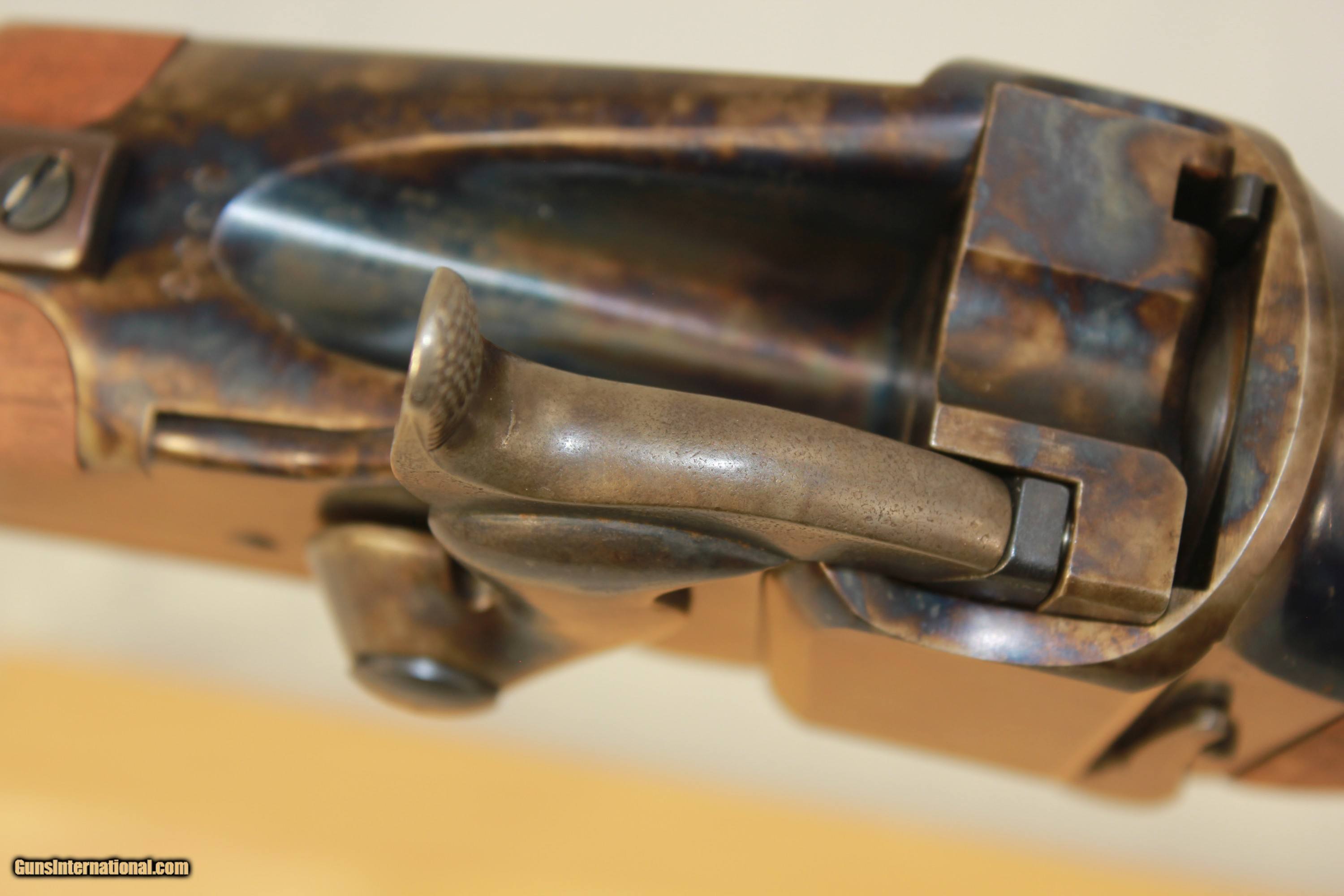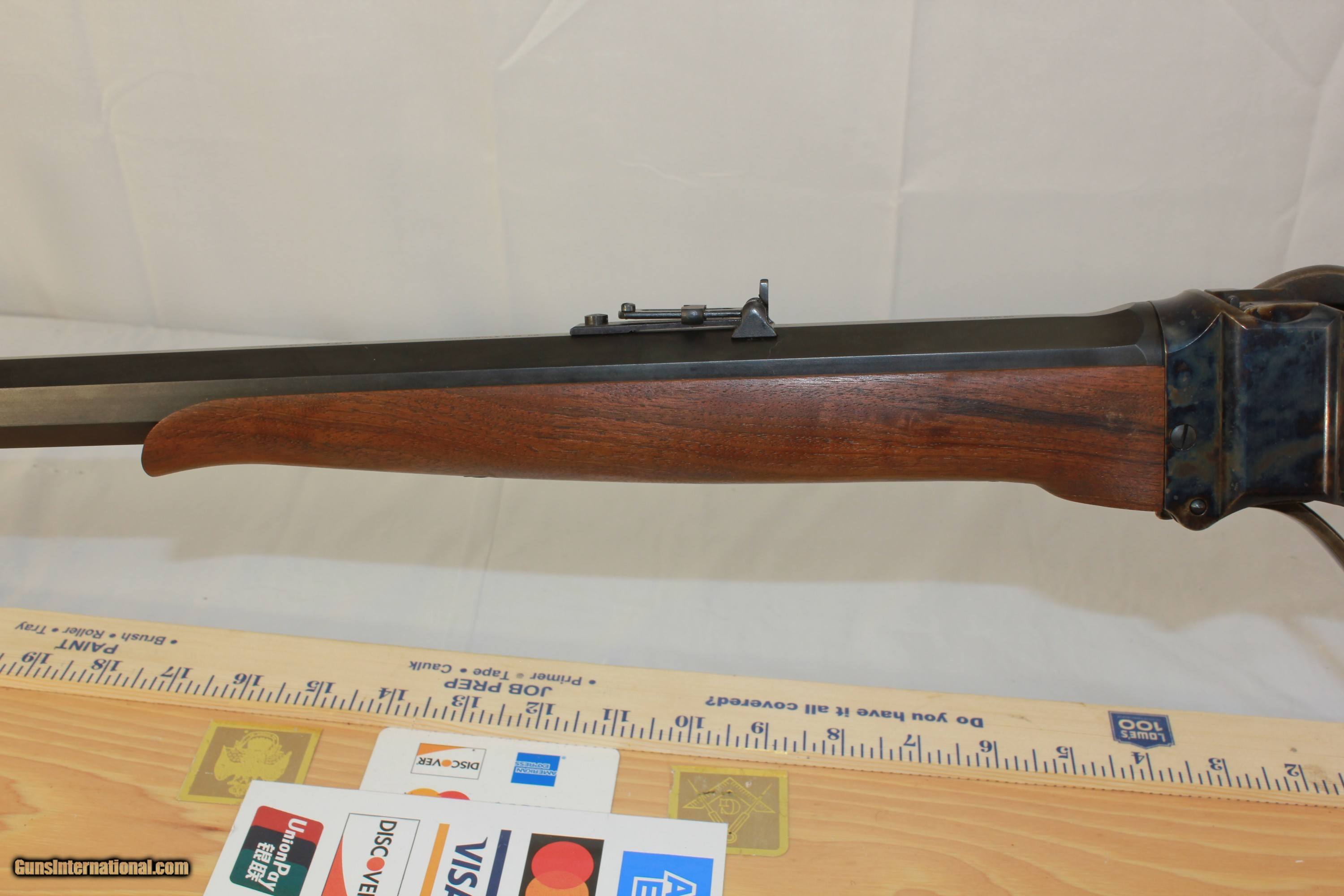 Description: This is a very early Model 1874 Sharps made in Farmingdale, NY before Shiloh moved to Big Timber, MT. It was made between 1976 and 1983. It is marked as were the original Sharps rifles with the "OLD RELIABLE" and"'CALIBRE 50/3 1/4". It is in excellent condition with the original finish and minimal handling marks. It has a 28 inch barrel with an as new bore. It had the ladder sight as well as a wrist peep sight. Very few gun of this chambering have been shot more than a few times. People never learned that you don't have to load all 140 grains of powder in the case. The case colors are almost as new as is the blueing. It has double set triggers. The stock is from a quarter sawn blank that has the grain running up and down through the wood, which is the best for strength, but is rare because of the waste in wood for stock blanks. $75.00 shipping via Priority Mail SOLD |