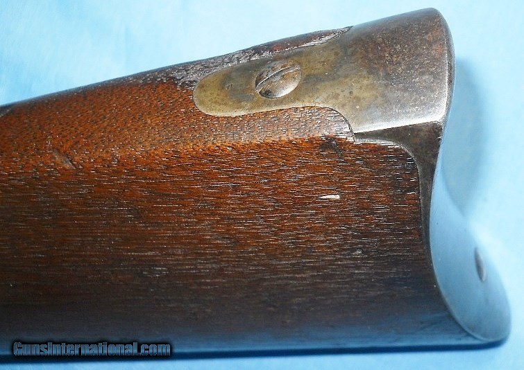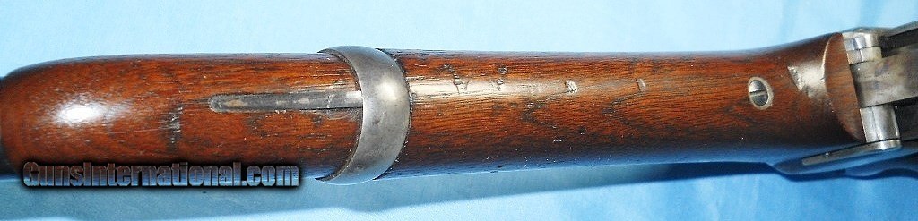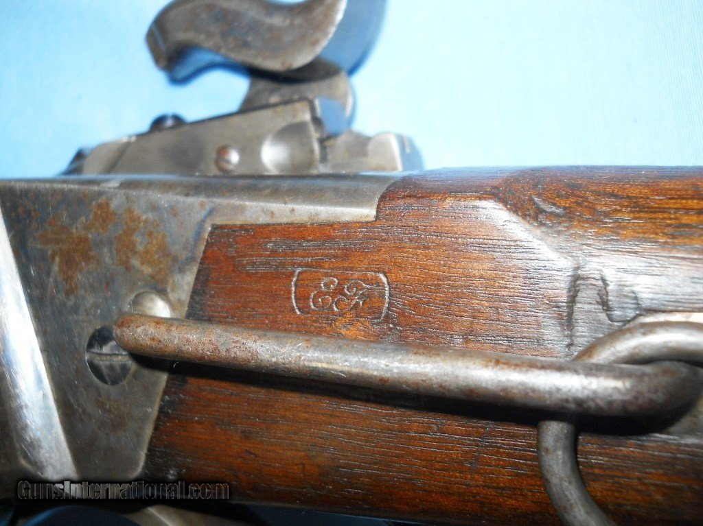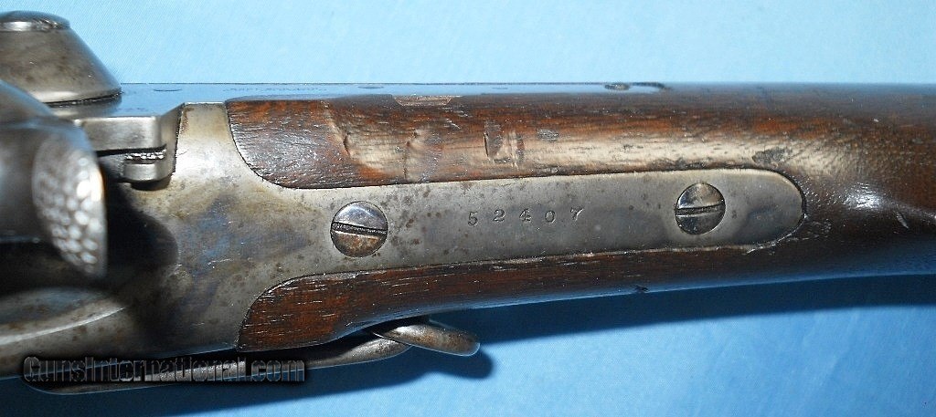 Description: ANTIQUE INDIAN WARS ERA .50-70 CALIBER SHARPS SADDLE RING CARBINE SERIAL #52407, MATCHING NUMBERS. 22" BARREL EXCELLENT BRIGHT STRONG BORE 3 GROOVE RIFLING. BARREL HAS ABOUT 90% ARSENAL BLUE, WEAR AT MUZZLE & FEW RUB AREAS. CASE COLOR METAL PARTS RETAIN EXTRAORDINARY AMOUNT OF VIVID COLORS WITH A LITTLE FRECKLING or STAIN. CORRECT FACTORY MARKINGS AND INSPECTORS MARKS ON VARIOUS PARTS "H"-"F"-"W"-"U"-"C"-"M"-ETC. MUCH BRIGHT FIRE BLUE REMAINS ON SCREWS AND OTHER PARTS THAT ARE FIRE BLUED. WALNUT STOCKS IN GREAT CONDITION, NO CRACKS, "EF" AND "DFC" RIBBON CARTOUCHES ARE STRONG. FINISH APPEARS TO BE ARSENAL ORIGINAL WITH EXPECTED DINGS & DENTS IN THE WOOD FROM THE AGES. ACTION WORKS AS NEW, CRISP & TIGHT. IT'S BEEN A LONG TIME SINCE I HAVE SEEN AN HONEST CARTRIDGE CONVERTED SHARPS CARBINE IN SUCH NICE CONDITION AND FAIRLY PRICED, AS PICTURED. S&H $45.00 DIRECT TO BUYER ALL 50 WHERE OK INCLUDES $500.00 INSURANCE ! QUESTIONS or ADDITIONAL PICS JUST ASK. PLEASE BE SPECIFIC WITH WHAT YOU WANT A PICTURE OF. SOLD Antique: Yes Serial Number: 52407 Caliber Info: .50-70 Bore: EXCELLENT Condition: FINE to EXCELLENT |