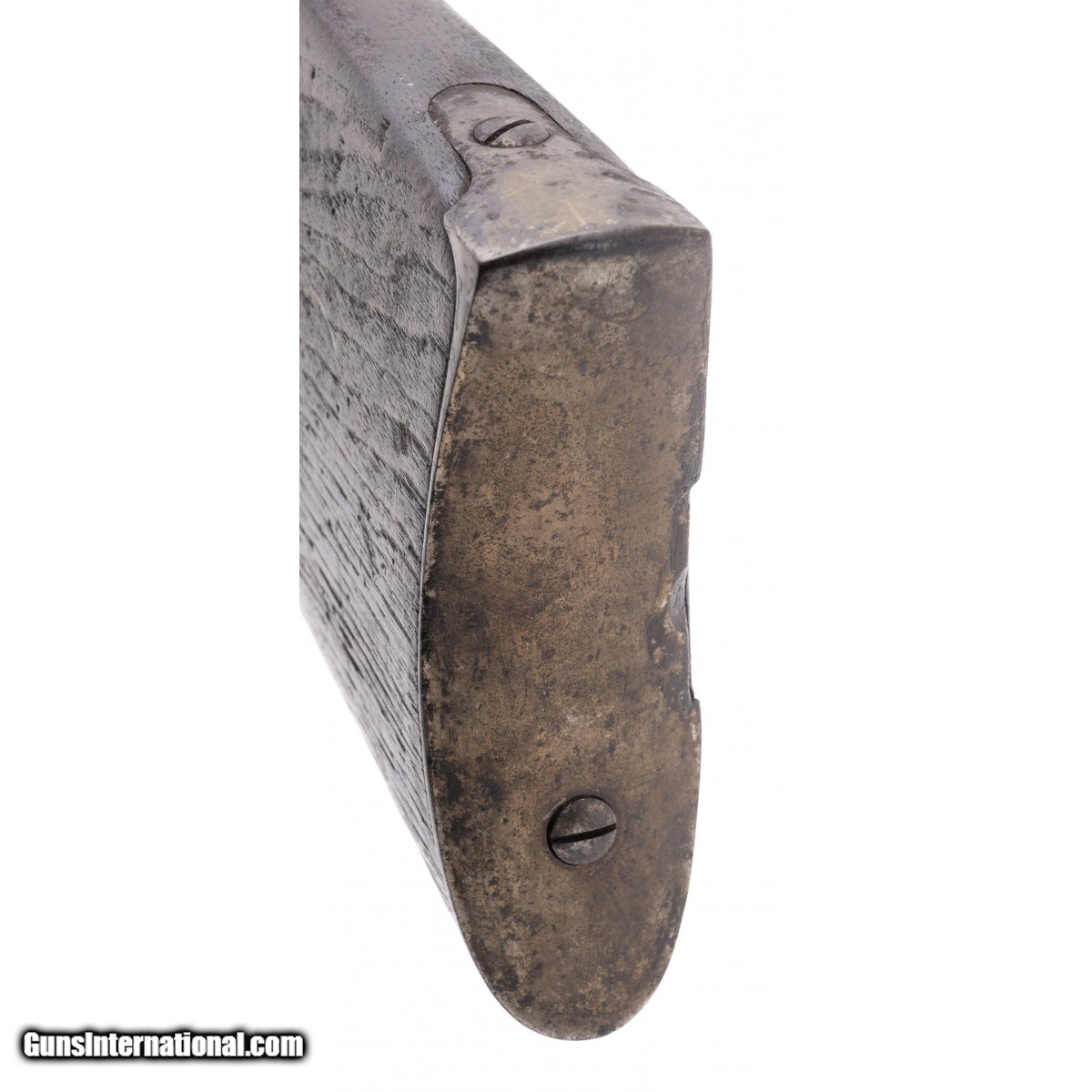 Description: " Serial No. 86458, made in 1863, 50-70, 21.5"" 3 lined grooved barrel. Barrel is a smooth grey patina with scattered discoloration visible throughout. Bore has frosting and pitting visible in the grooves, rifling still remains strong. Rear sight has been removed. Barrel is not screwed on all the way to the breech face. Receiver is a light grey patina with mottled dark patina present. Barrel band spring and screw are missing. Stock is in good condition with light handling wear visible. Action does function correctly. Consignment SOLD Antique: Yes |
